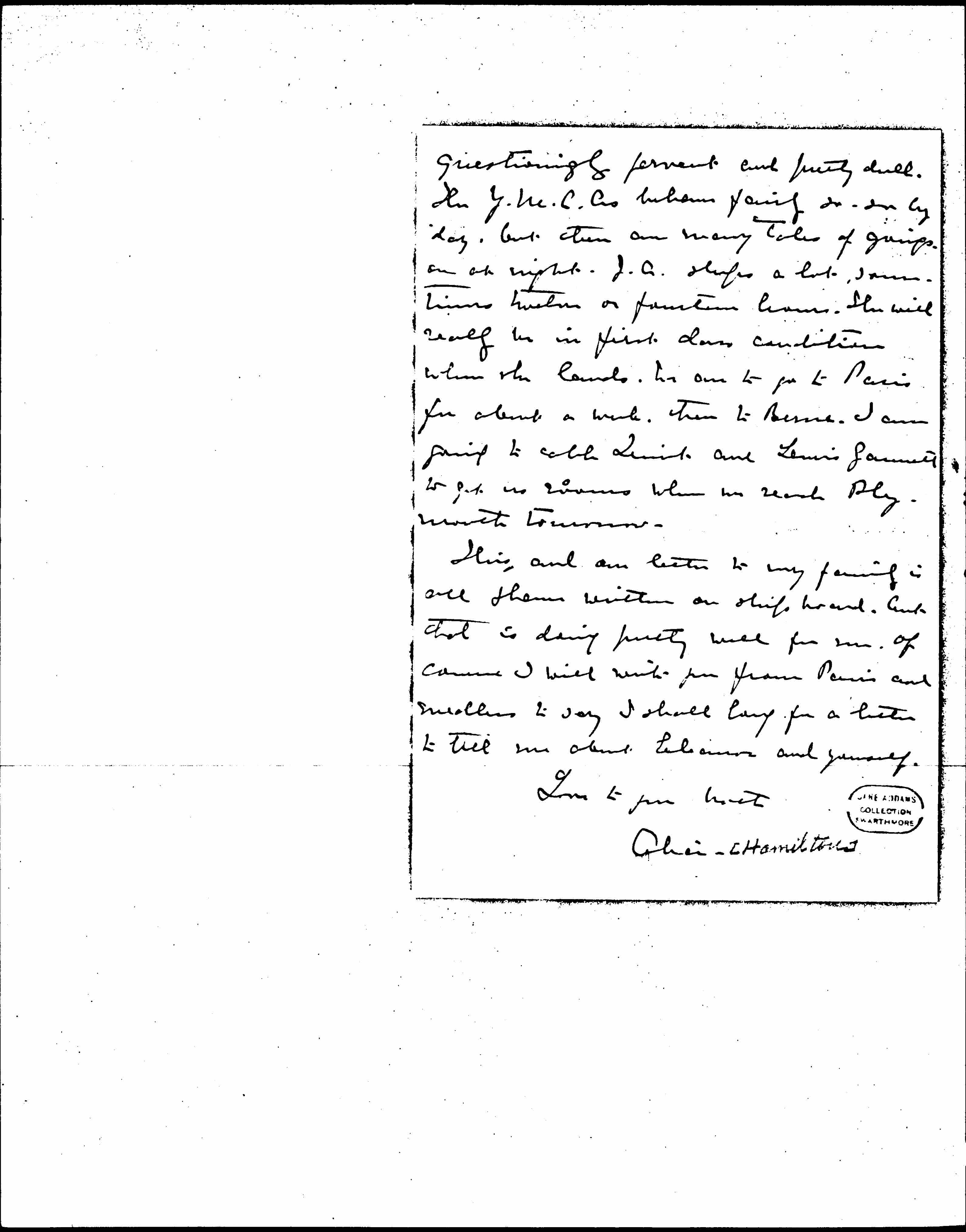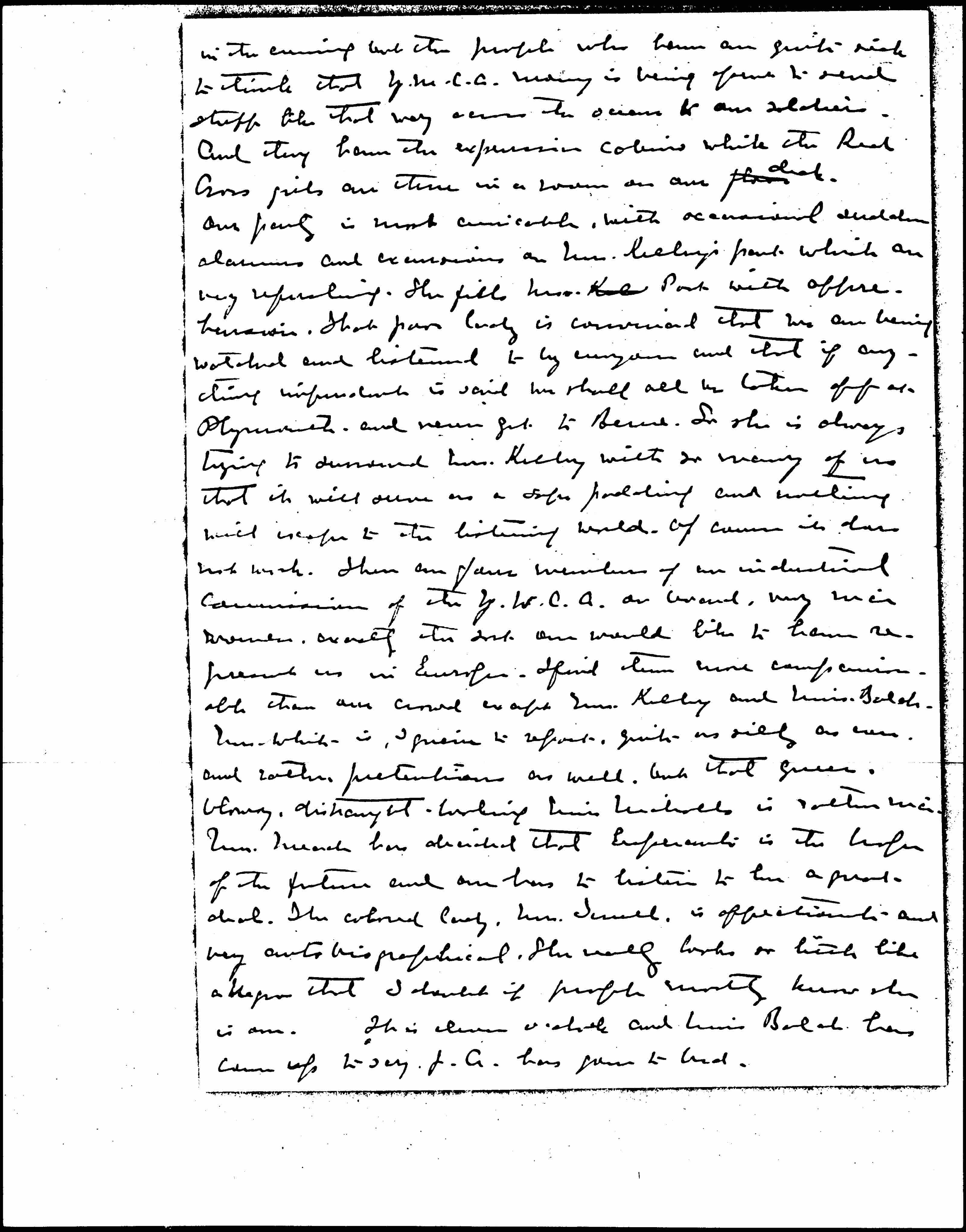 There were two roughish days but not bad and both of us have got on wonderfully, indeed it is much the easiest voyage I have ever had. The passengers are very chummy and it is difficult to read much on deck for they drop down beside one and talk. Besides Mrs. Kelley has come on board with a most appalling lot of manuscript which she insists on my reading, so I have only managed so far to read the two Walpoles and Eminent Victorians. Every night there is some sort of an entertainment but we go only when there are speakers and we think we must. Caroline Dudley, Dr. Dudley's youngest, is one of the Red Cross girls and I enjoy her. She is a radical young thing and quite refreshing for Eliot Wadsworth and Mrs. Draper are very unquestioningly [page 5] fervent and pretty dull. The Y.M.C.A.s behave fairly so so by day, but there are many tales of goings on at night. J. A. sleeps a lot, sometimes twelve or fourteen hours. She will really be in first class condition when she lands. We are to go to Paris for about a week, then to Berne. I am going to cable Quint and Lewis Gannett to get us rooms when we reach Plymouth tomorrow.