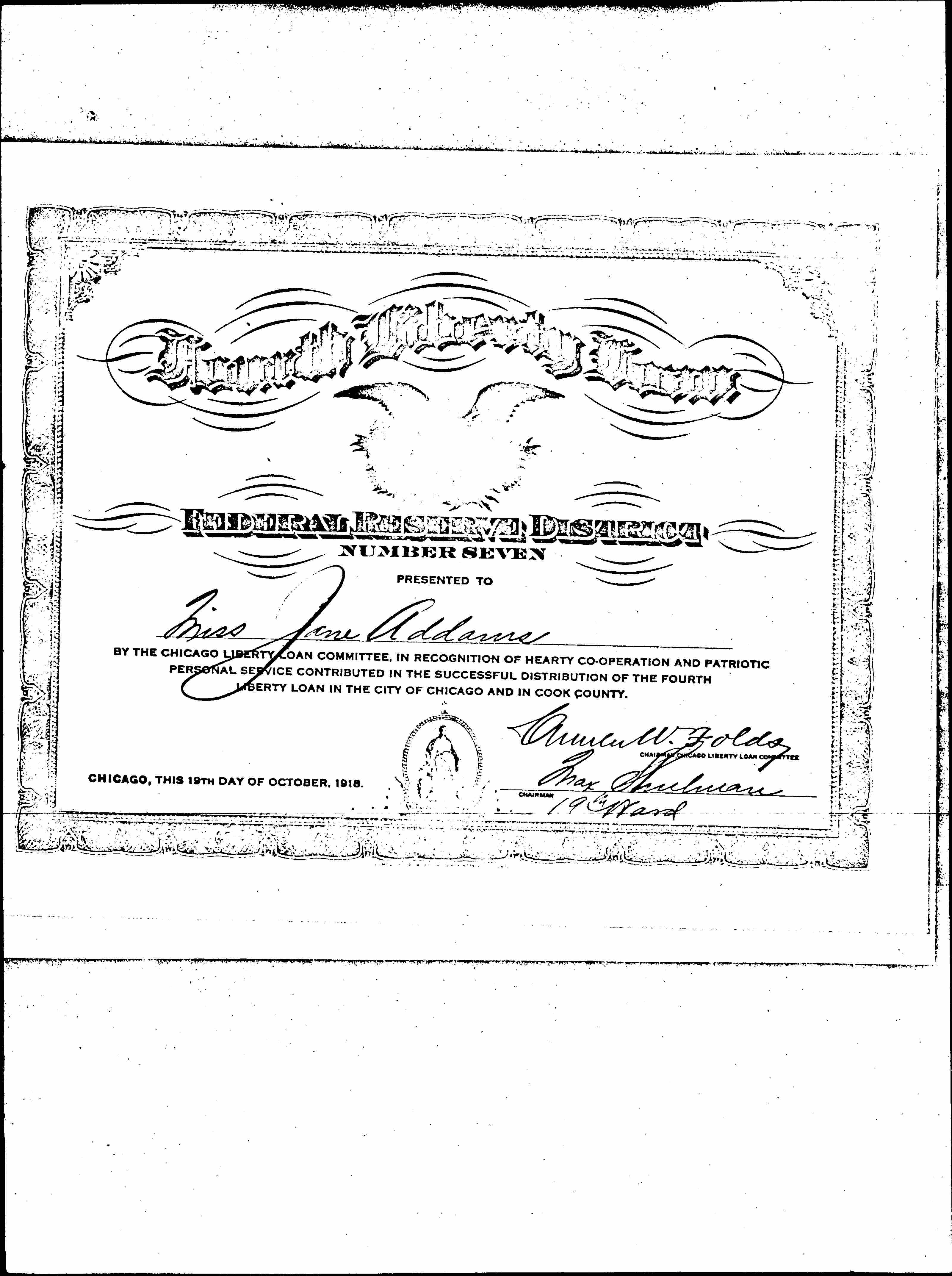 BY THE CHICAGO LIBERTY LOAN COMMITTEE, IN RECOGNITION OF HEARTY [COOPERATION] AND PATRIOTIC PERSONAL SERVICE CONTRIBUTED IN THE SUCCESSFUL DISTRIBUTION OF THE FOURTH LIBERTY LOAN IN THE CITY OF CHICAGO AND IN COOK COUNTY.