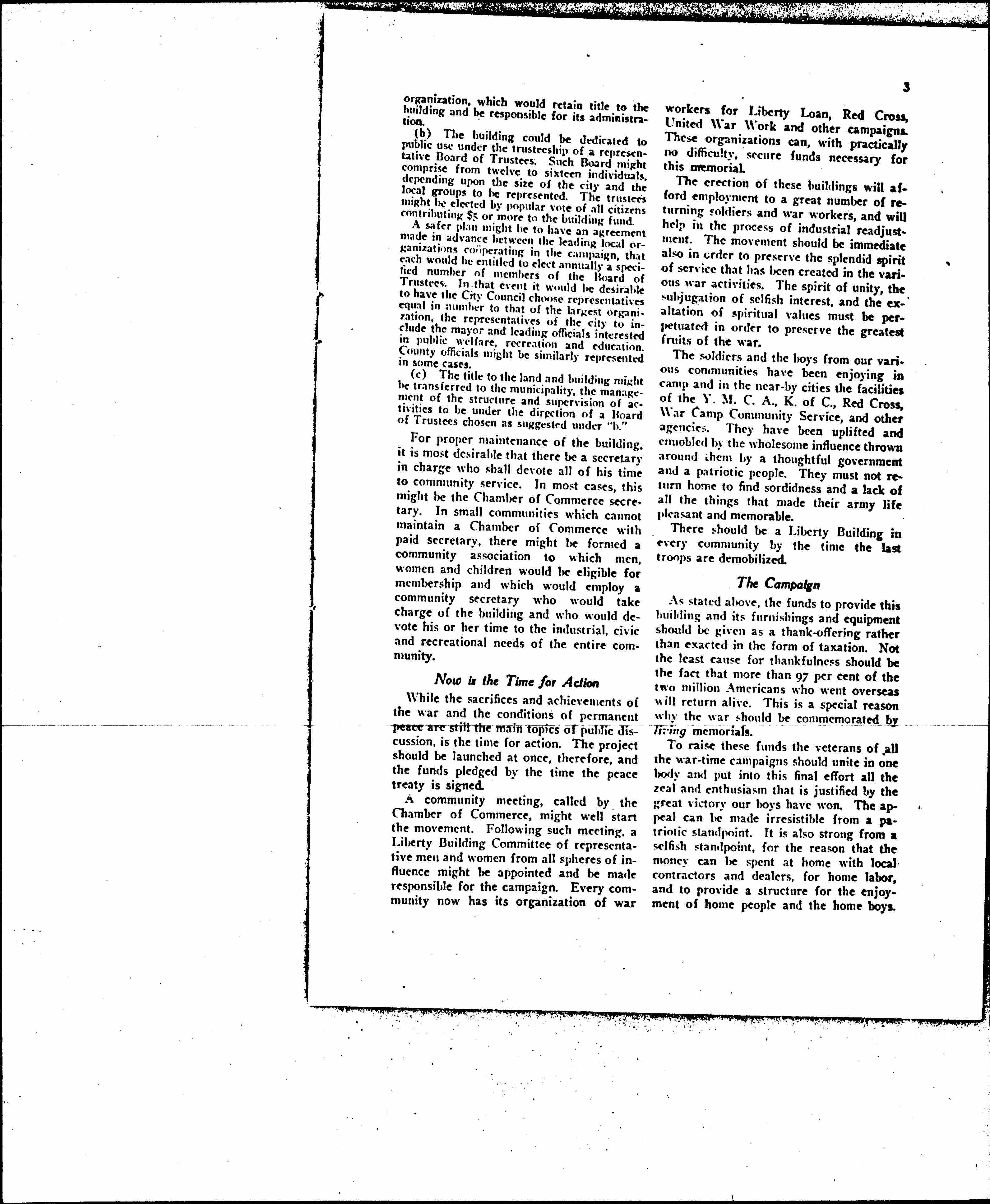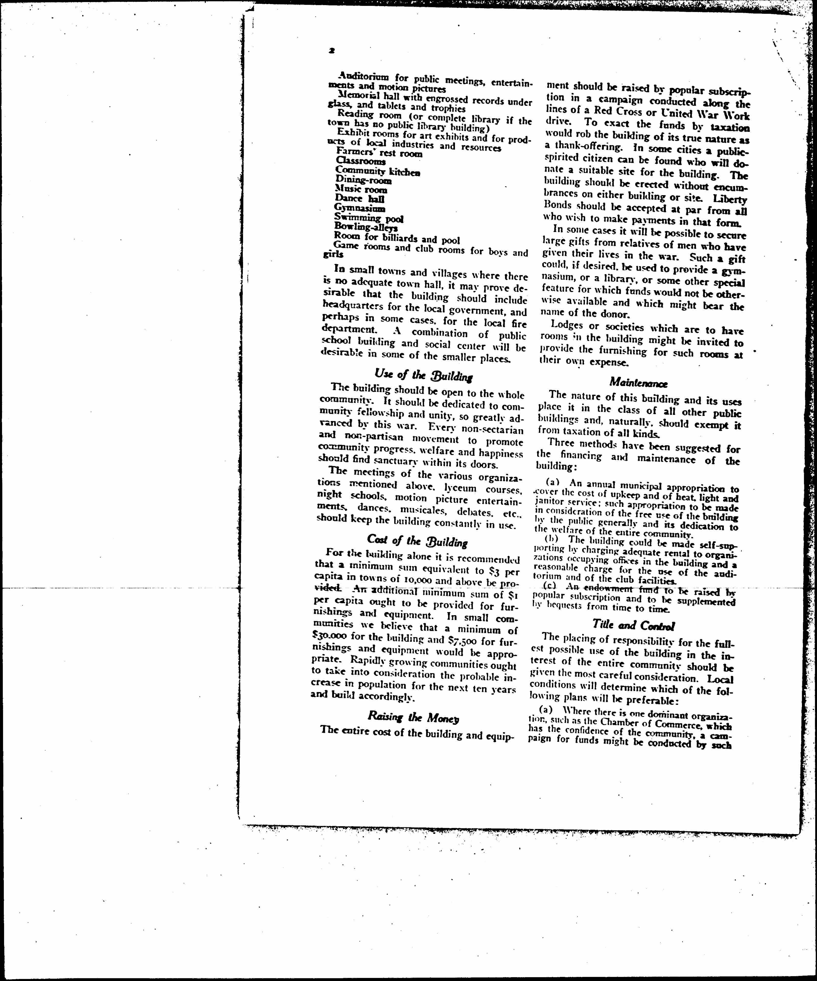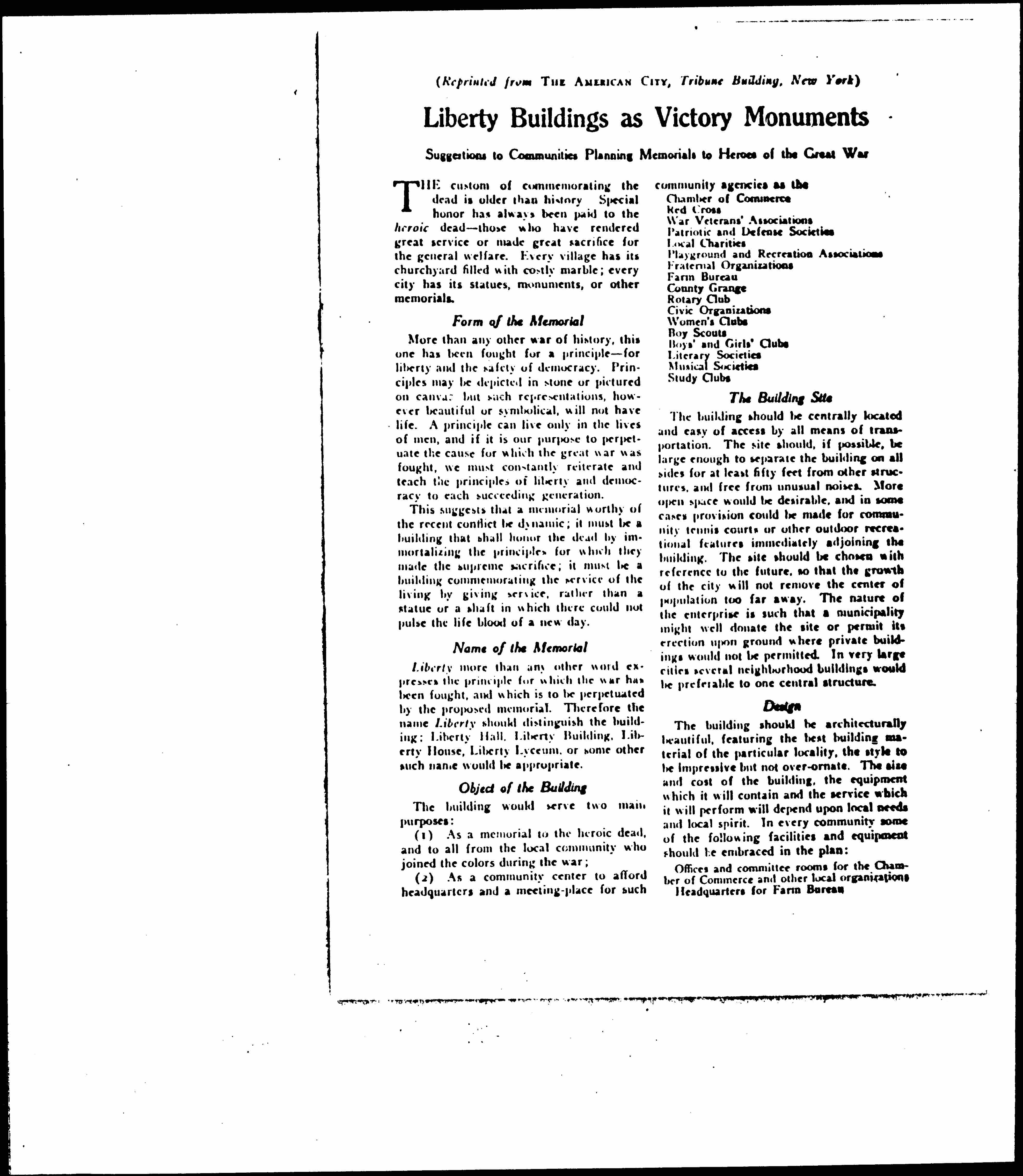 The suggestion has been made that we should construct "Liberty Buildings" as memorials to our soldiers, rather than spend the money for monuments of no usefulness and of questionable artistic merit. What could be better than such a memorial to those "who have made the world safe for democracy"? In the symbolism of its name there would be an appeal to the finest idealism of the community, while the building itself would afford the physical plant for the solution of the problems of the "days of adjustment to new conditions." [page 8]