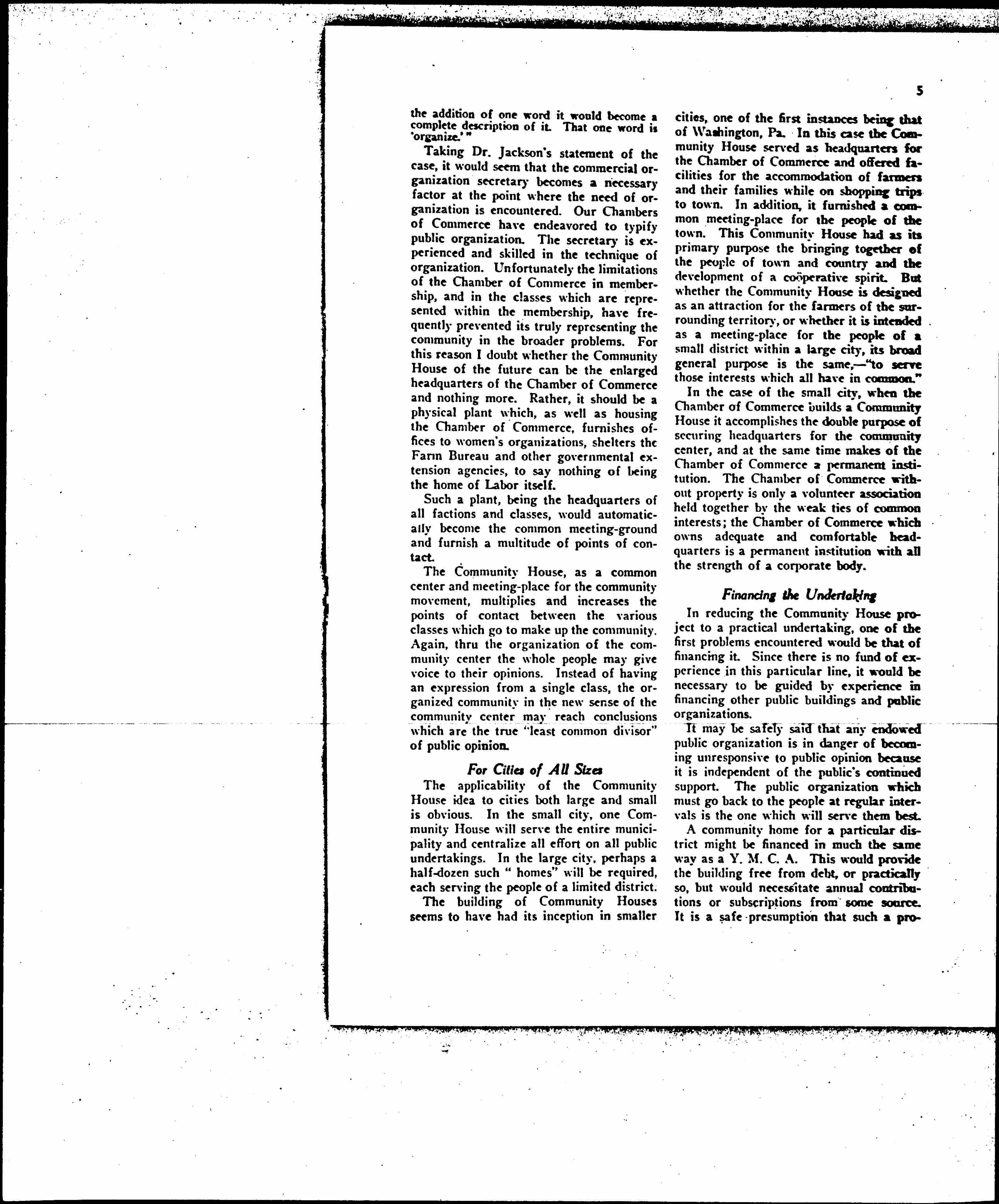 In the case of the small city, when the Chamber of Commerce builds a Community House it accomplishes the double purpose of securing headquarters for the community center, and at the same time makes of the Chamber of Commerce a permanent institution. The Chamber of Commerce without property is only a volunteer association held together by the weak ties of common interests; the Chamber of Commerce which owns adequate and comfortable headquarters is a permanent institution with all the strength of a corporate body.