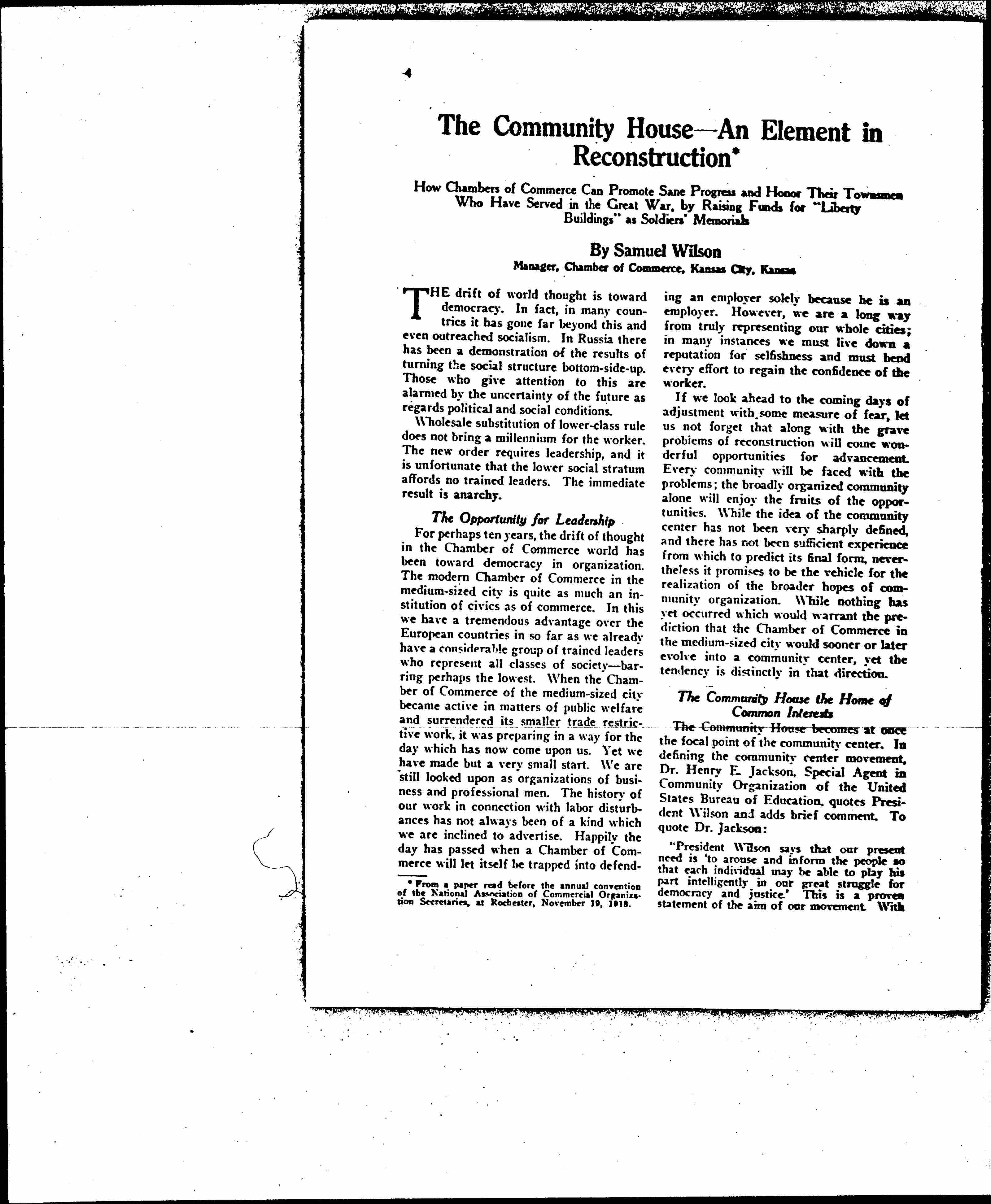 Industrial managers of America must find some middle ground between Prussianism in the handling of labor, and Bolshevism in being handled by it. The world is on fire with a new idea of liberty. Whether the excesses of extremists shall lead to reactionism, or whether it shall be a normal upward development, depends in great measure on "informing the people so that each individual may be able to play his part intelligently in our great struggle for democracy and justice." The Community House and the Community Center offer that bigger and broader agency [through] which the common people may be informed. The Community House may be the means of developing the Chamber of Commerce into a Chamber of the People.