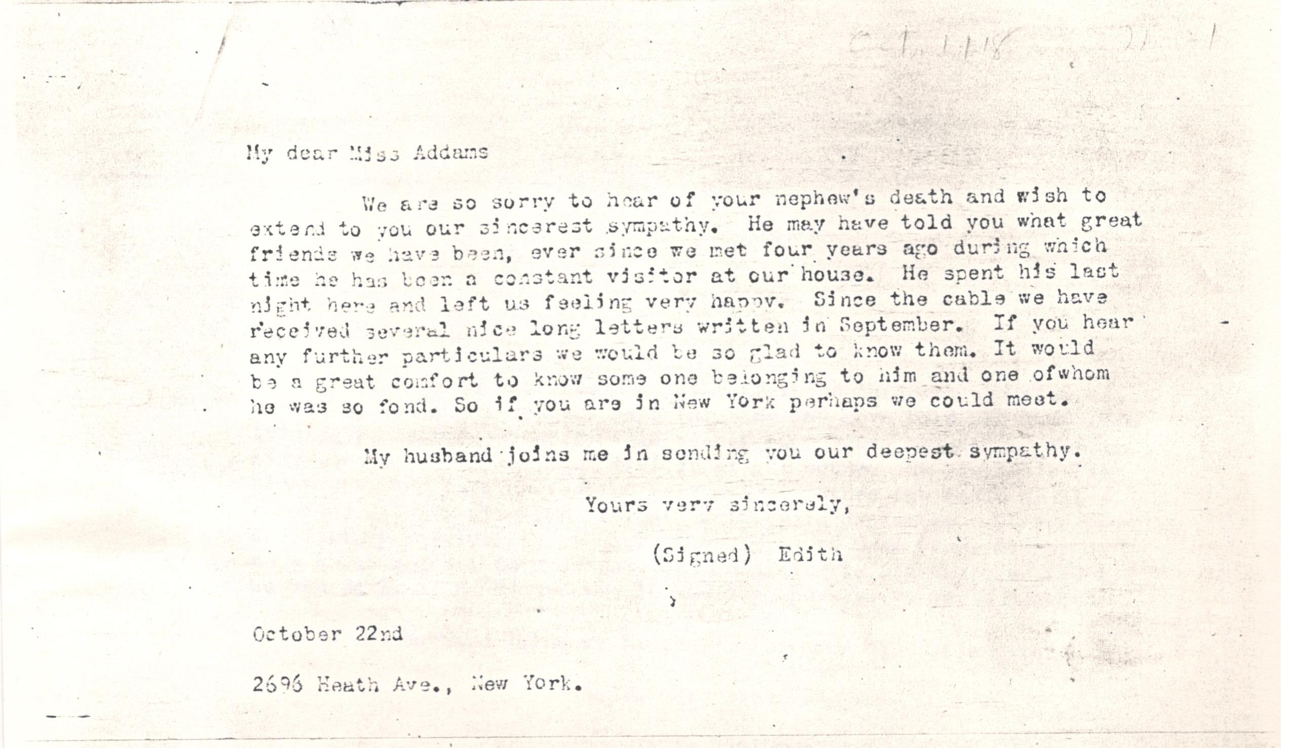 We are so sorry to hear of your nephew's death and wish to extend to you our sincerest sympathy. He may have told you what great friends we have been, ever since we met four years ago during which time he has been a constant visitor at our house. He spent his last night here and left us feeling very happy. Since the cable we have received several nice long letters written in September. If you hear any further particulars we would be so glad to know them. It would be a great comfort to know some one belonging to him and one of whom he was so fond. So if you are in New York perhaps we could meet.