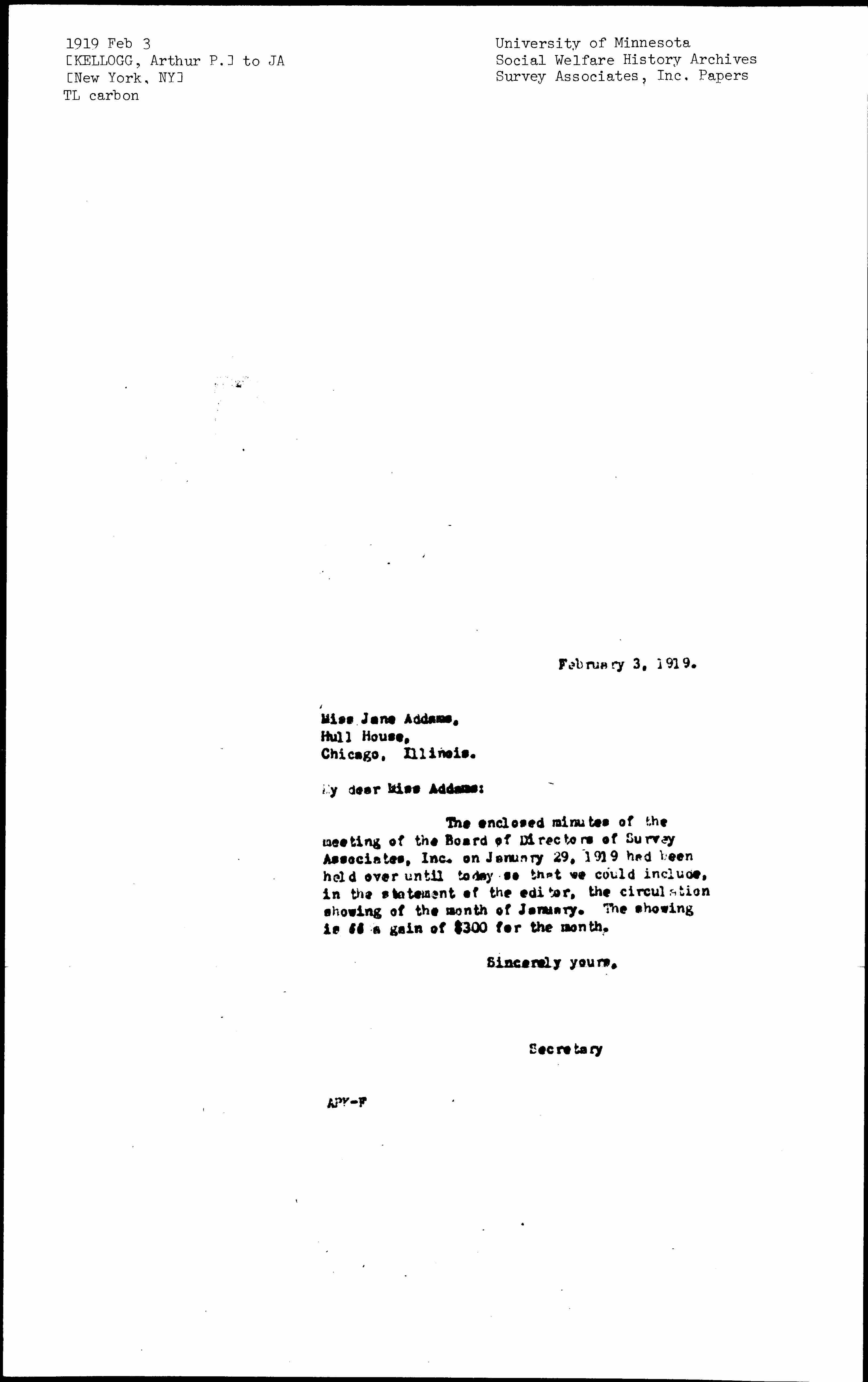 The enclosed minutes of the meeting of the Board of Directors of Survey Associates, Inc. on January 29, 1919 had been held over until today so that we could include, in the statement of the editor, the circulation showing of the month of January. The showing is [of] a gain of $300 for the month.