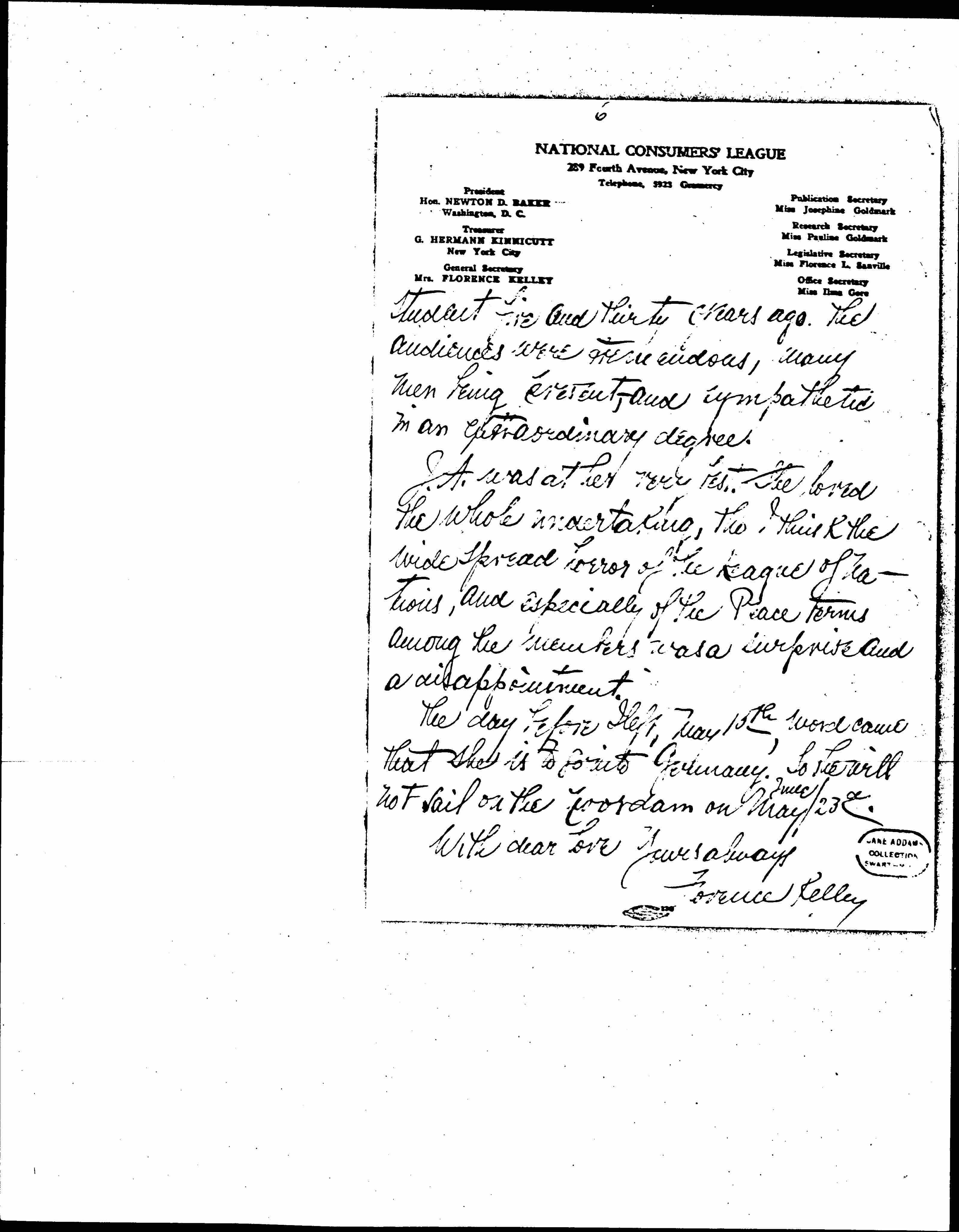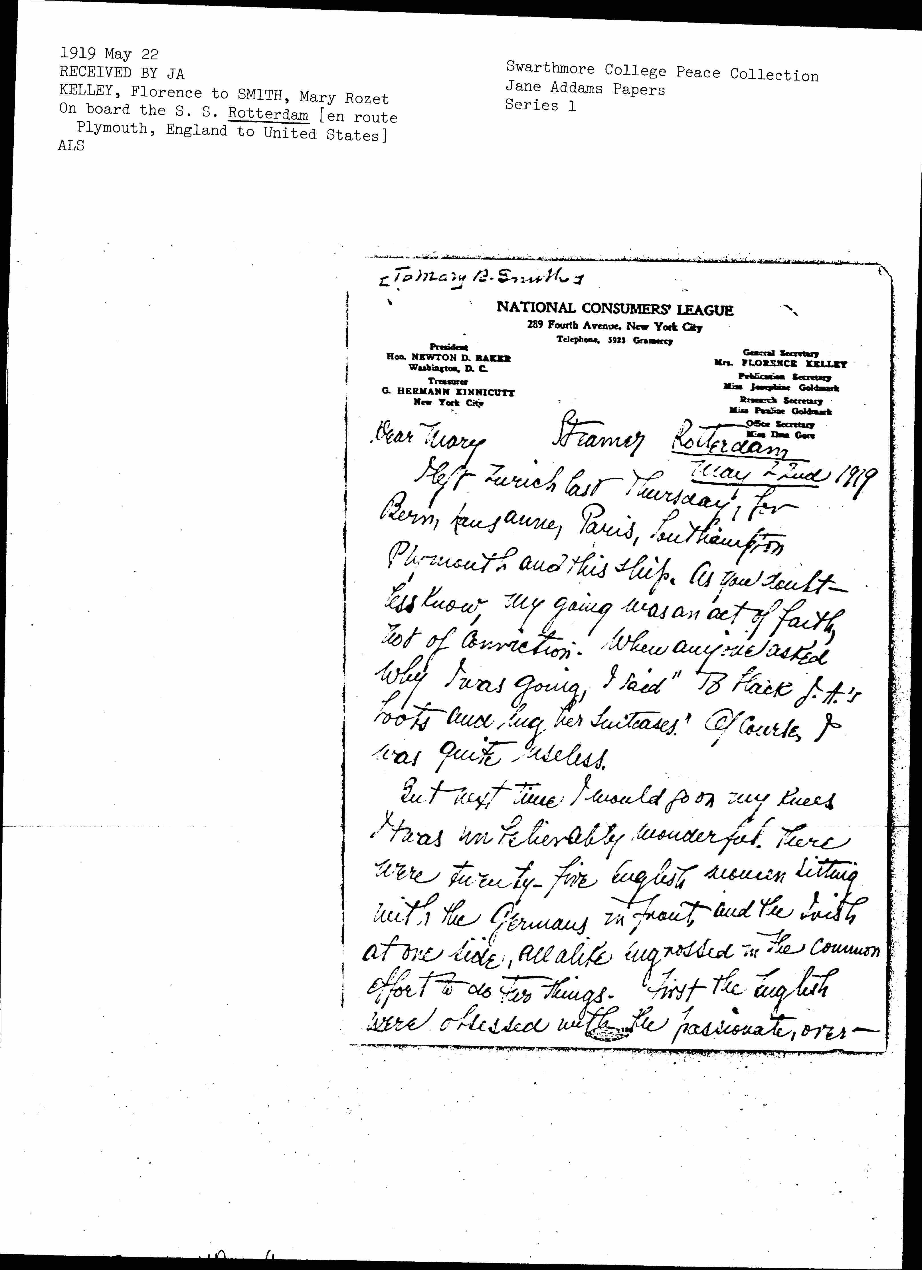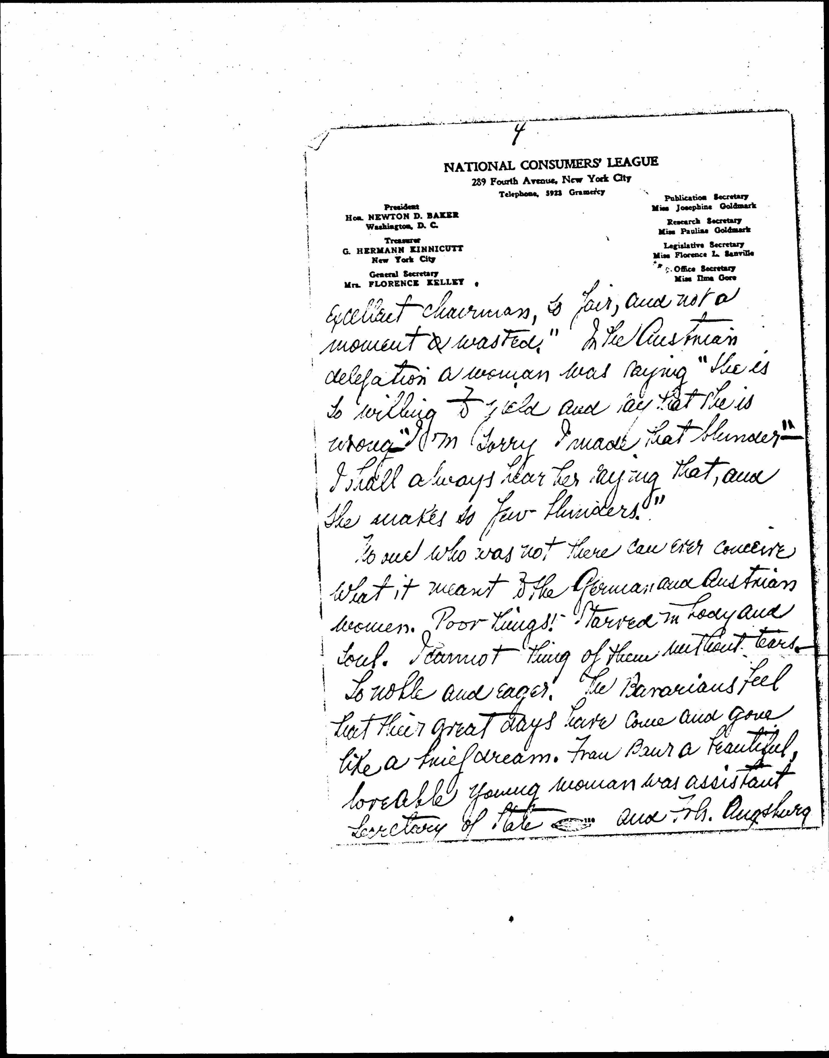 But next time I would go on my knees. It was unbelievably wonderful. There were twenty-five English women sitting with the Germans in front, and the Irish at the side, all alike engrossed in the common effort to do two things. First the English were obsessed with the passionate, overwhelming [page 2] impulse to lift the blockade, modify the peace, and end the famine; Second they wished greater power for women in the League of Nations, and many modifications in the provisions.