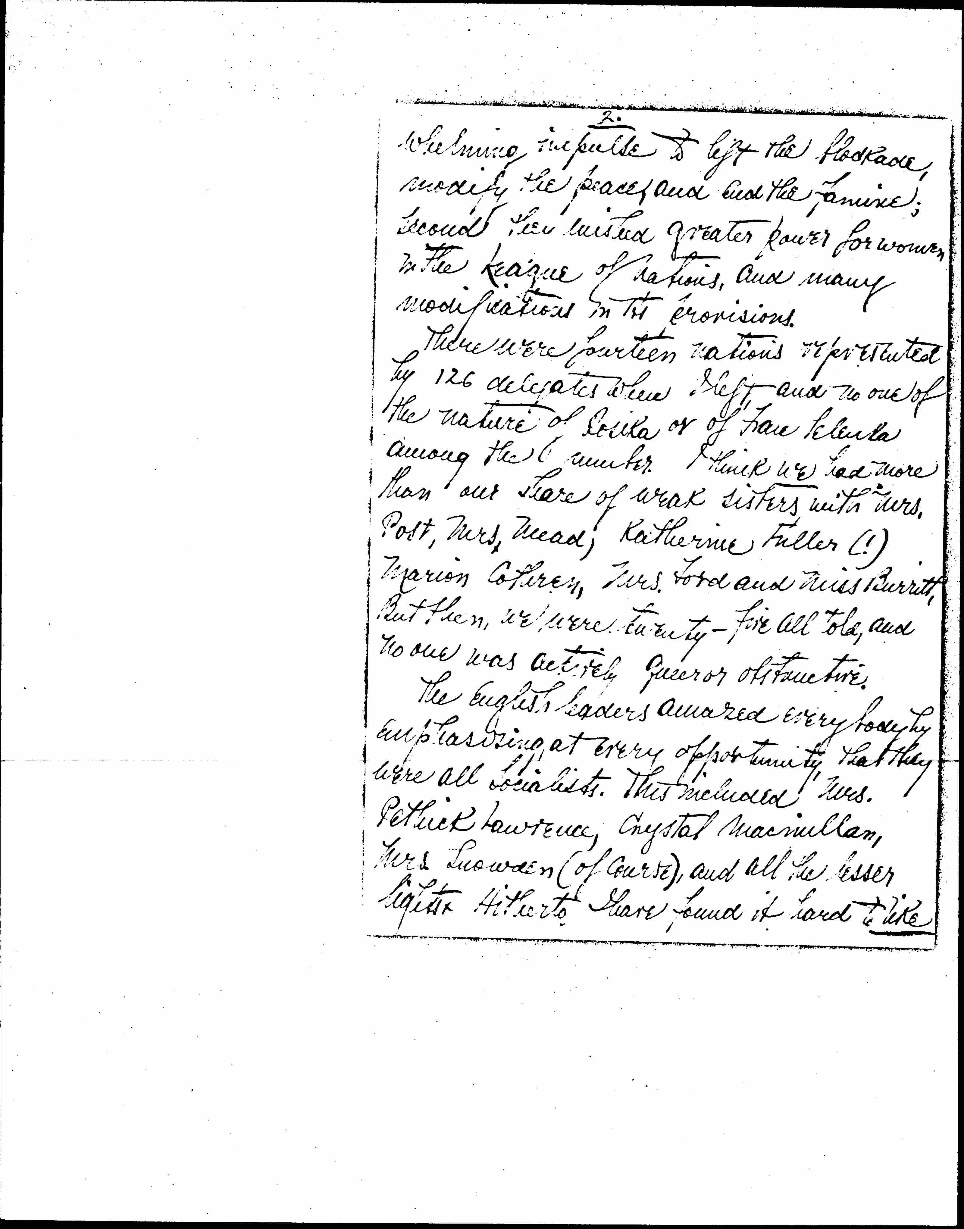 The English leaders amazed everybody by emphasizing at every opportunity, that they were all Socialists. This included Mrs. Pethick Lawrence, Chrystal Macmillan, Mrs. Snowden (of course), and all the lesser lights. Hitherto I have found it hard to like [page 3] Englishwomen, but this time I found myself their humble admirer.