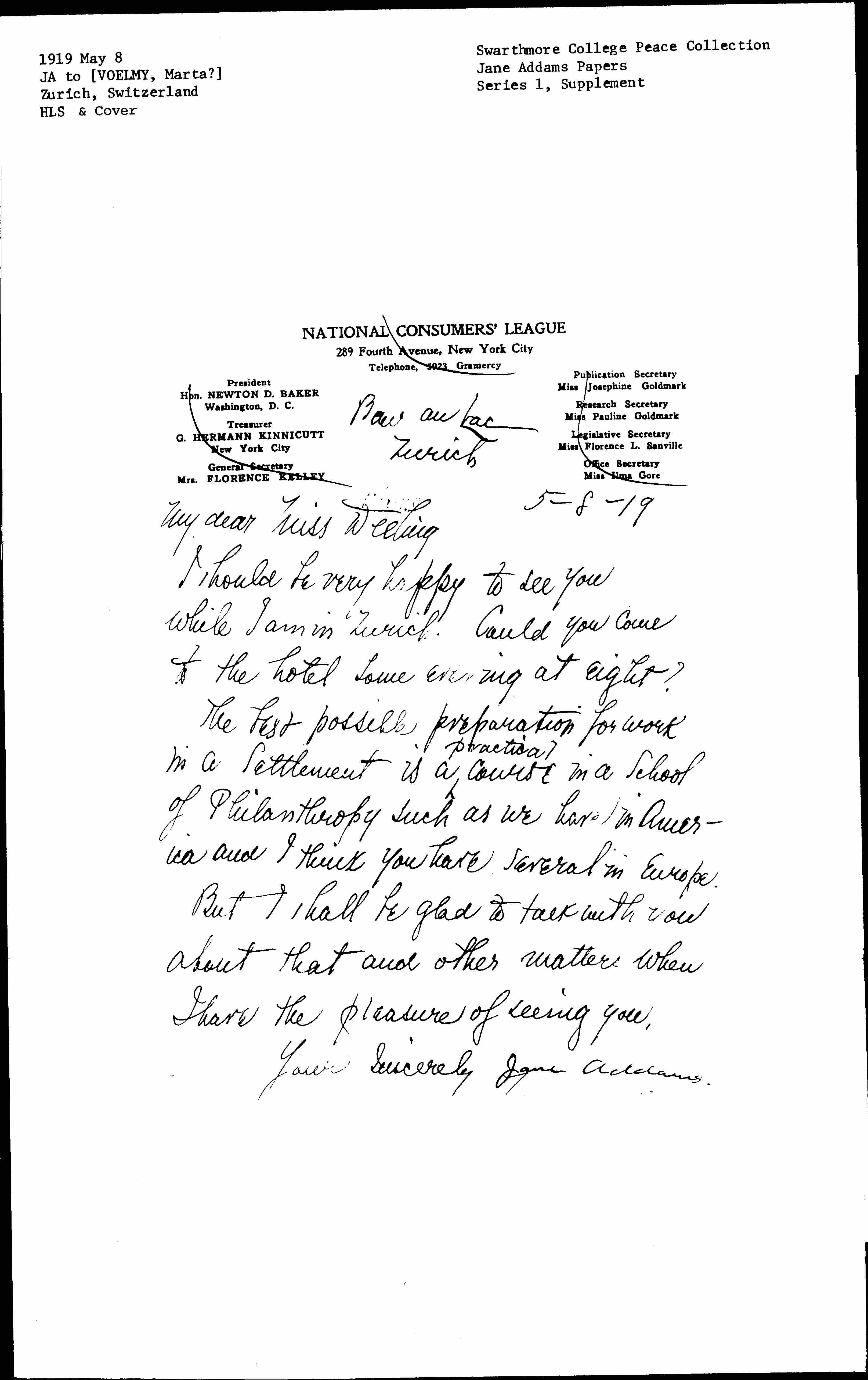 I should be very happy to see you while I am in Zurich. Could you come to the hotel some evening at eight?