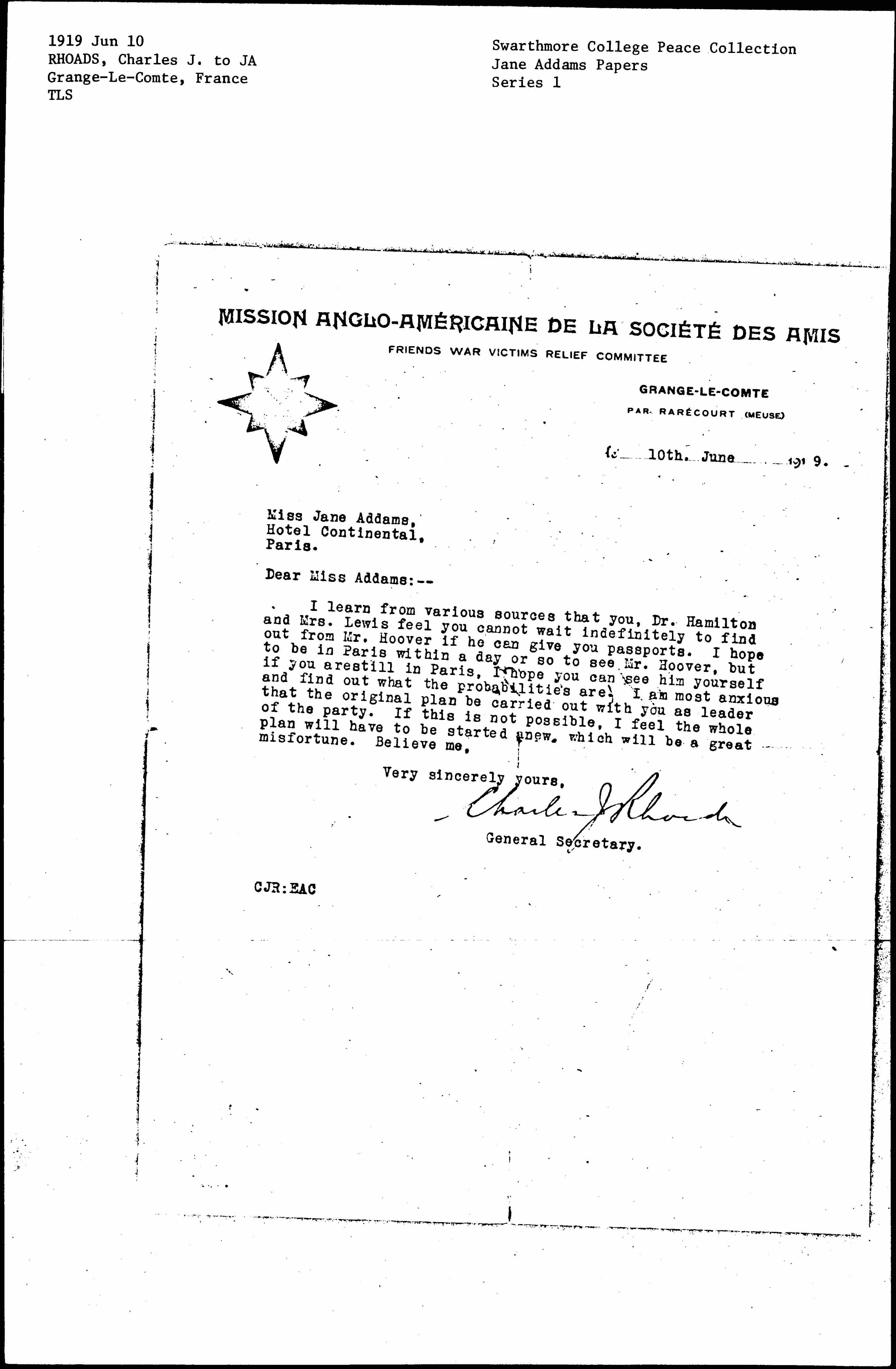 I learn from various sources that you, Dr. Hamilton and Mrs. Lewis feel you cannot wait indefinitely to find out from Mr. Hoover if he can give you passports. I hope to be in Paris within a day or so to see Mr. Hoover, but if you are still in Paris, I hope you can see him yourself and find out what the probabilities are. I am most anxious that the original plan can be carried out with you as leader of the party. If this is not possible, I feel the whole plan will have to be started anew, which will be a great misfortune. Believe me,