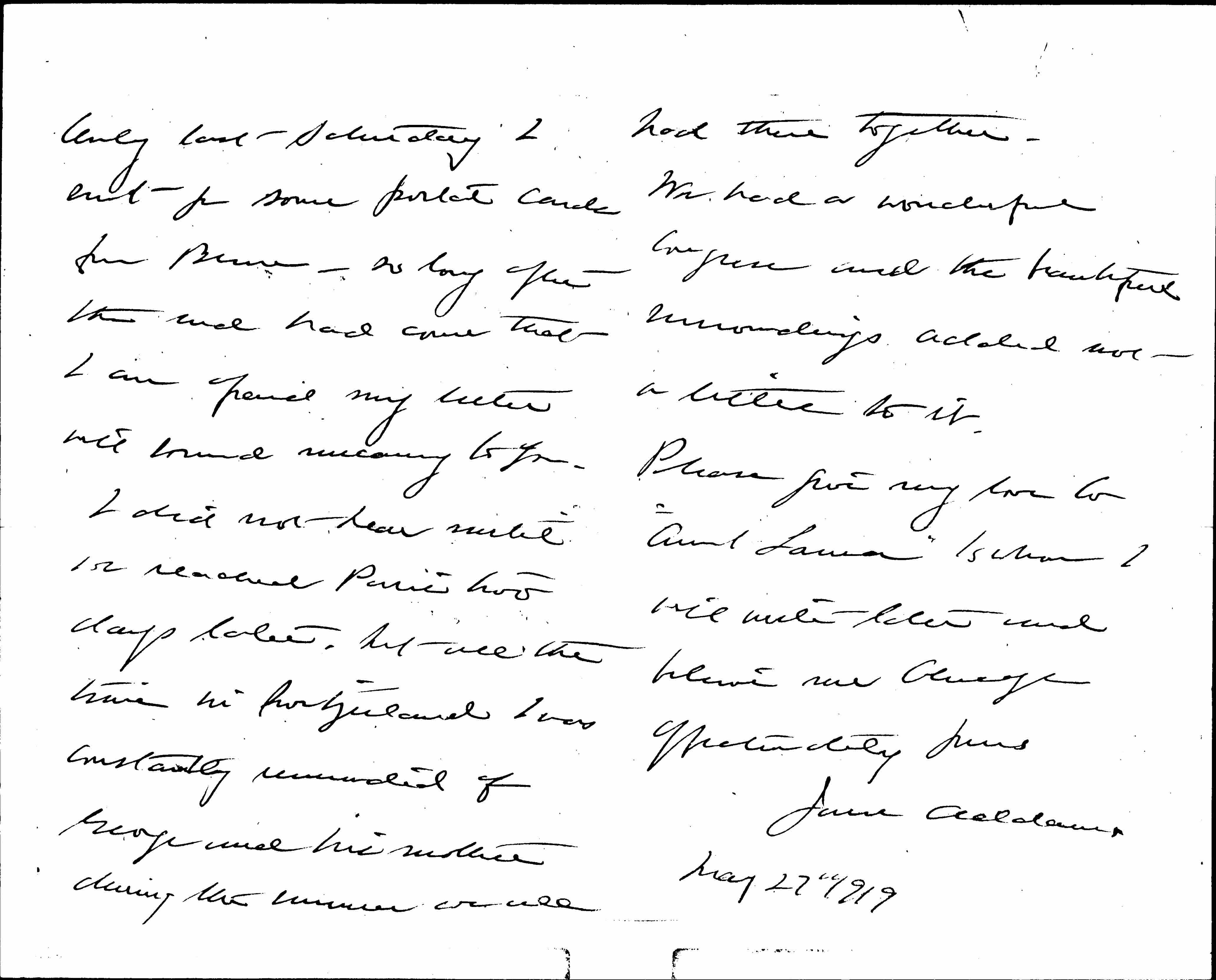 Early last Saturday I sent you some postal cards from Berne -- so long after the end had come that I am afraid my letter will sound [uncanny?] to you. I did not hear until we reached Paris two days later, but all the time in Switzerland I was constantly reminded of George and his mother during the summer we all [page 4] had there together.