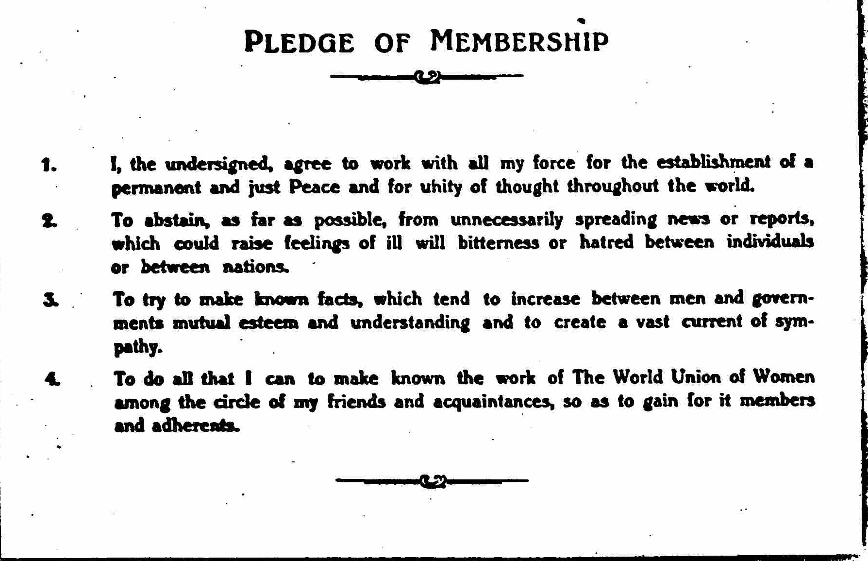 4. To do all that I can to make known the work of the World Union of Women among the circle of my friends and acquaintences, so as to gain for it members and adherents. [page 4]