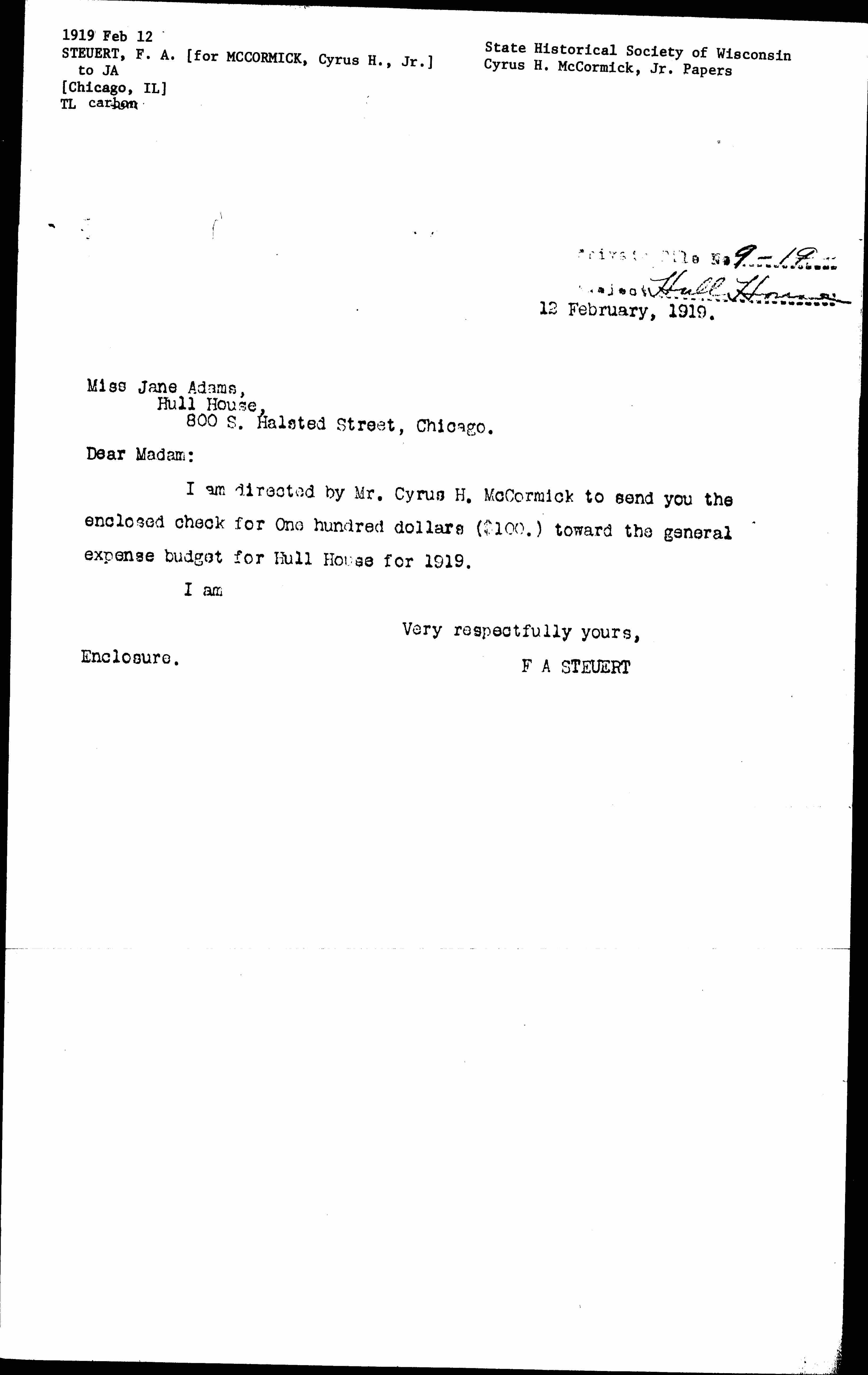 I am directed by Mr. Cyrus H. McCormick to send you the enclosed check for One hundred dollars ($100.) toward the general expense budget for Hull House for 1919.