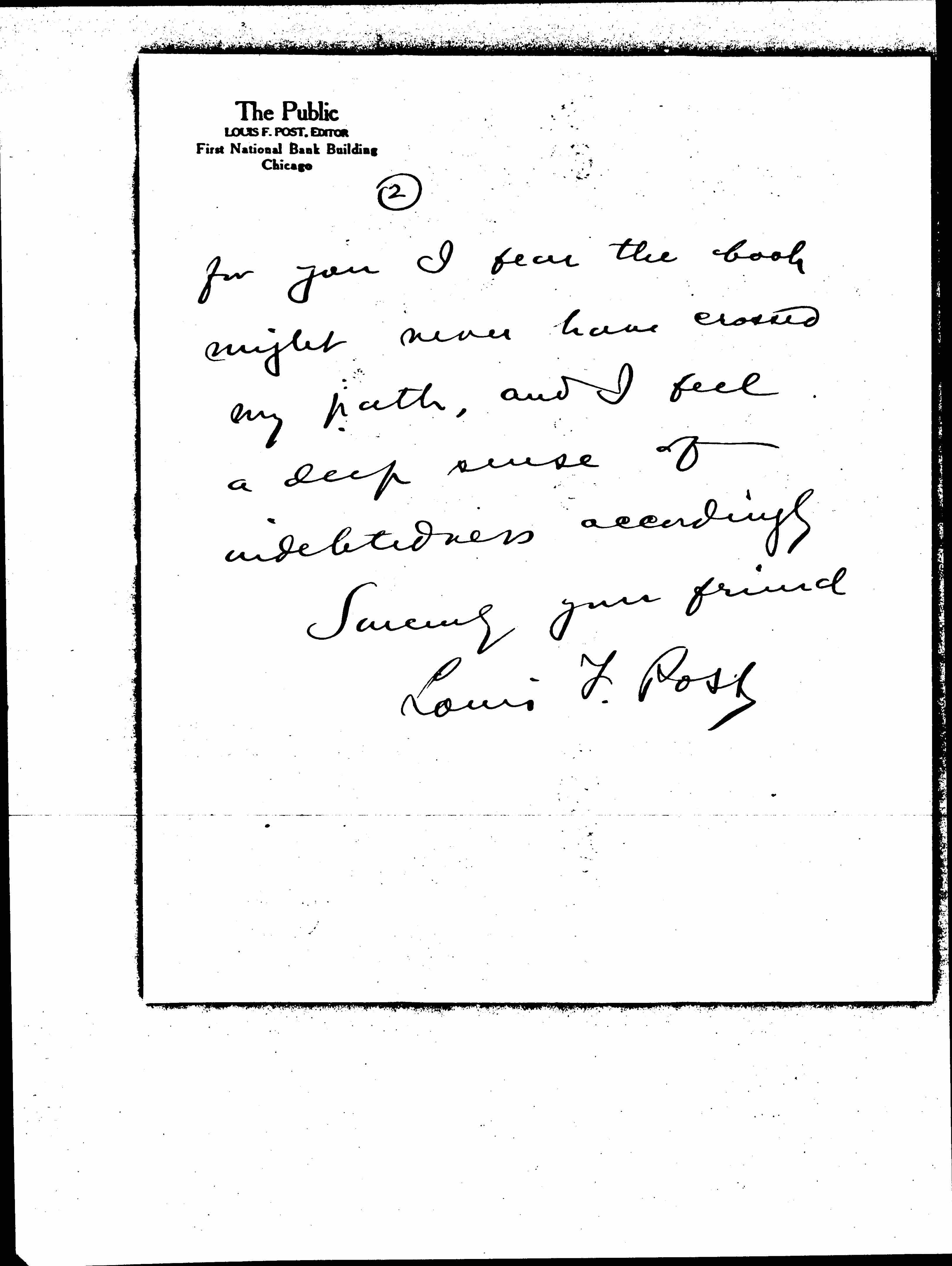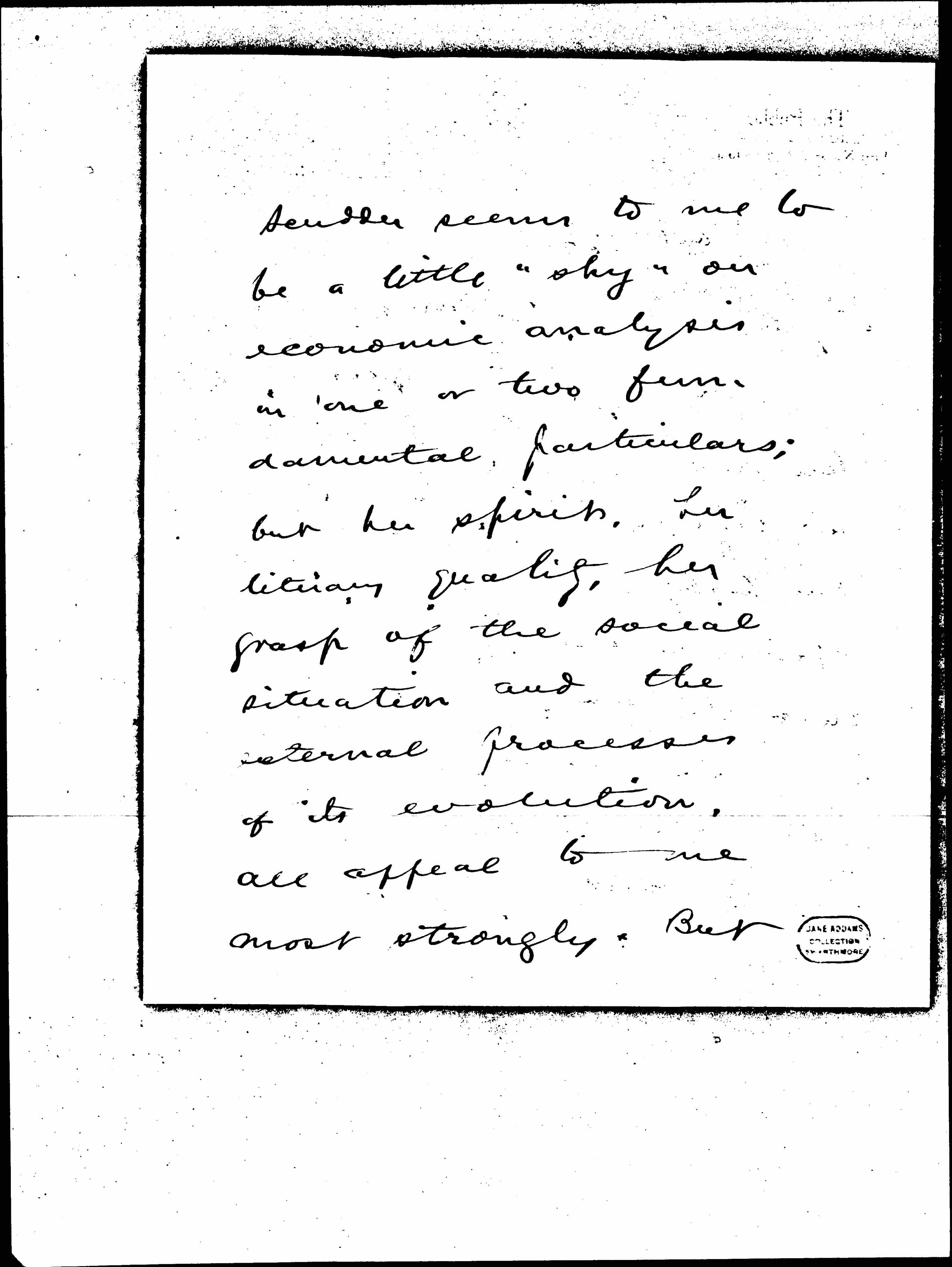 In returning Miss Scudder's "Social Ideals in English Letters," [which] you kindly lent me last Spring, I want to say that I have read it with exceptional delight -- twice, once to myself and then aloud to my wife. Miss [page 2] Scudder seems to me to be a little "shy" on economic analysis in one or two fundamental particulars; but her spirit, her literary quality, her grasp of the social situation and the eternal processes of its evolution, all appeal to me most strongly. But [page 3] for you I feel the book might never have crossed my path, and I feel a deep sense of indebtedness accordingly--