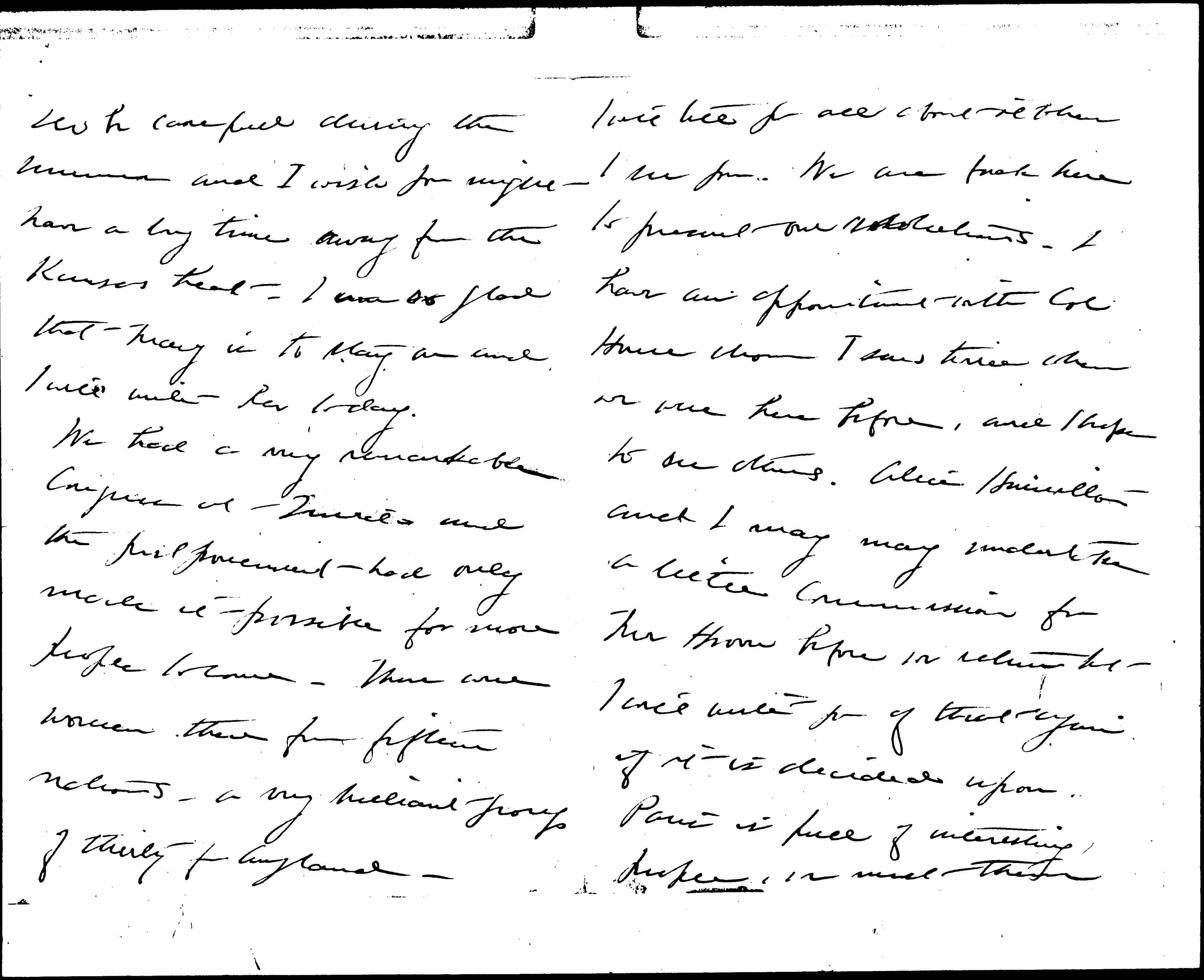 We had a very remarkable Congress at Zurich and the postponement had only made it possible for more people to come. There were women there from fifteen nations -- and a very brilliant group of thirty from England. [page 4] I will tell you all about it when I see you. We are back here to present our resolutions. I have an appointment with Col House whom I saw twice when we were here before, and I hope to see others. Alice Hamilton and I may undertake a little commission for Mr Hoover before we return but I will write you of that again if it is decided upon. Paris is full of interesting people, we meet them [page 5] every day -- but no one is very happy over the final outcome.