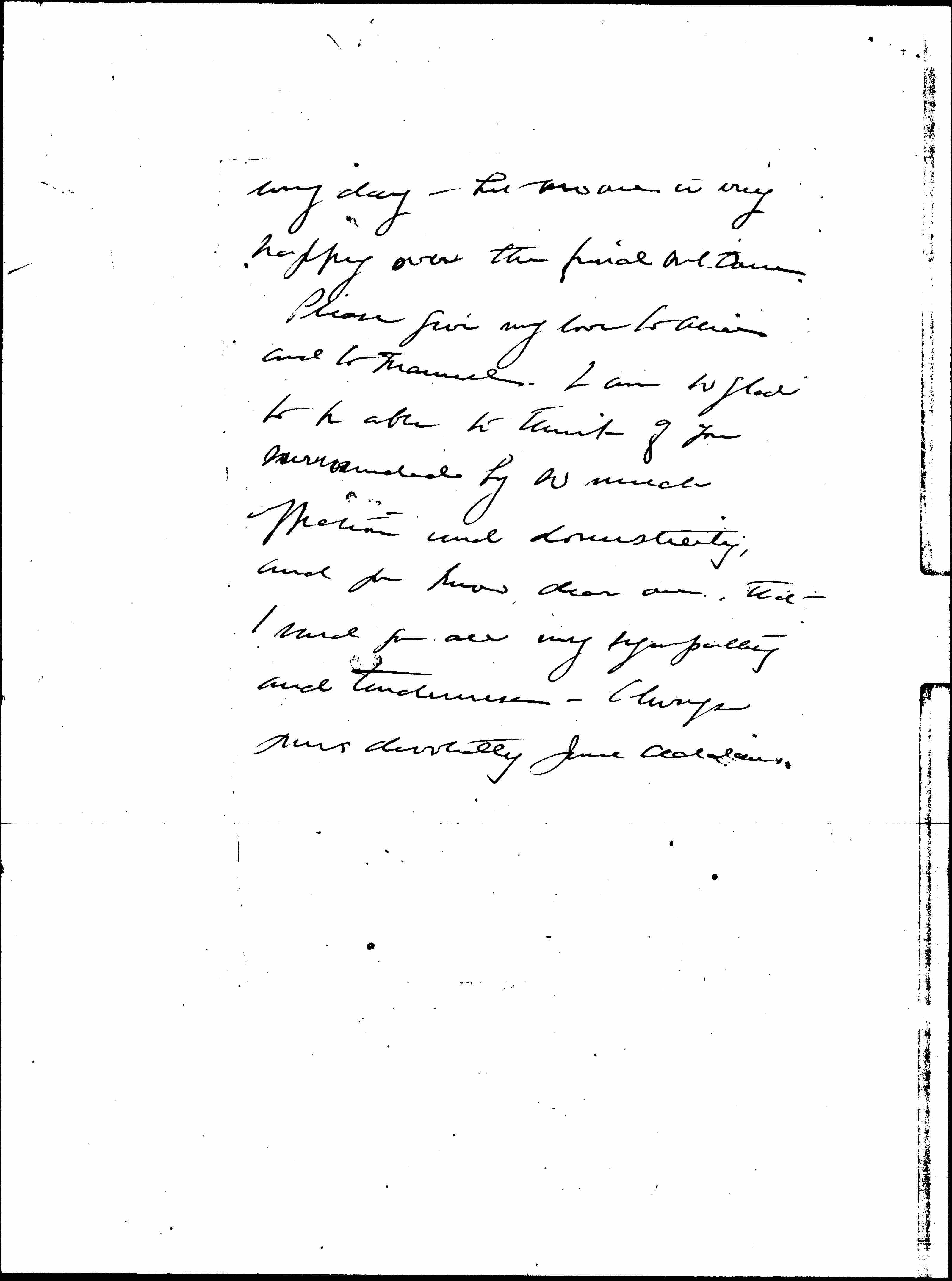Please give my love to Alice and to Manuel. I am so glad to be able to think of you surrounded by so much affection and domesticity, and you know, dear one, that I send you all my sympathy and tenderness -- Always yours devotedly Jane Addams.