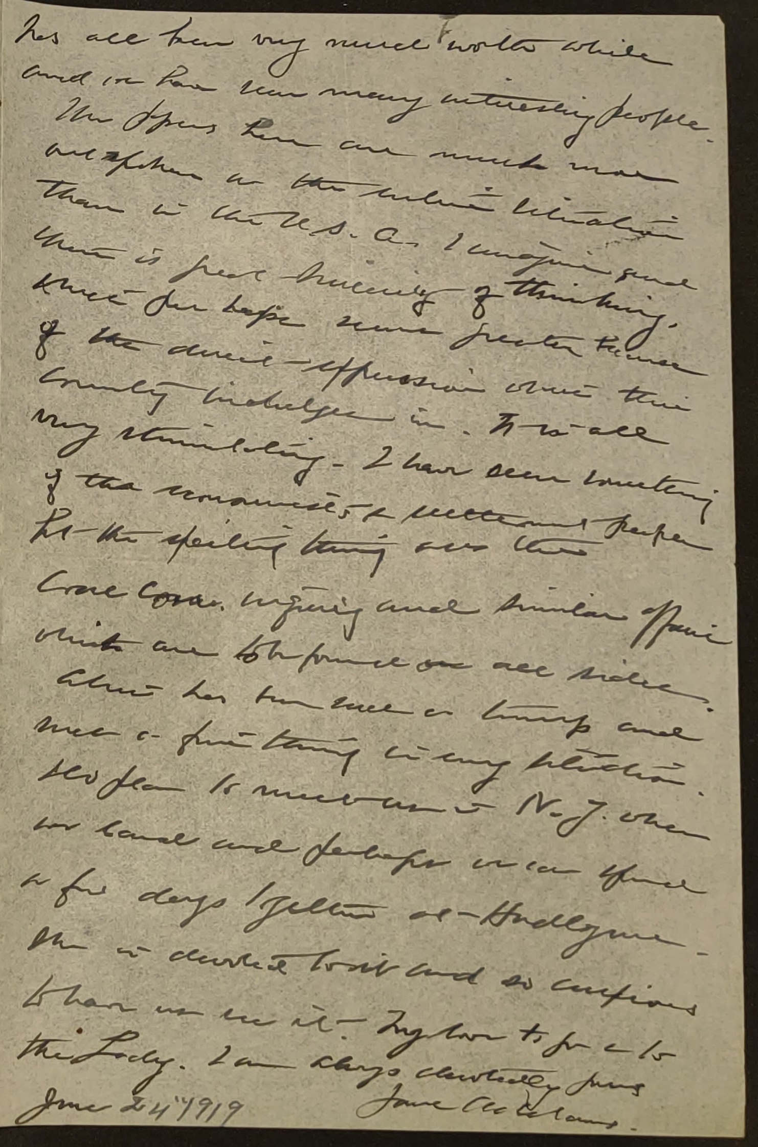 The papers here are much more outspoken on the entire situation than in the U.S.A. I imagine and there is great sincerity of thinking, which perhaps seems greater because of the direct expression which this country indulges in. It is all very stimulating. I have seen something of the economists & settlement people but the exciting thing was the Coal Com. inquiry and similar affairs which are to be found on all sides. Alice has been such a trump and such a fine thing in every situation. Do plan to meet us in N.Y. when we land and perhaps we can spend a few days together at Hadlyme. She is devoted to it and so anxious to have us see it. My love to you & to the Lady. I am always devotedly yours