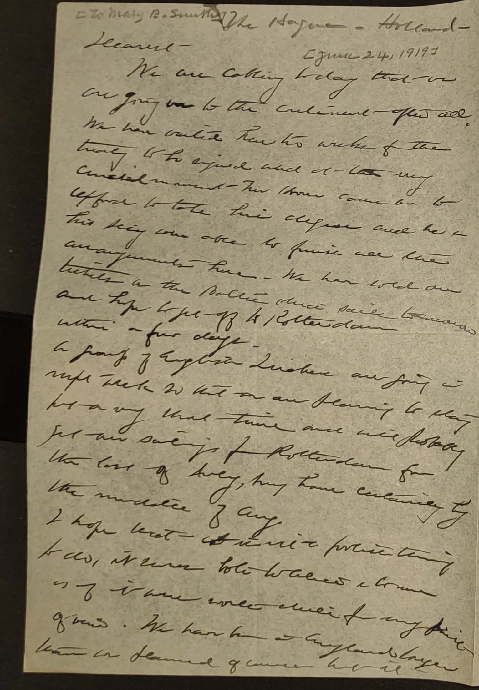 We are cabling today that we are going on to the continent after all. We have waited here two weeks for the treaty to be signed and at the very crucial moment Mr Hoover came on to Oxford to take his degree and he & his sec'y were able to finish all the arrangements here. We have sold our tickets on the Baltic which sails tomorrow and hope to get off to Rotterdam within a few days.