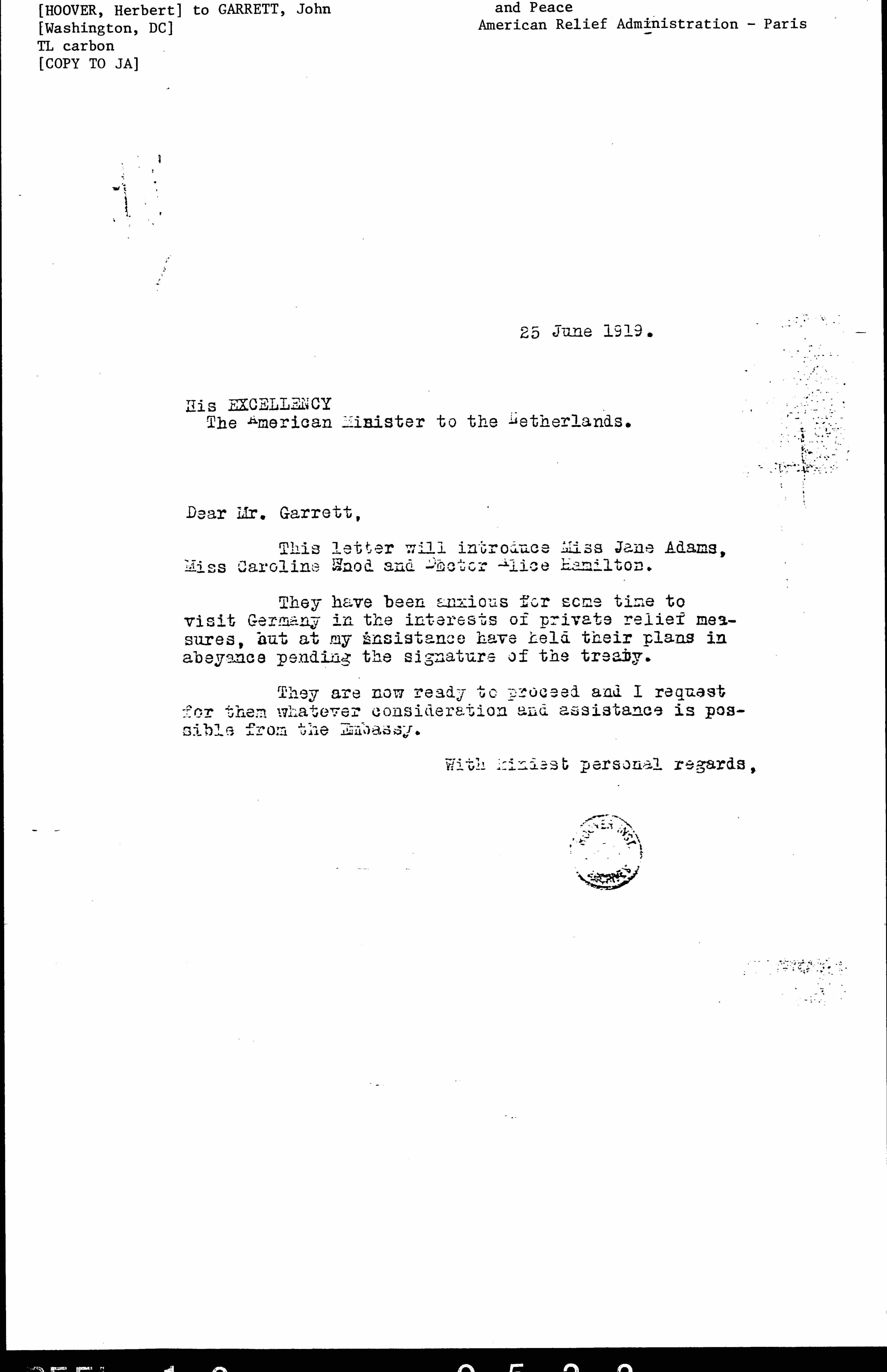 This letter will introduce Miss Jane [Addams], Miss [Carolena] Wood and Doctor Alice Hamilton.