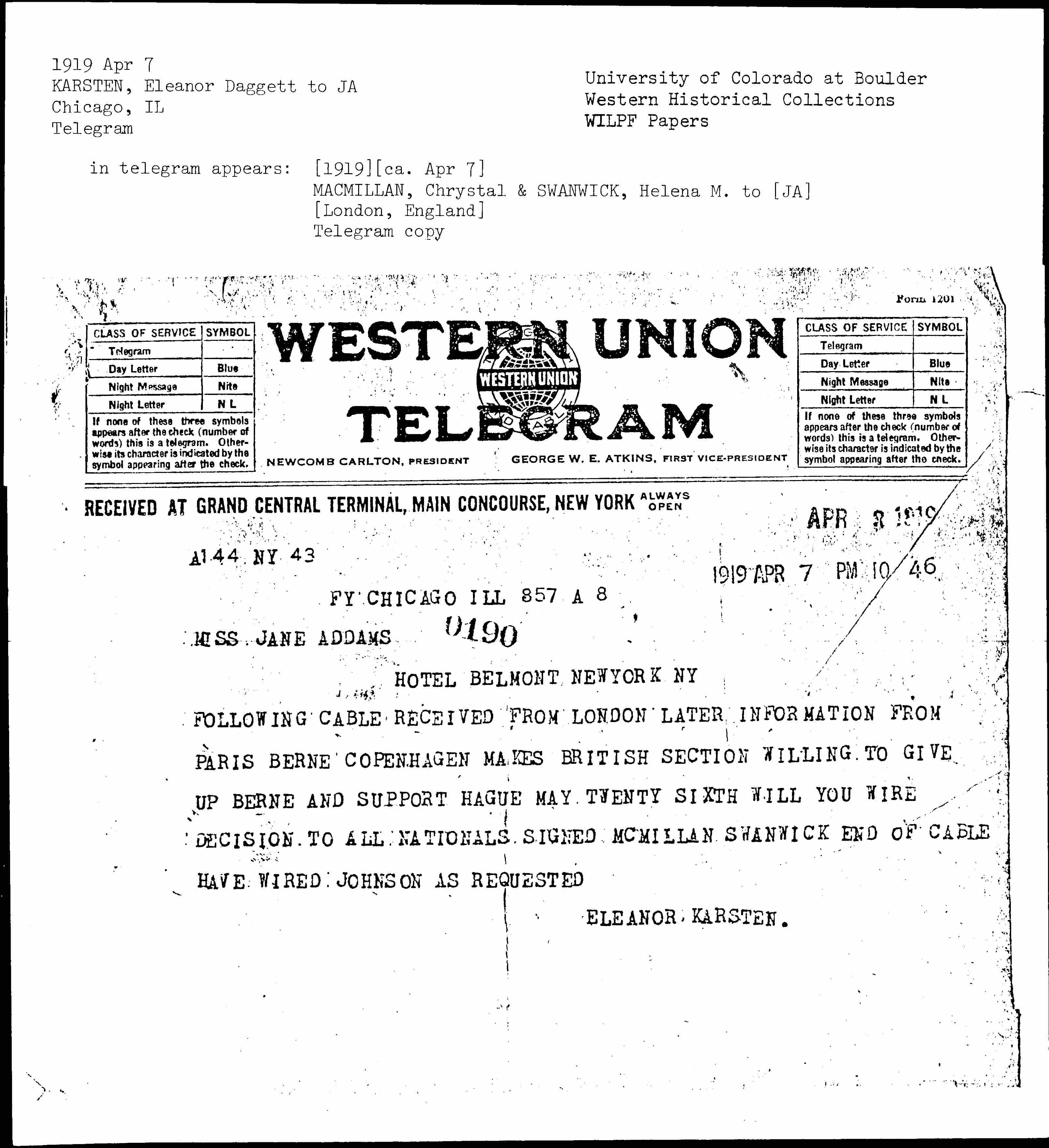 FOLLOWING CABLE RECEIVED FROM LONDON LATER INFORMATION FROM PARIS BERNE COPENHAGEN MAKES BRITISH SECTION WILLING TO GIVE UP BERNE AND SUPPORT HAGUE MAY TWENTY SIXTH WILL YOU WIRE DECISION TO ALL NATIONALS SIGNED [MACMILLAN] SWANWICK END OF CABLE HAVE WIRED [JOHNSTON] AS REQUESTED