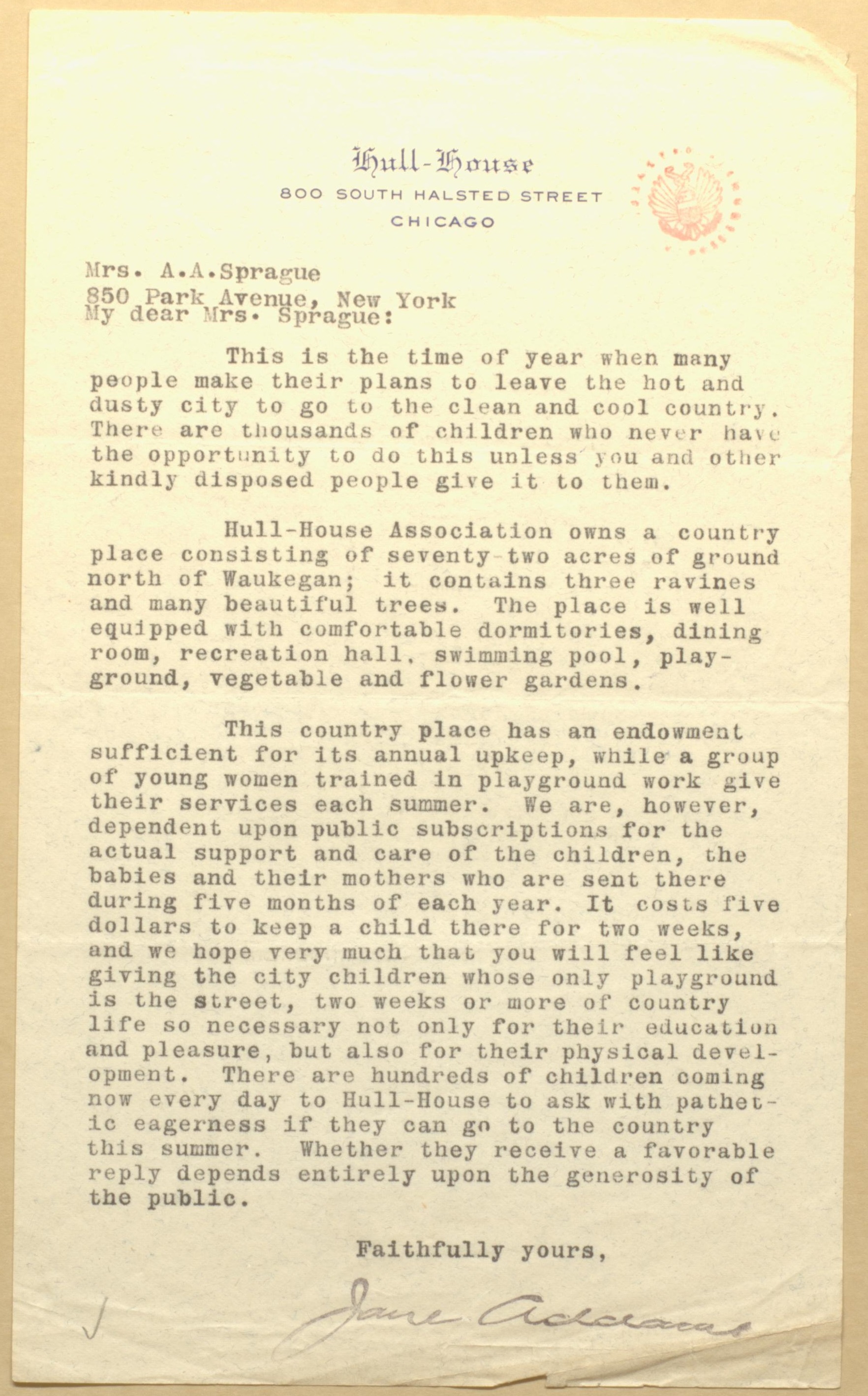 This country place has an endowment sufficient for its annual upkeep, while a group of young women trained in playground work give their services each summer. We are, however, dependent upon public subscriptions for the actual support and care of the children, the babies and their mothers who are sent there during five months of each year. It costs five dollars to keep a child there for two weeks, and we hope very much that you will feel like giving the city children whose only playground is the street, two weeks or more of country life so necessary not only for their education and pleasure, but also for their physical development. There are hundreds of children coming now every day to Hull-House to ask with pathetic eagerness if they can go to the country this summer. Whether they receive a favorable reply depends entirely upon the generosity of the public.