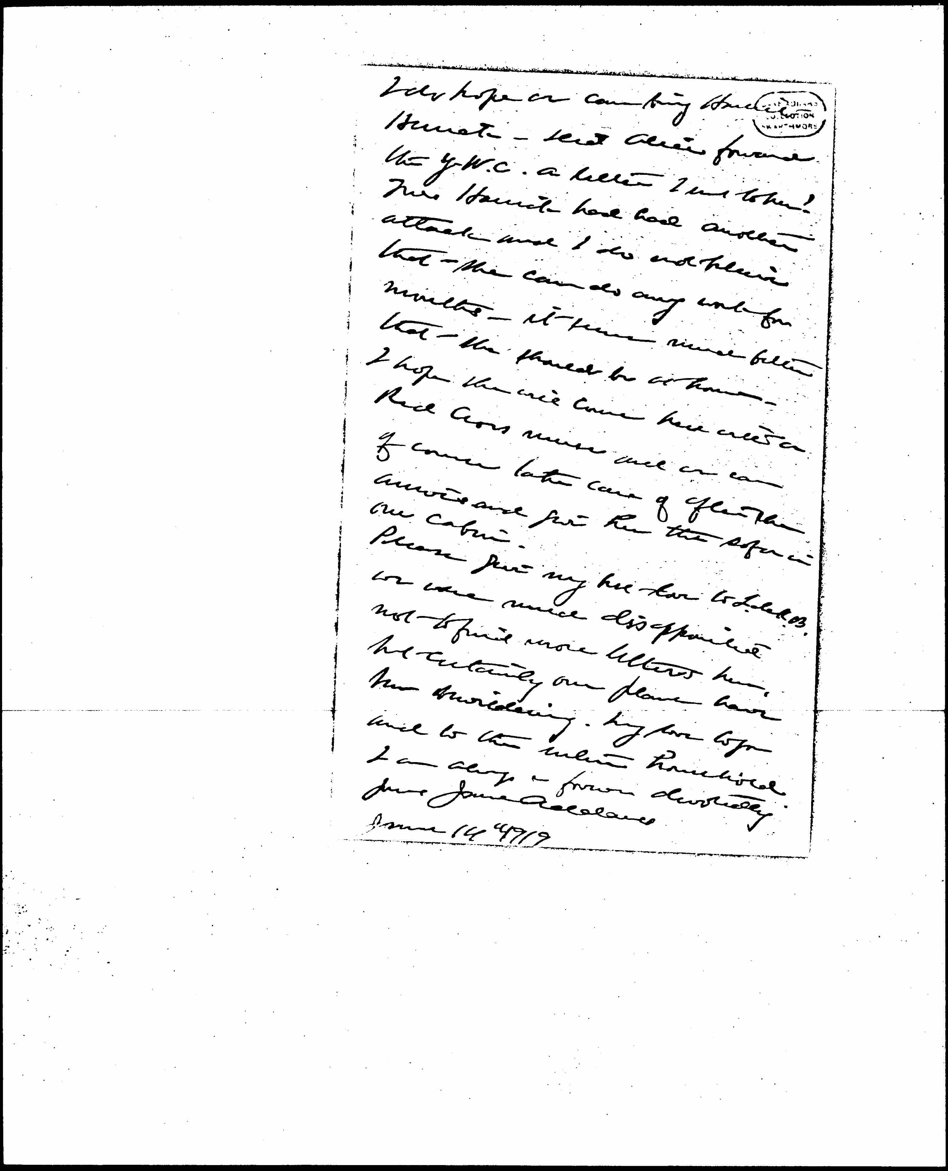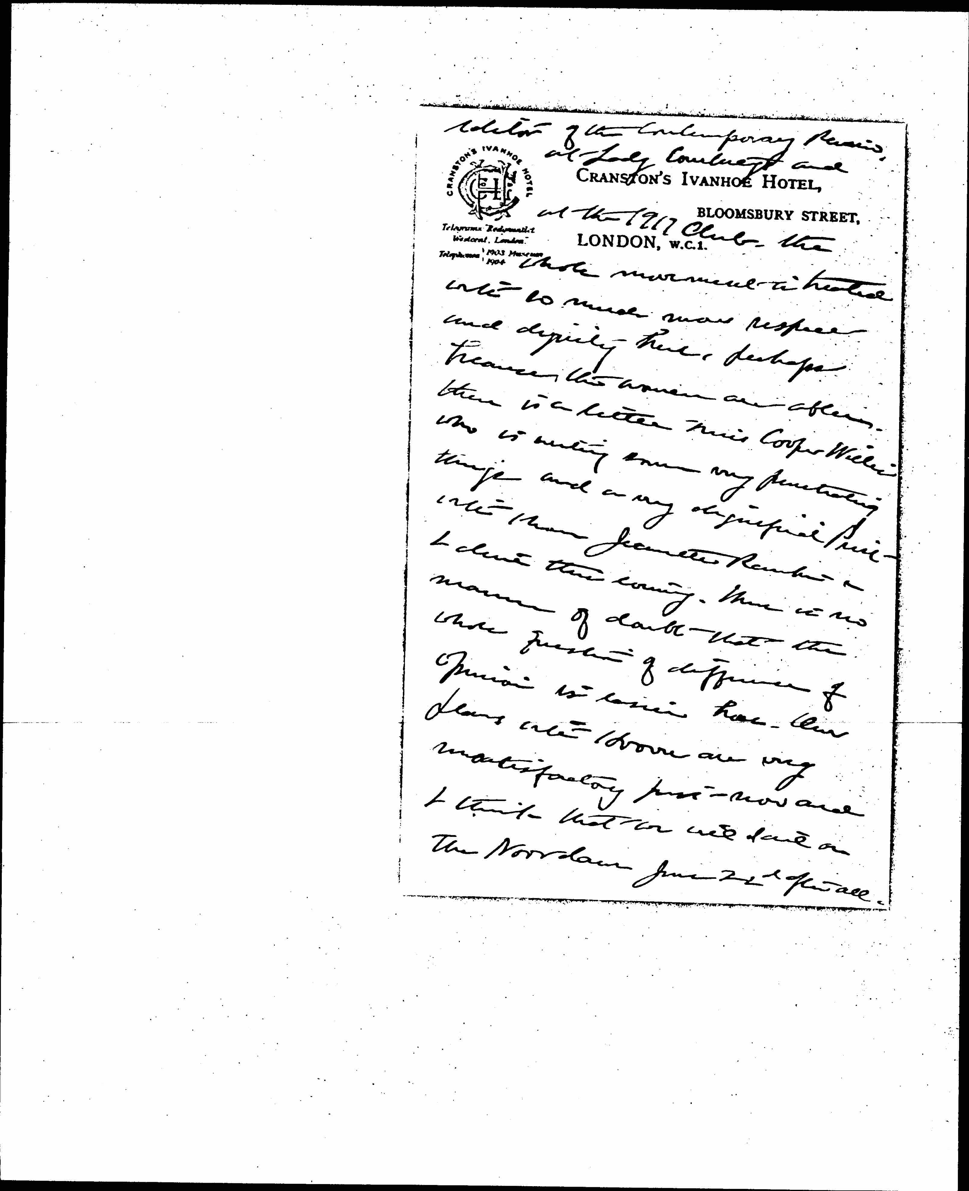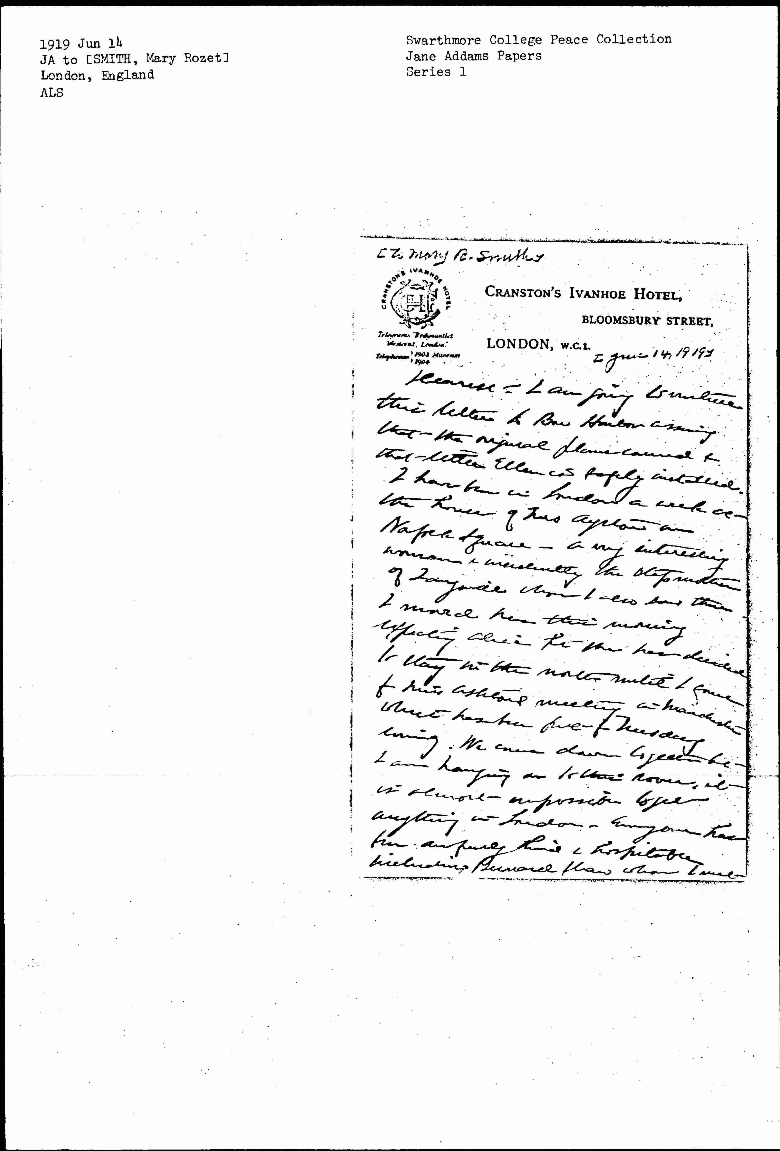 We have a public meeting here next Monday, I am the object of three teas next week at Mrs Gooch's whose husband is the [page 3] editor of the Contemporary Review, at Lady Courtney's and at the 1917 Club. The whole movement is treated with so much more respect and dignity here, perhaps because the women are able. There is a little Miss Cooper Willis who is writing some very penetrating things and a very dignified [Priest?] with whom Jeanette Rankin & I dine this evening. There is no manner of doubt that the whole question of difference of opinion is easier here. Our plans with Hoover are very unsatisfactory just now and I think that we will sail on the Noordam June 22d after all. [page 4] I do hope we can bring Harriet Herrick. Did Alice forward the Y.W.C.A. letter I sent to her? Mrs Herrick had had another attack and I do not believe that she can do any work for months -- it seems much better that she should be at home. I do hope she will come here with a Red Cross nurse and we can of course take care of after she arrives and give her the sofa in our cabin.