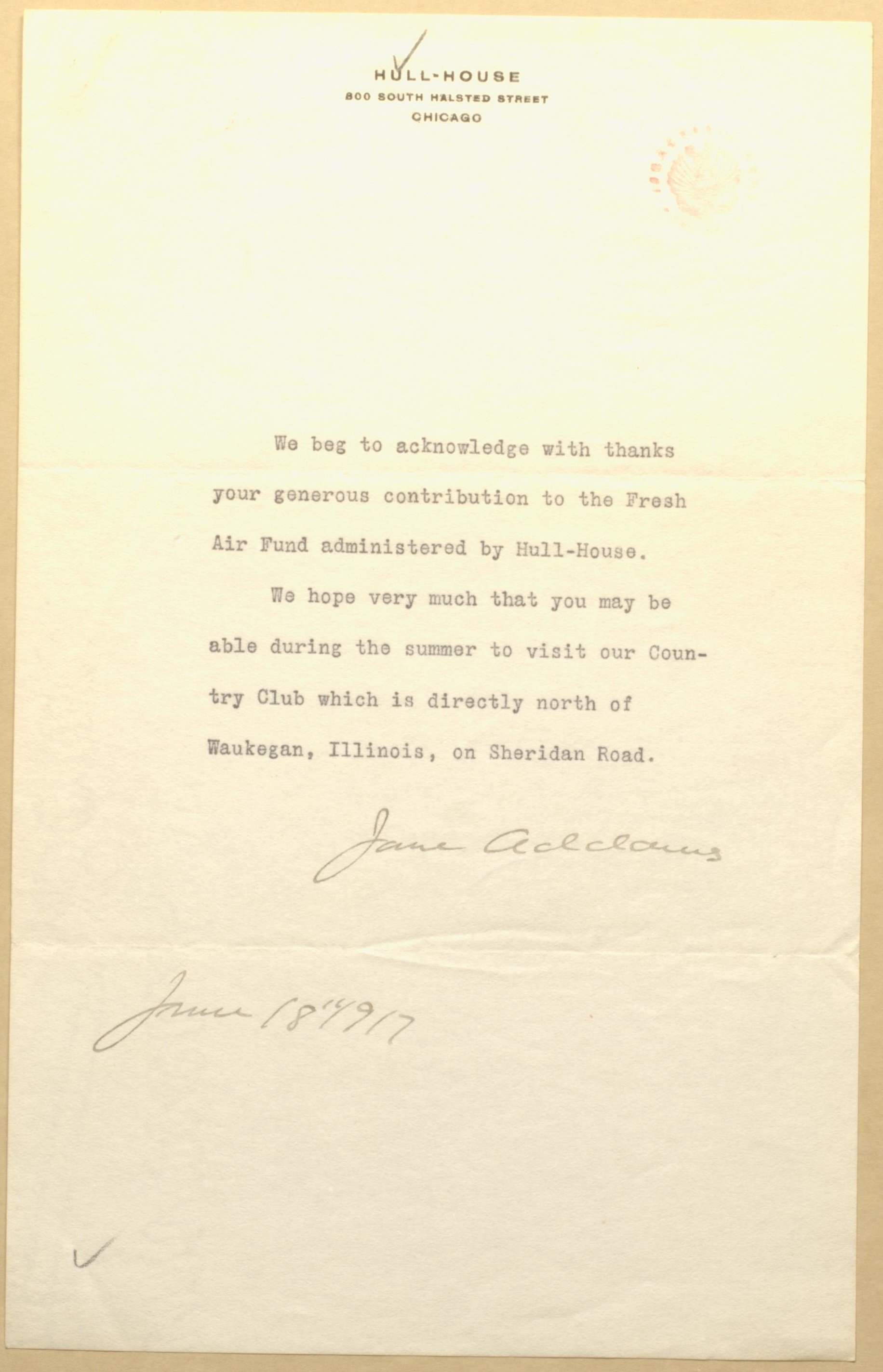 We beg to acknowledge with thanks your generous contribution to the Fresh Air Fund administered by Hull-House.