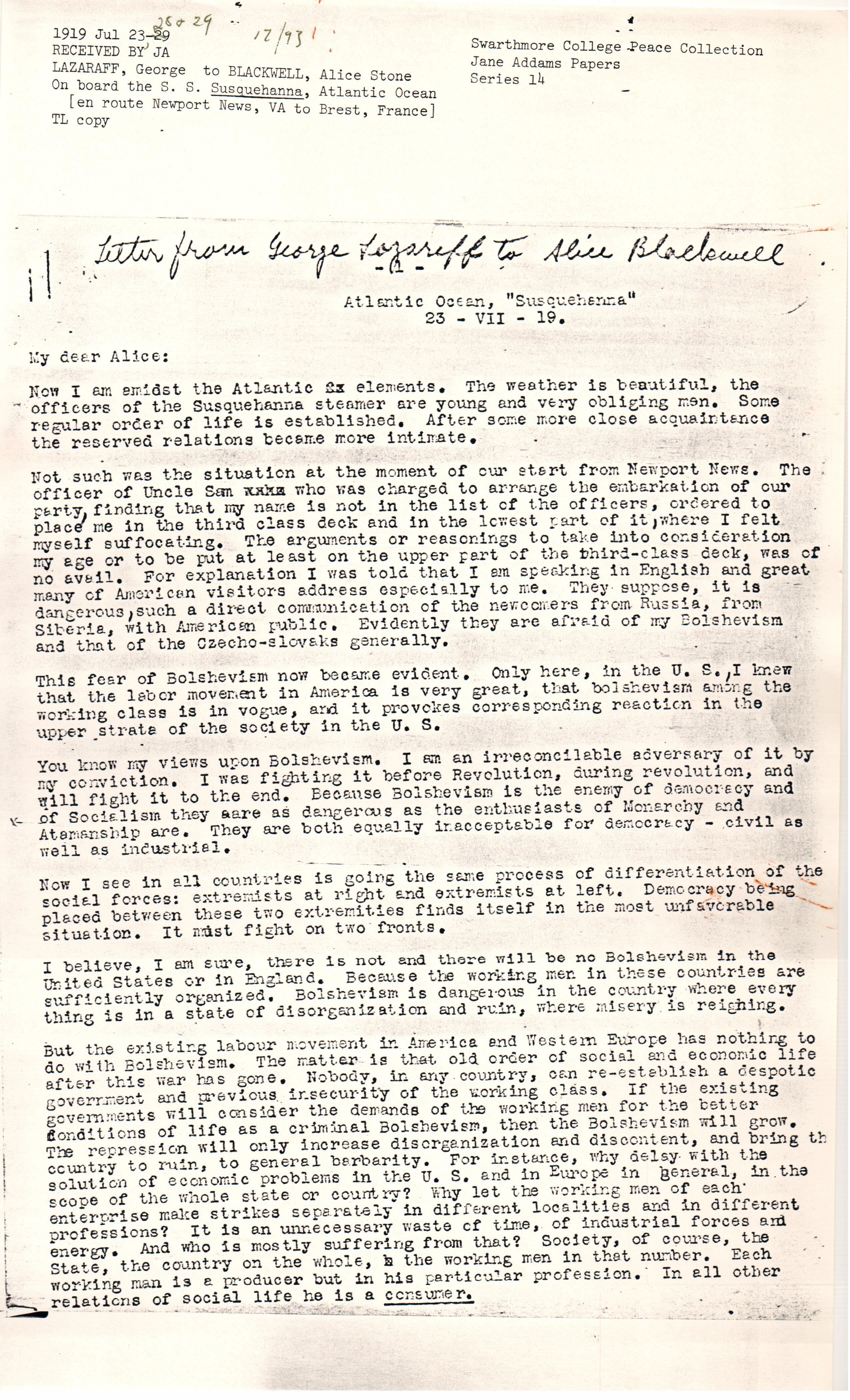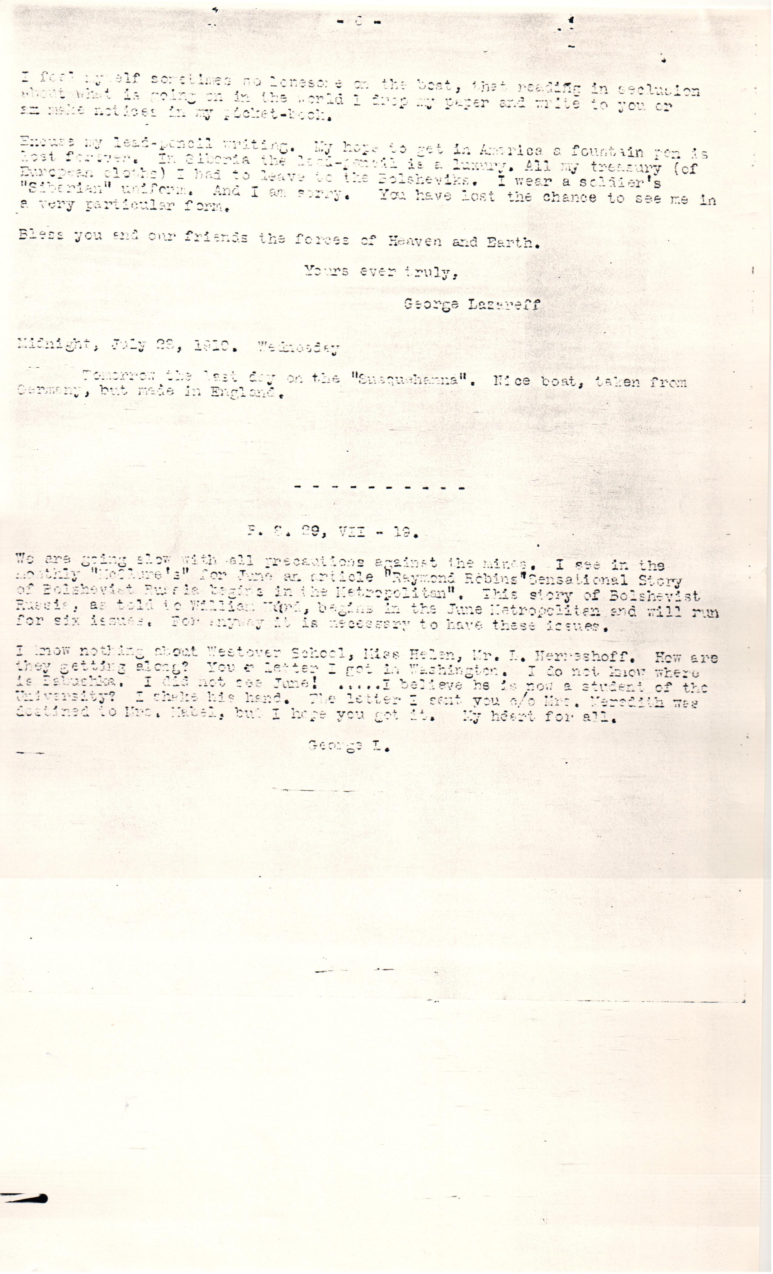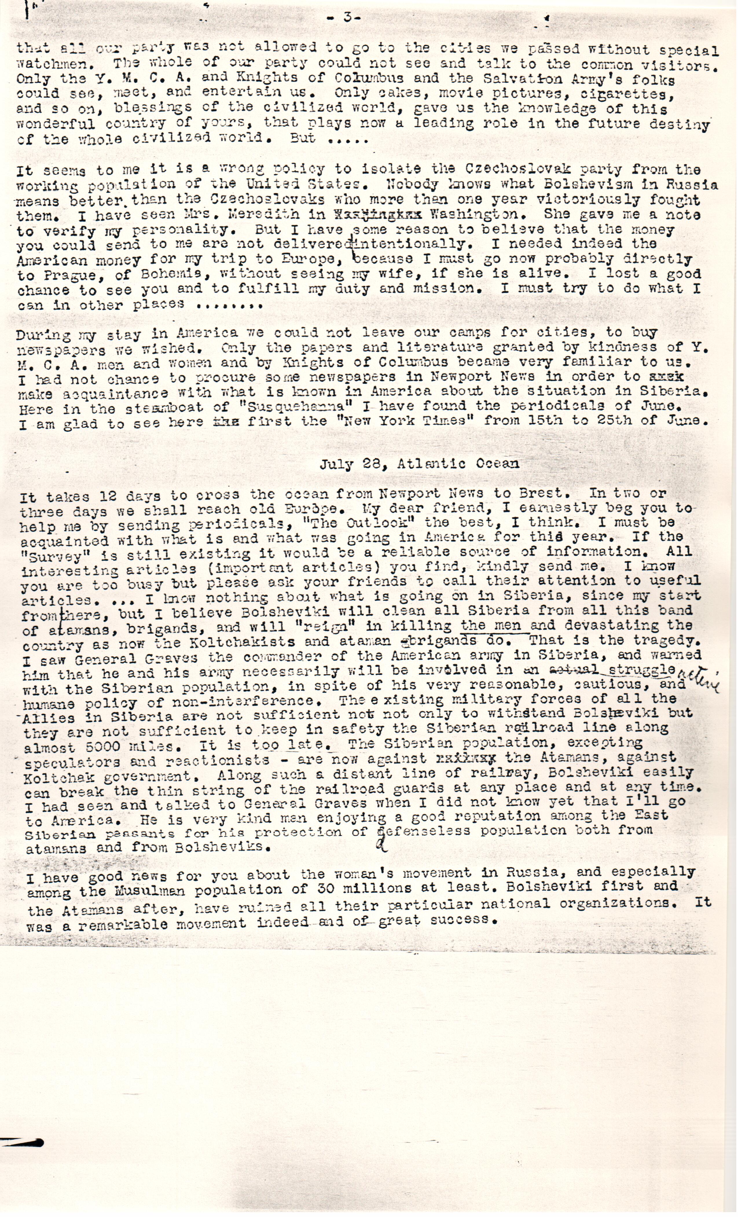 It takes 12 days to cross the ocean from Newport News to Brest. In two or three days we shall reach old Europe. My dear friend, I earnestly beg you to help me by sending periodicals, "The Outlook" the best, I think. I must be acquainted with what is and what was going in America for this year. If the "Survey" is still existing it would be a reliable source of information. All interesting articles (important articles) you find, kindly send me. I know you are too busy but please ask your friends to call their attention to useful articles. ... I know nothing about what is going on in Siberia, since my start from there, but I believe Bolsheviki will clean all Siberia from all this band of atamans, brigands, and will "reign" in killing the men and devastating the country as now the [Kolchakists] and ataman brigands do. That is the tragedy. I saw General Graves the commander of the American army in Siberia, and warned him that he and his army necessarily will be involved in an actual ↑active↓ struggle with the Siberian population, in spite of his very reasonable, cautious, and humane policy of [noninterference]. The existing military forces of all the Allies in Siberia are not sufficient not only to withstand Bolsheviki but they are not sufficient to keep in safety the Siberian railroad line along almost 5000 miles. It is too late. The Siberian population, excepting speculators and reactionists -- are now against [illegible] the Atamans, against [Kolchak] government. Along such a distant line of [railway], Bolsheviki easily can break the thin string of the railroad guards at any place and at any time. I had seen and talked to General Graves when I did not know yet that I'll go to America. He is very kind man enjoying a good reputation among the East Siberian peasants for his protection of defenseless population both from atamans and from Bolsheviks.