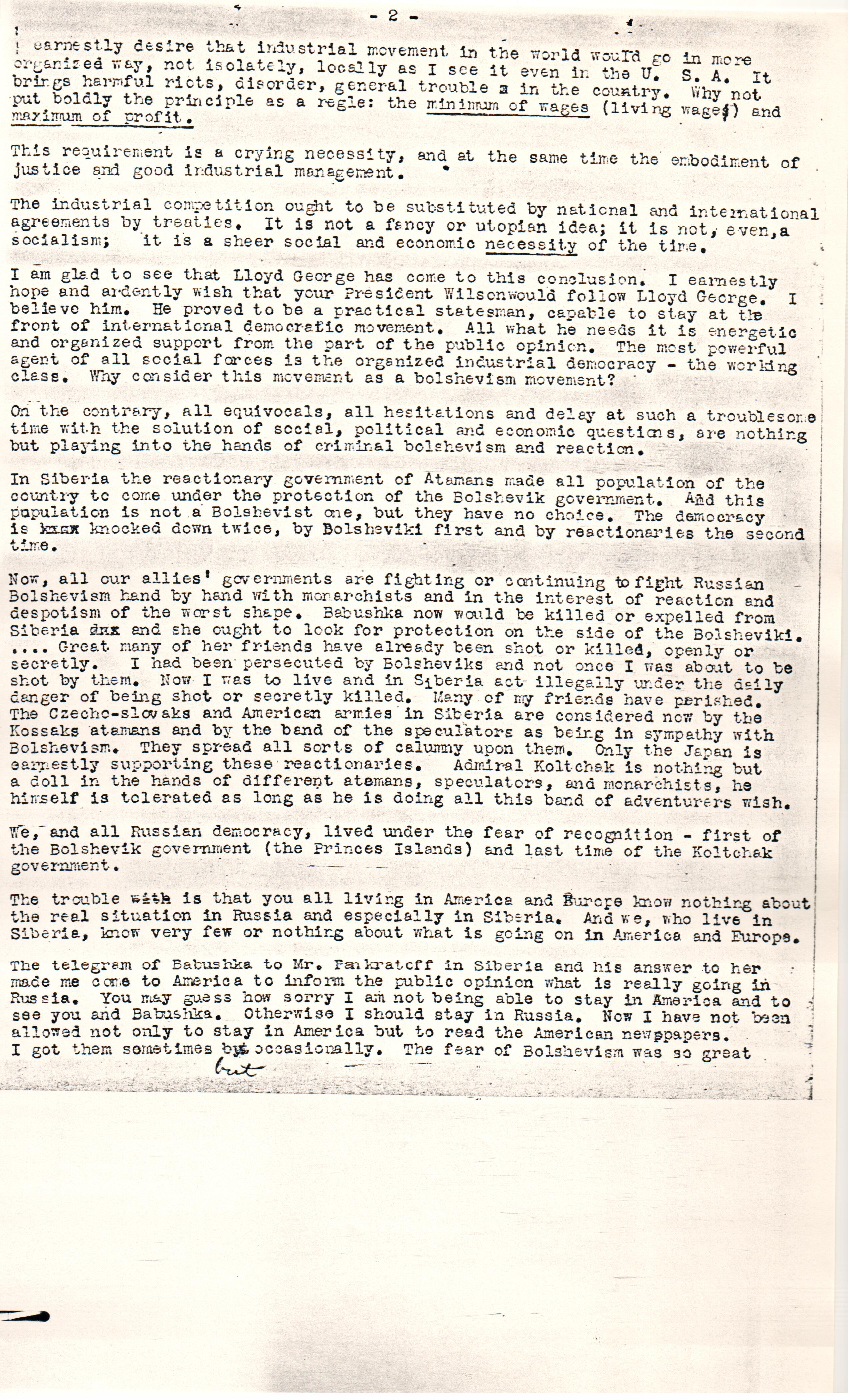 But the existing [labor] movement in America and Western Europe has nothing to do with Bolshevism. The matter is that old order of social and economic life after this war has gone. Nobody, in any country, can [reestablish] a despotic government and previous insecurity of the working class. If the existing governments will consider the demands of the working men for the better conditions of life as a criminal Bolshevism then the Bolshevism will grow. The repression will only increase disorganization and discontent, and bring the country to ruin, to general barbarity. For instance, why delay with the solution of economic problems in the U.S. and in Europe in general, in the scope of the whole state or country? Why let the working men of each enterprise make strikes separately in different localities and in different professions? It is an unnecessary waste of time, of industrial forces and energy. And who is mostly suffering from that? Society, or course, the State, the country on the whole, the working men in that number. Each working man is a producer but in his particular profession. In all other relations of social life he is a consumer. [page 2]
