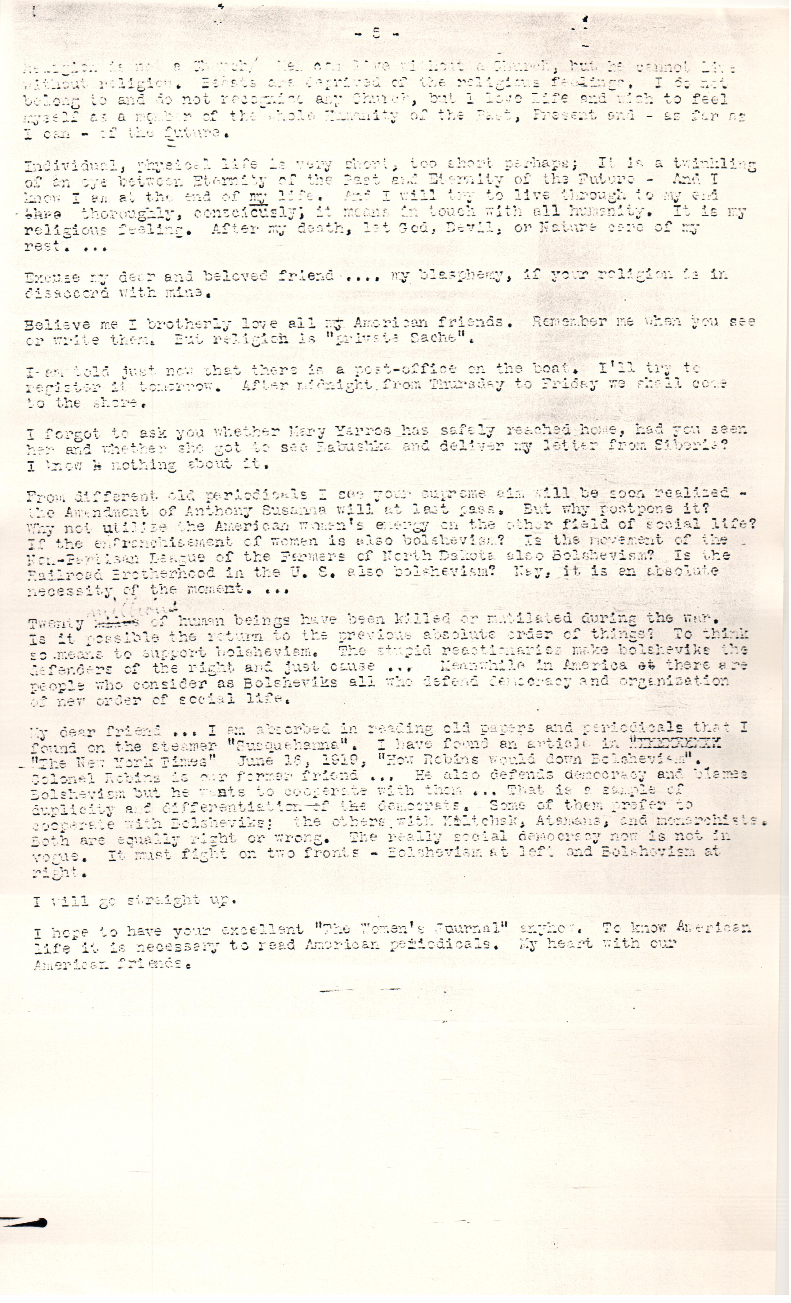 From different old periodicals I see your supreme aim will be soon realized -- the Amendment of [Susan Anthony] will at last pass. But why postpone it? Why not utilize the American woman's energy on the other field of social life? If the enfranchisement of women is also bolshevism? Is the movement of the Non-Partisan League of the Farmers of North Dakota also Bolshevism? Is the Railroad Brotherhood in the U.S. also bolshevism? Nay, it is an absolute necessity of the moment. ...