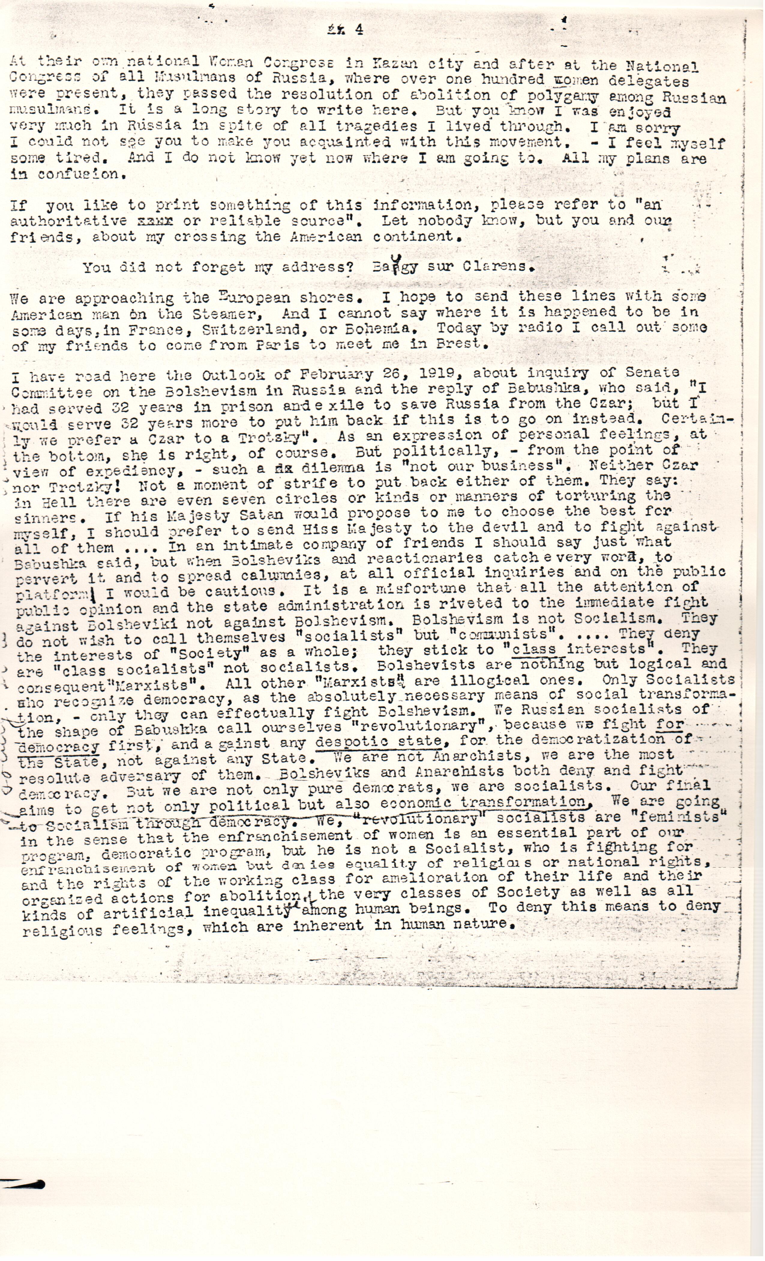 I have read here the Outlook of February 26, 1919, about inquiry of Senate Committee on the Bolshevism in Russia and the reply of Babushka, who said, "I had served 32 years in prison and exile to save Russia from the Czar; but I would serve 32 years more to put him back if this is to go on instead. Certainly we prefer a Czar to a Trotsky". As an expression of personal feelings, at the bottom, she is right, of course. But politically, -- from the point of view of expediency, -- such a dilemma is "not our business". Neither Czar nor Trotsky! Not a moment of strife to put back either of them. They say: in Hell there are even seven circles or kinds or manners of torturing the sinners. If his Majesty Satan would propose to me to choose the best for myself, I should prefer to send [His] Majesty to the devil and to fight against all of them ... In an intimate company of friends I should say just what Babushka said, but when Bolsheviks and reactionaries catch every word, to pervert it and to spread calumnies, at all official inquiries and on the public platform I would be cautious. It is a misfortune that all the attention of public opinion and the state administration is riveted to the immediate fight against Bolsheviki not against Bolshevism. Bolshevism is not Socialism. They do not wish to call themselves "socialists" but "communists". ... They deny the interests of "Society" as a whole; they stick to "class interests". They are "class socialists" not socialists. Bolshevists are nothing but logical and consequent "Marxists". All other "Marxists" are illogical ones. Only Socialists who recognize democracy, as the absolutely necessary means of social transformation, -- only they can effectually fight Bolshevism. We Russian socialists of the shape of Babushka call ourselves "revolutionary", because we fight for democracy first, and against any despotic state, for the democratization of the State, not against any State. We are not Anarchists, we are the most resolute adversary of them. Bolsheviks and Anarchists both deny and fight democracy. But we are not only pure democrats, we are socialists. Our final aims to get not only political but also economic transformation ↑of society. [illegible]↓. We are going to Socialism through democracy. We, "revolutionary" socialists are "feminists" in the sense that the enfranchisement of women is an essential part of our program, democratic program, but he is not a Socialist, who is fighting for enfranchisement of women but denies equality of religious or national rights, and the rights of the working class for amelioration of their life and their organized actions for abolition ↑of↓ the very classes of Society as well as all kinds of artificial inequality among human beings. To deny this means to deny religious feelings, which are inherent in human nature. [page 5]