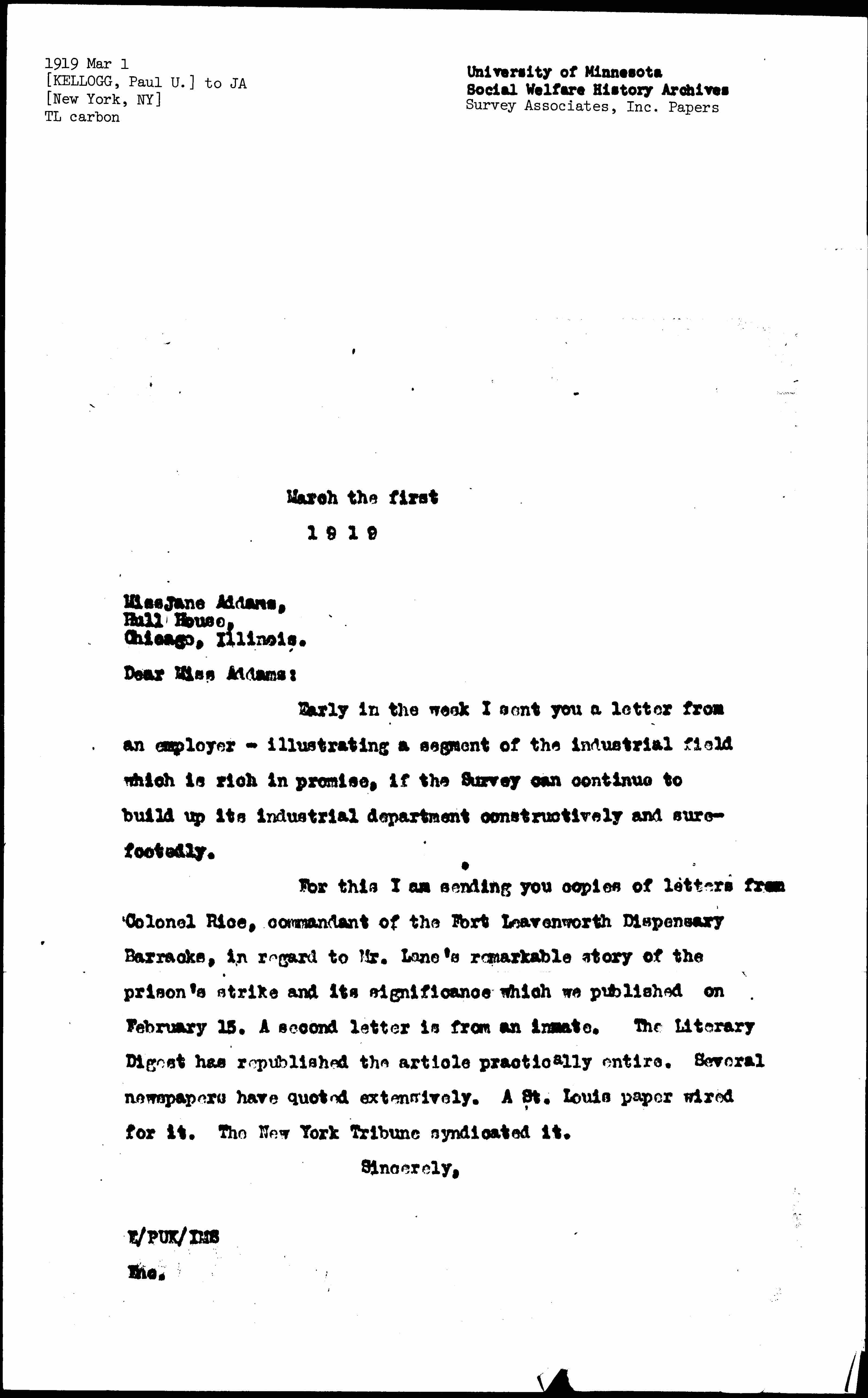 For this I am sending you copies of letters Colonel Rice, commandant of the Fort Leavenworth Dispensary Barracks, in regard to Mr. Lane's remarkable story of the prison's strike and its significance which we published on February 15. A second letter is from an inmate. The Literary Digest has republished the article practically entire. Several newspapers have quoted extensively. A St. Louis paper wired for it. The New York Tribune syndicated it.