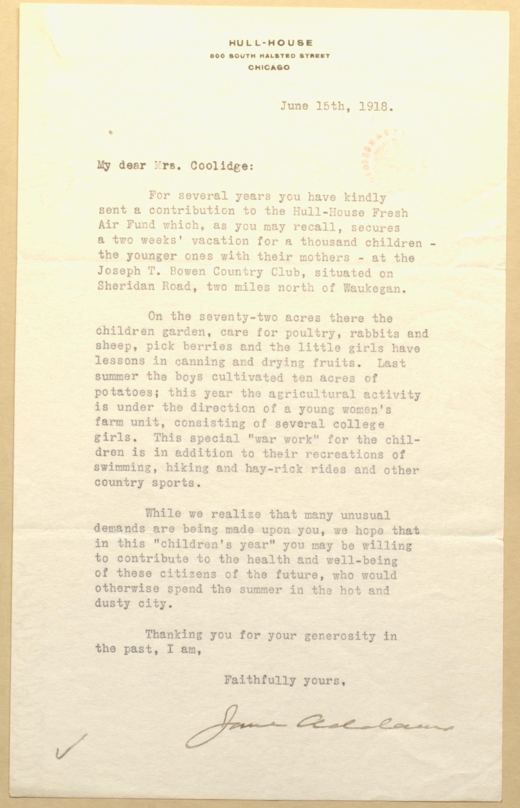 For several years you have kindly sent a contribution to the Hull-House Fresh Air Fund which, as you may recall, secures a two weeks' vacation for a thousand children -- the younger ones with their mothers -- at the Joseph T. Bowen Country Club, situated on Sheridan Road, two miles north of Waukegan.