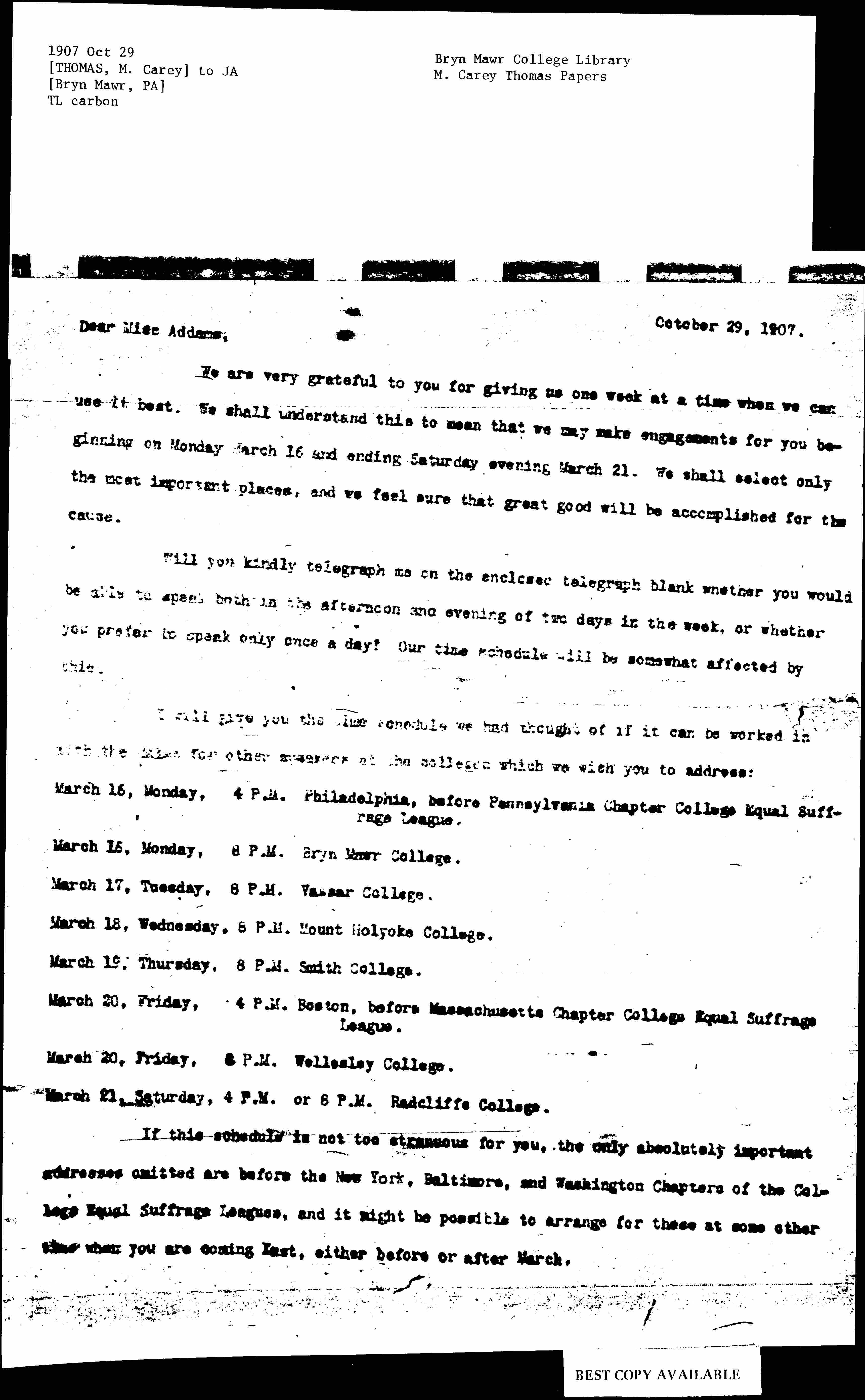 If this schedule is not too strenuous for you, the only absolutely important addresses omitted are before the New York, Baltimore, and Washington Chapters of the College Equal Suffrage Leagues, and it might be possible to arrange for these at some other time when you are coming East, either before or after March. [page 2]