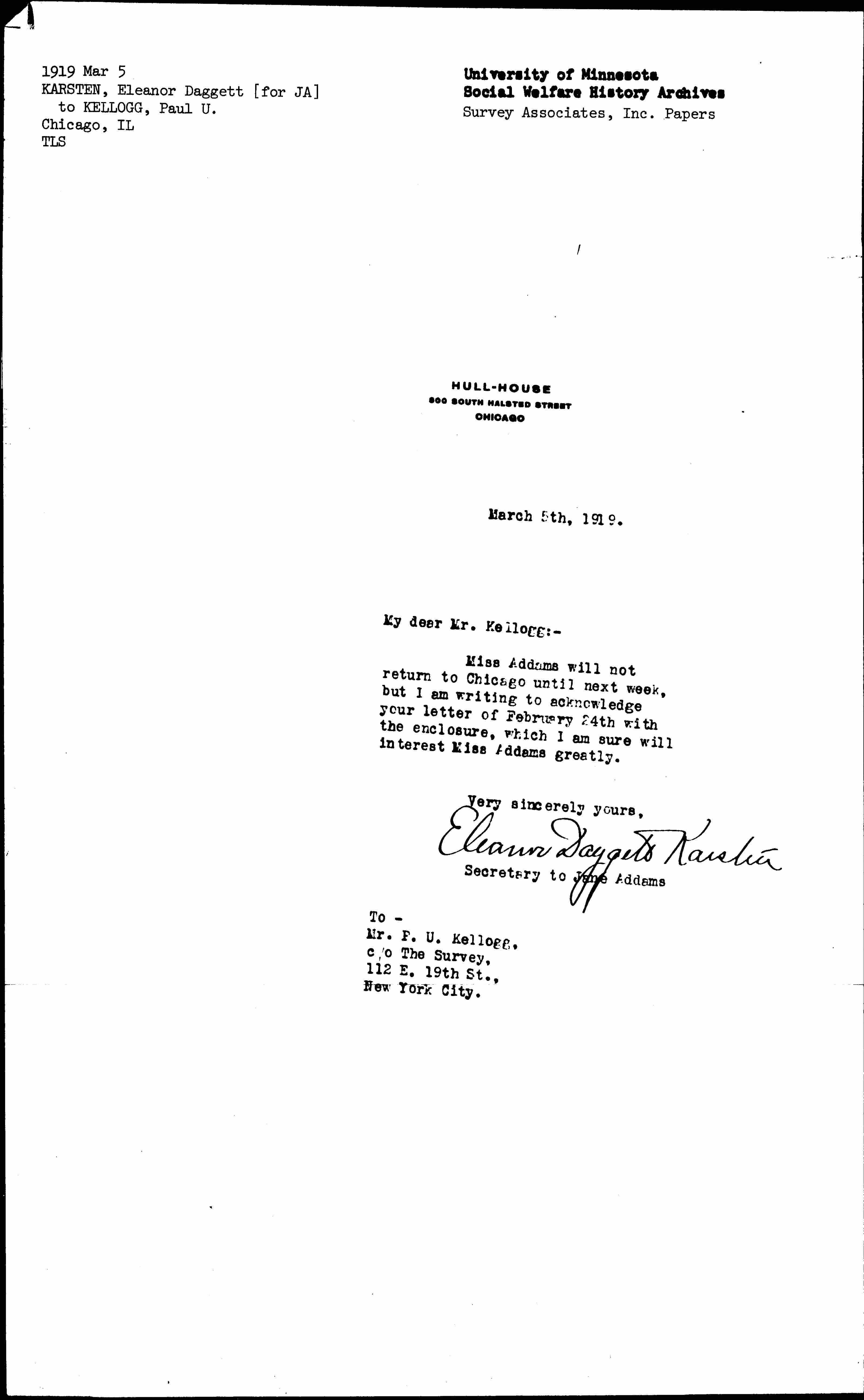 Miss Addams will not return to Chicago until next week, but I am writing to acknowledge your letter of February 24th with the enclosure, which I am sure will interest Miss Addams greatly.