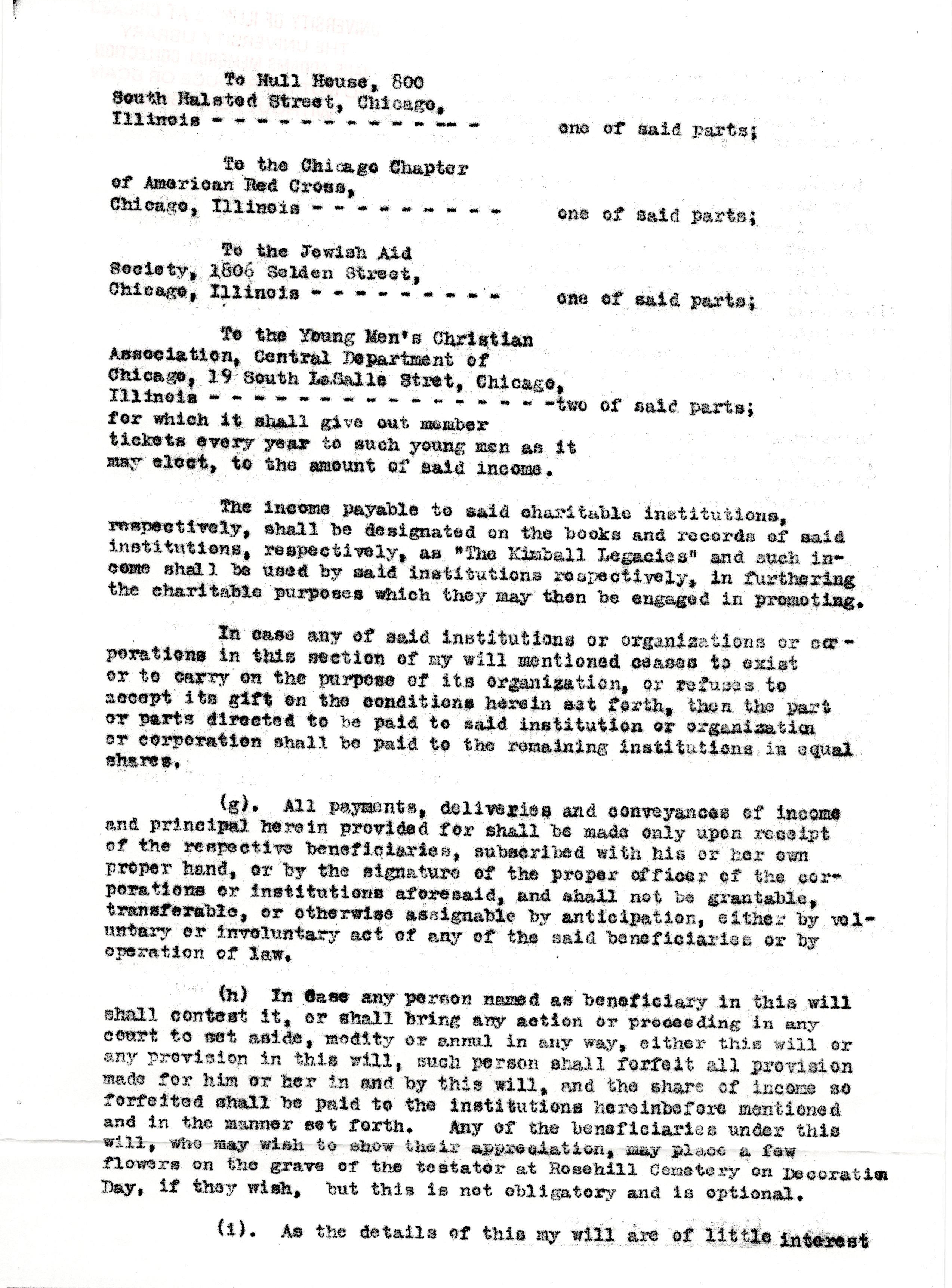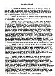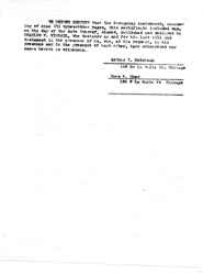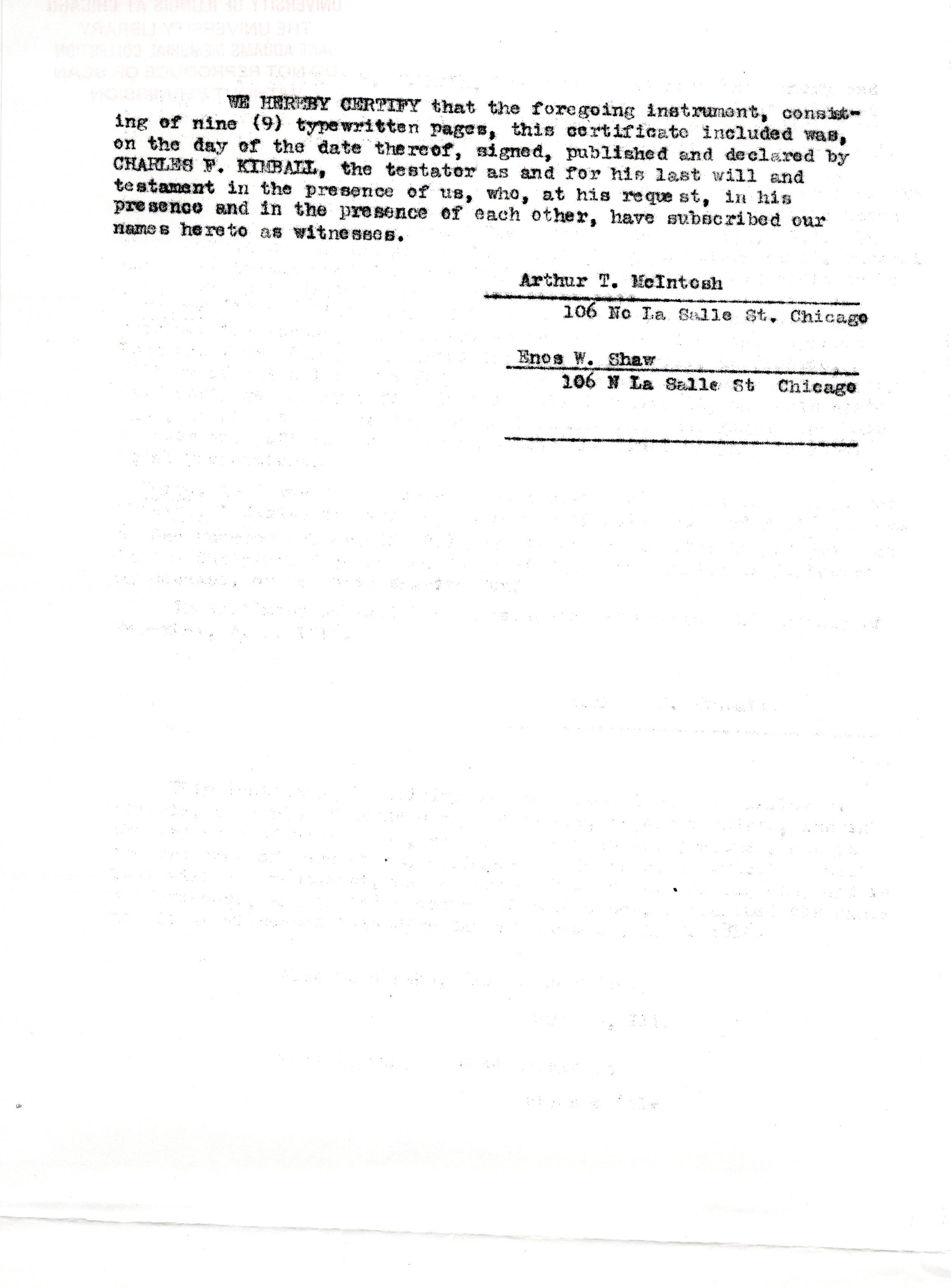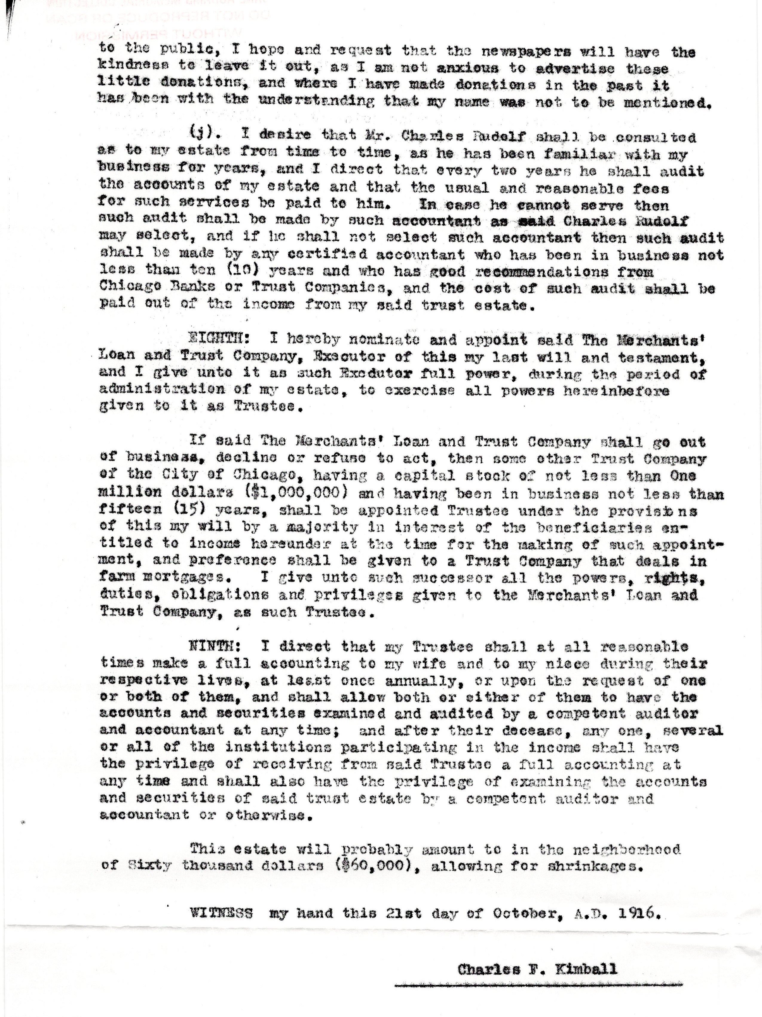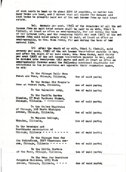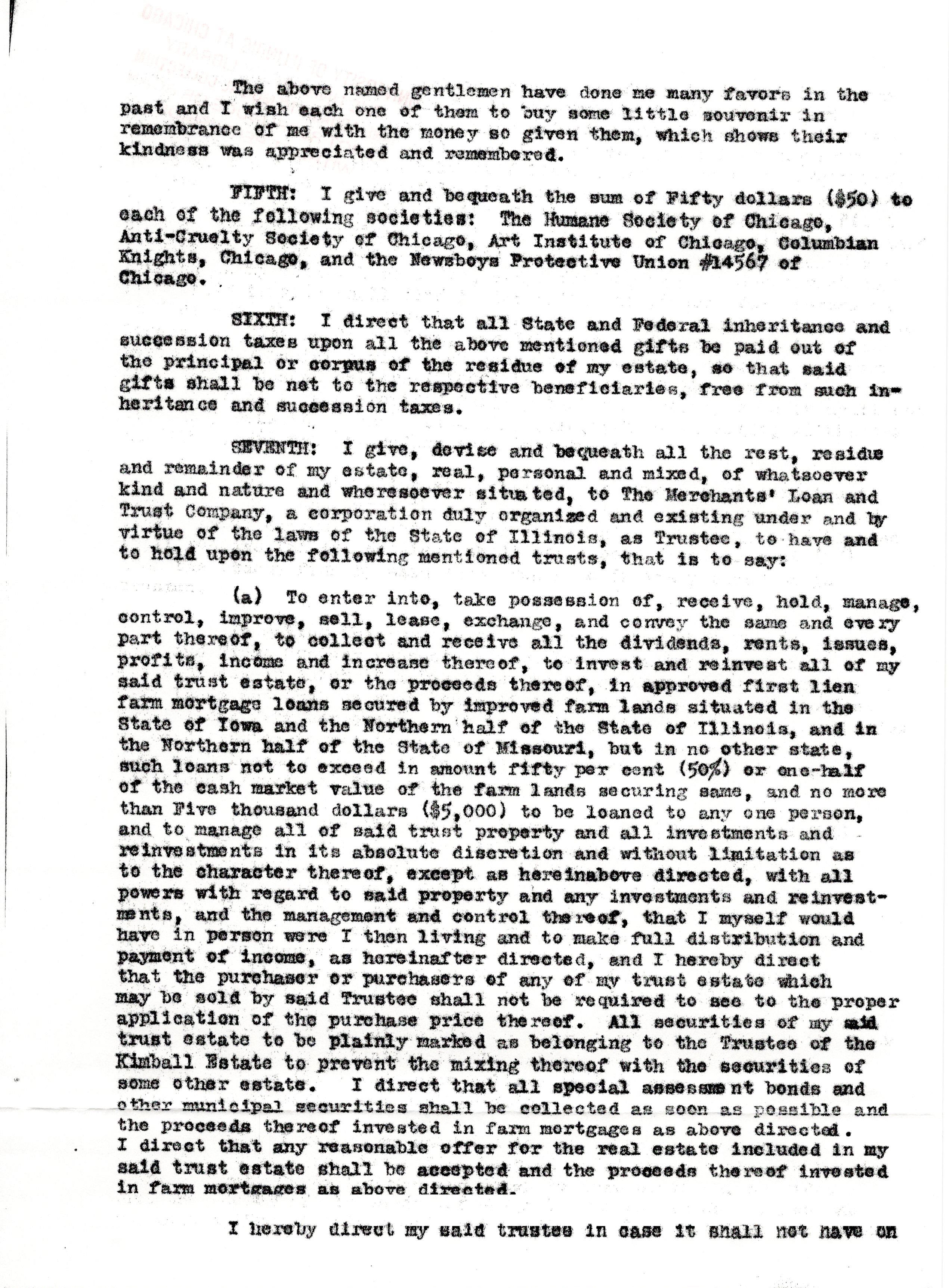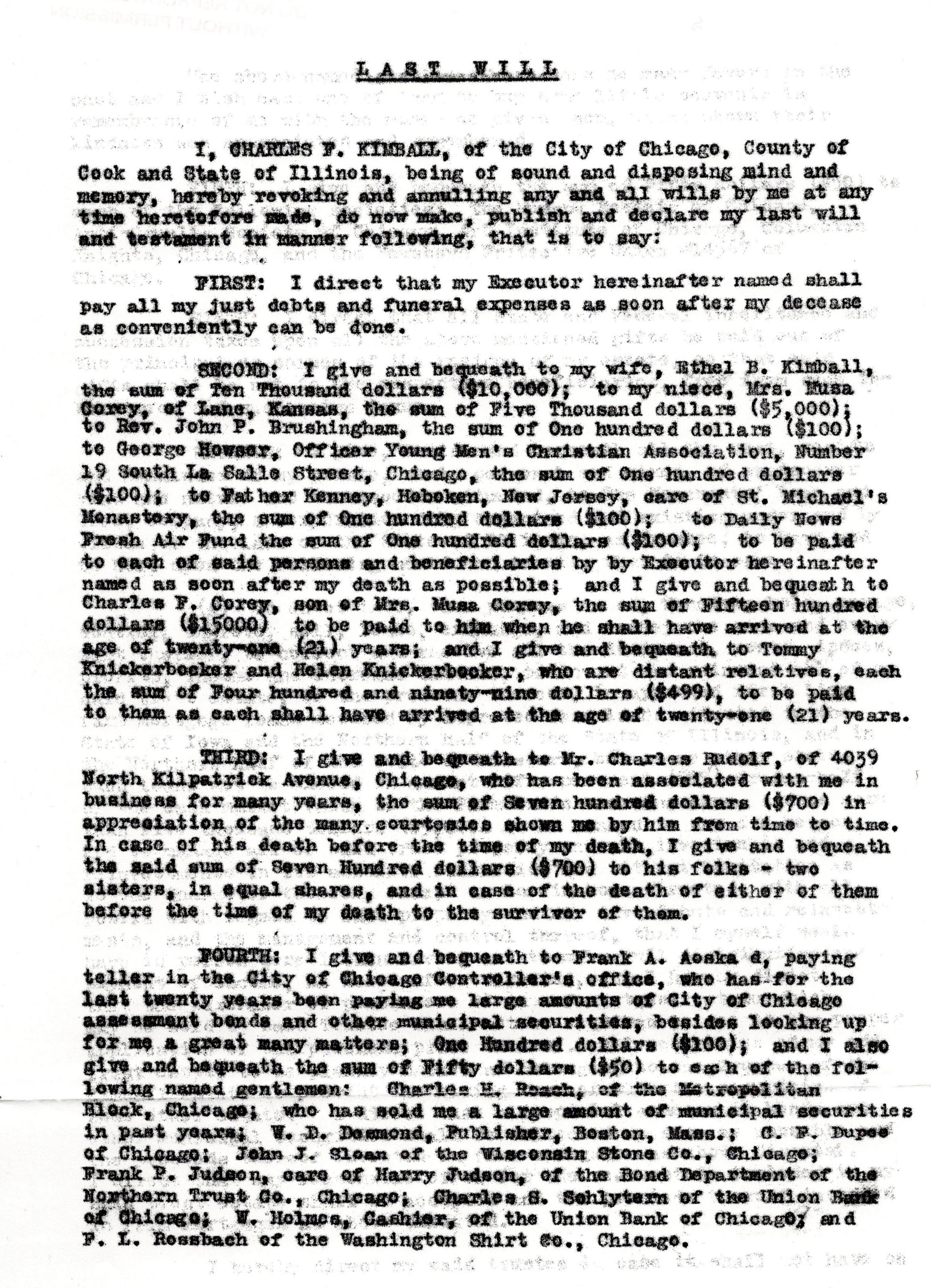 FOURTH: I give and bequeath to Frank A. [Aoskad], paying teller in the City of Chicago's Controller's office, who has for the last twenty years been paying me large amounts of City of Chicago assessment bonds and other municipal securities, besides looking up for me a great many matters; One Hundred dollars ($100); and I also give and bequeath the sum of Fifty dollars ($50) to each of the following named gentlemen: Charles H. Roach, of the Metropolitan Block, Chicago; who has sold me a large amount of municipal securities in past years; W. D. Desmond, Publisher, Boston, Mass.; C. F. Dupee of Chicago; John J. Sloan of the Wisconsin Stone Co., Chicago; Frank P. Judson, care of Harry Judson, of the Bond Department of the Northern Trust Co., Chicago; Charles S. Schlytern of the Union Bank of Chicago; W. Holmes, Cashier, of the Union Bank of Chicago; and F. L. Rossbach of the Washington Shirt Co., Chicago. [page 2]