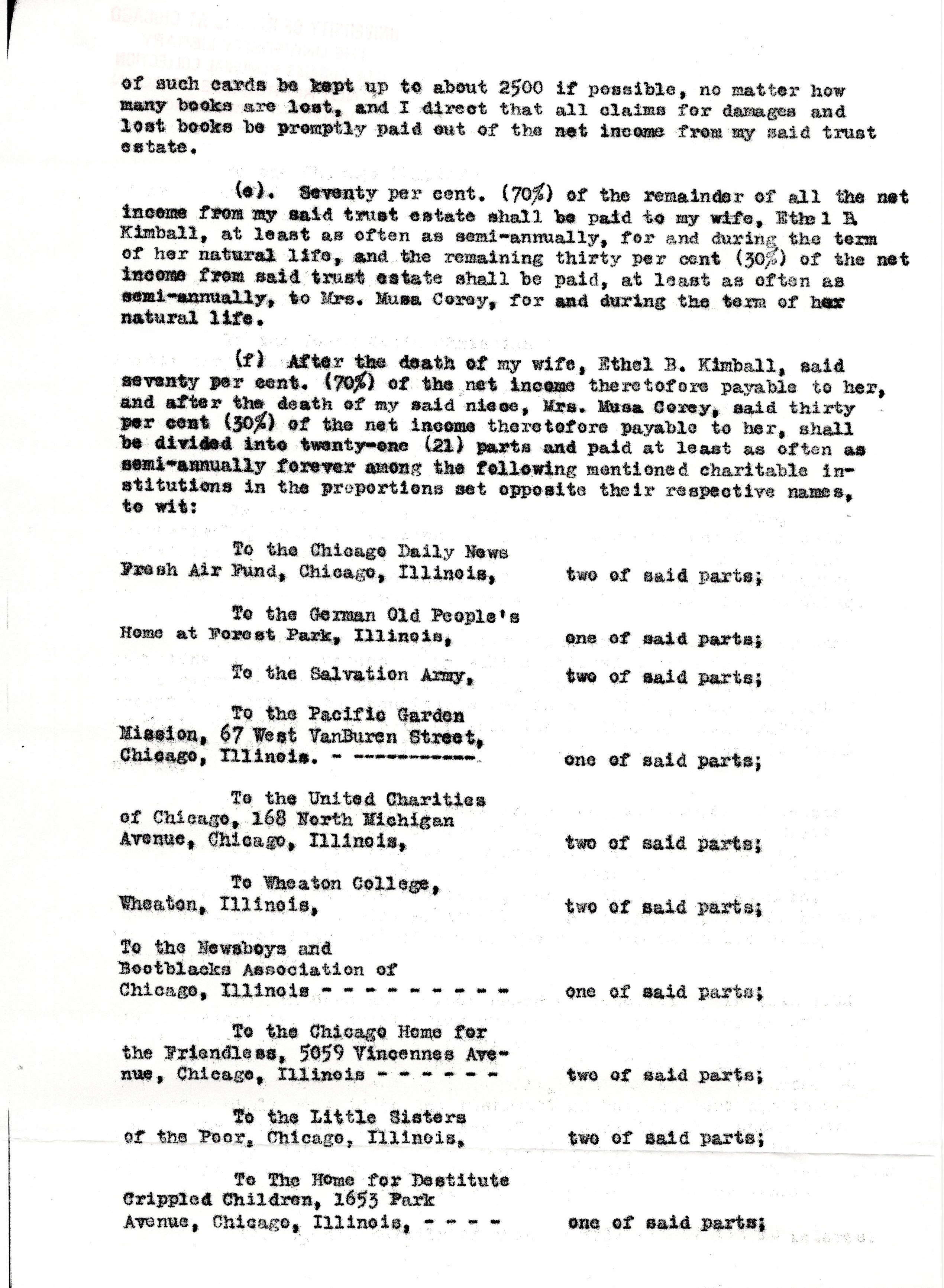 (f) After the death of my wife, Ethel B. Kimball, said seventy [percent] (70%) of the net income theretofore payable to her, and after the death of my said niece, Mrs. Musa Corey, said thirty [percent] (30%) of the net income theretofore payable to her, shall be divided into twenty-one (21) parts and paid at least as often as semi-annually forever among the following mentioned charitable institutions in the proportions set opposite their respective names, to wit: