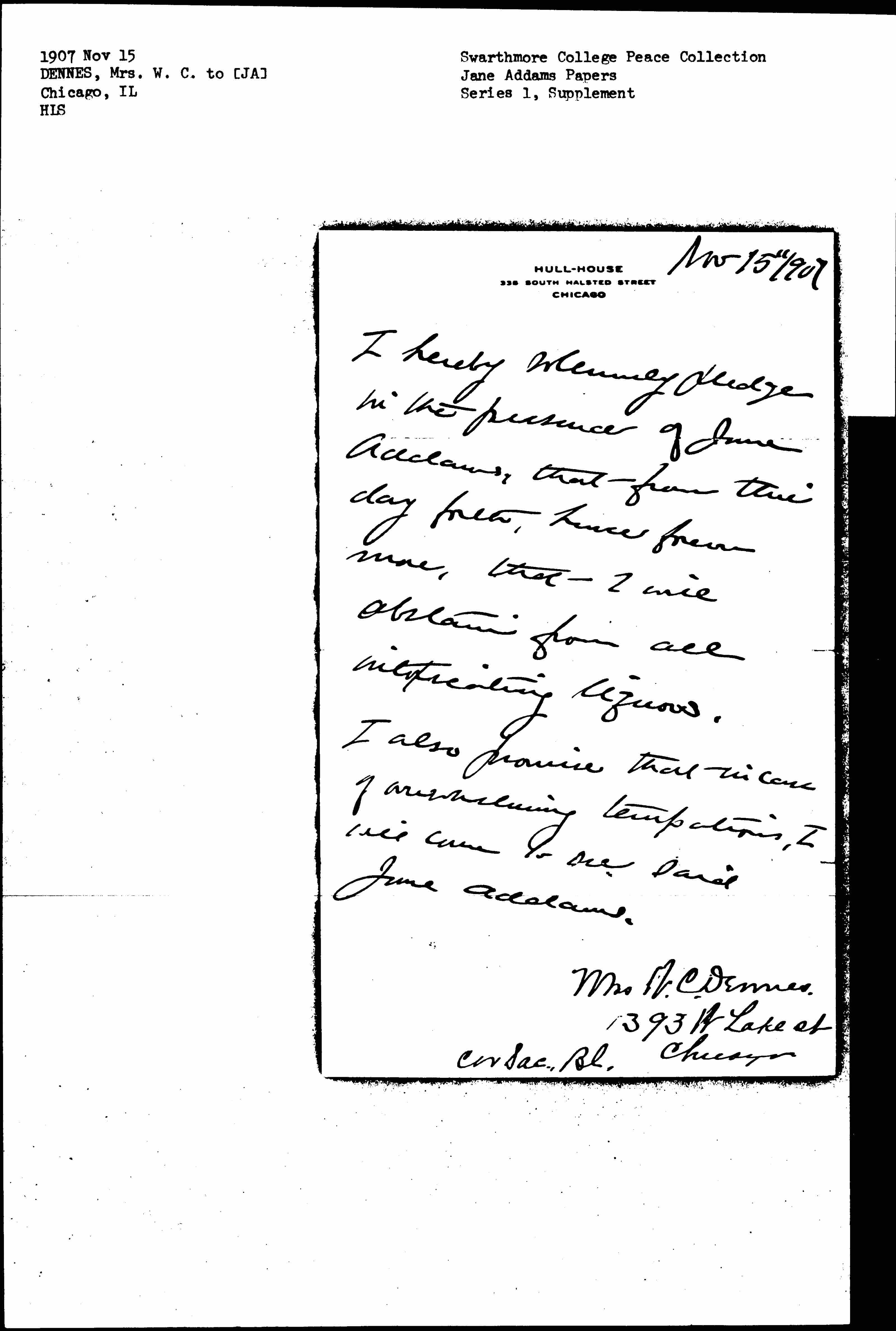 I also promise that in case of overwhelming temptations, I will come to see said Jane Addams.