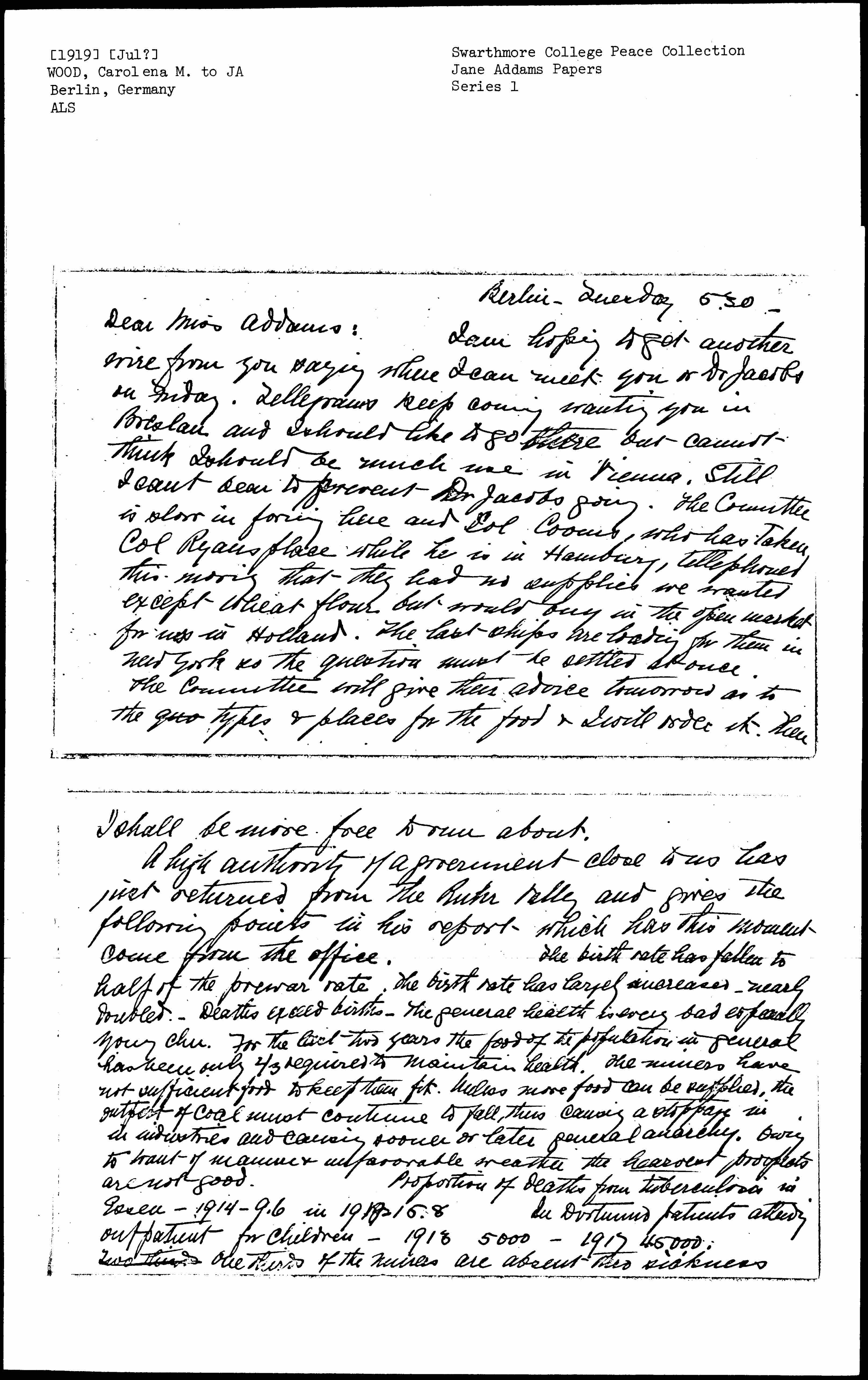 I am hoping to get another wire from you saying where I can meet you or Dr Jacobs on Friday. Telegrams keep coming wanting you in Breslau and I should like to go there but cannot think I should be much use in Vienna. Still I can't bear to prevent Dr Jacobs going. The Committee is slow in forming here and Col. [Coombs], who has taken Col Ryans place while he is in Hamburg, telephoned this morning that they had no supplies we wanted except wheat flour but would buy in the open market for us in Holland. The last ships are loading for them in New York so the question must be settled at once.