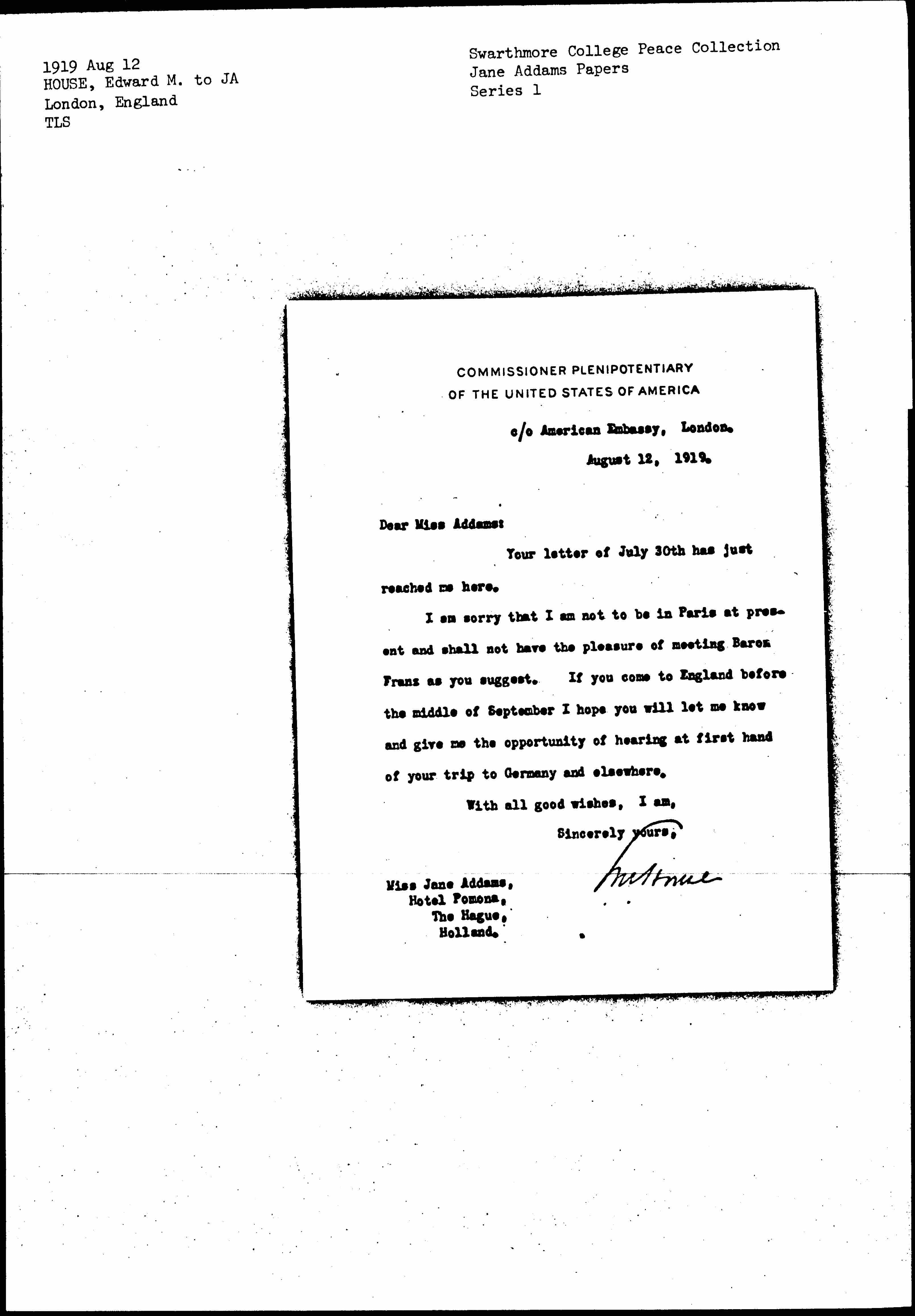 I am sorry that I am not to be in Paris at present and shall not have the pleasure of meeting Baron Franz as you suggest. If you come to England before the middle of September I hope you will let me know and give me the opportunity of hearing at first hand of your trip to Germany and elsewhere.