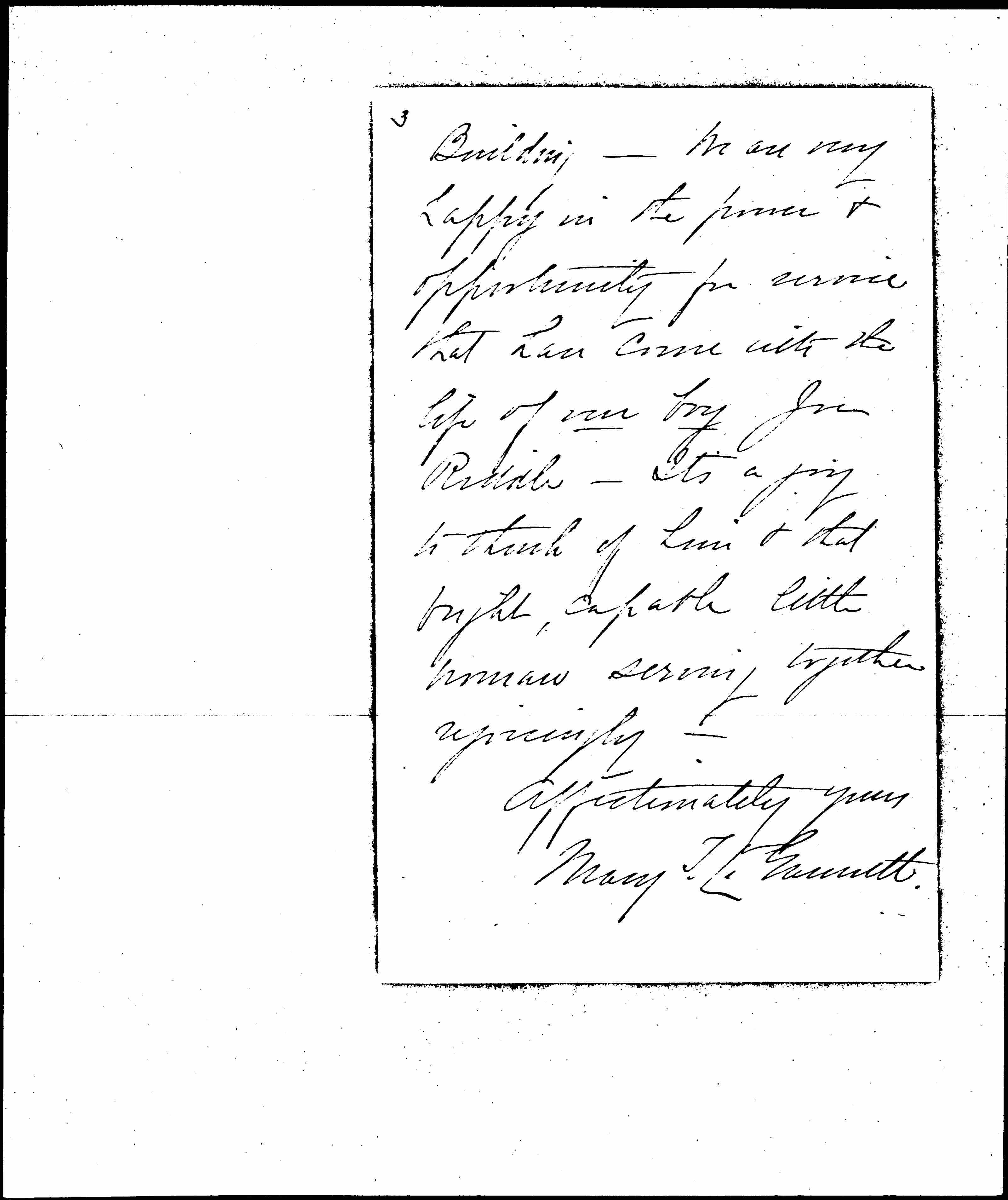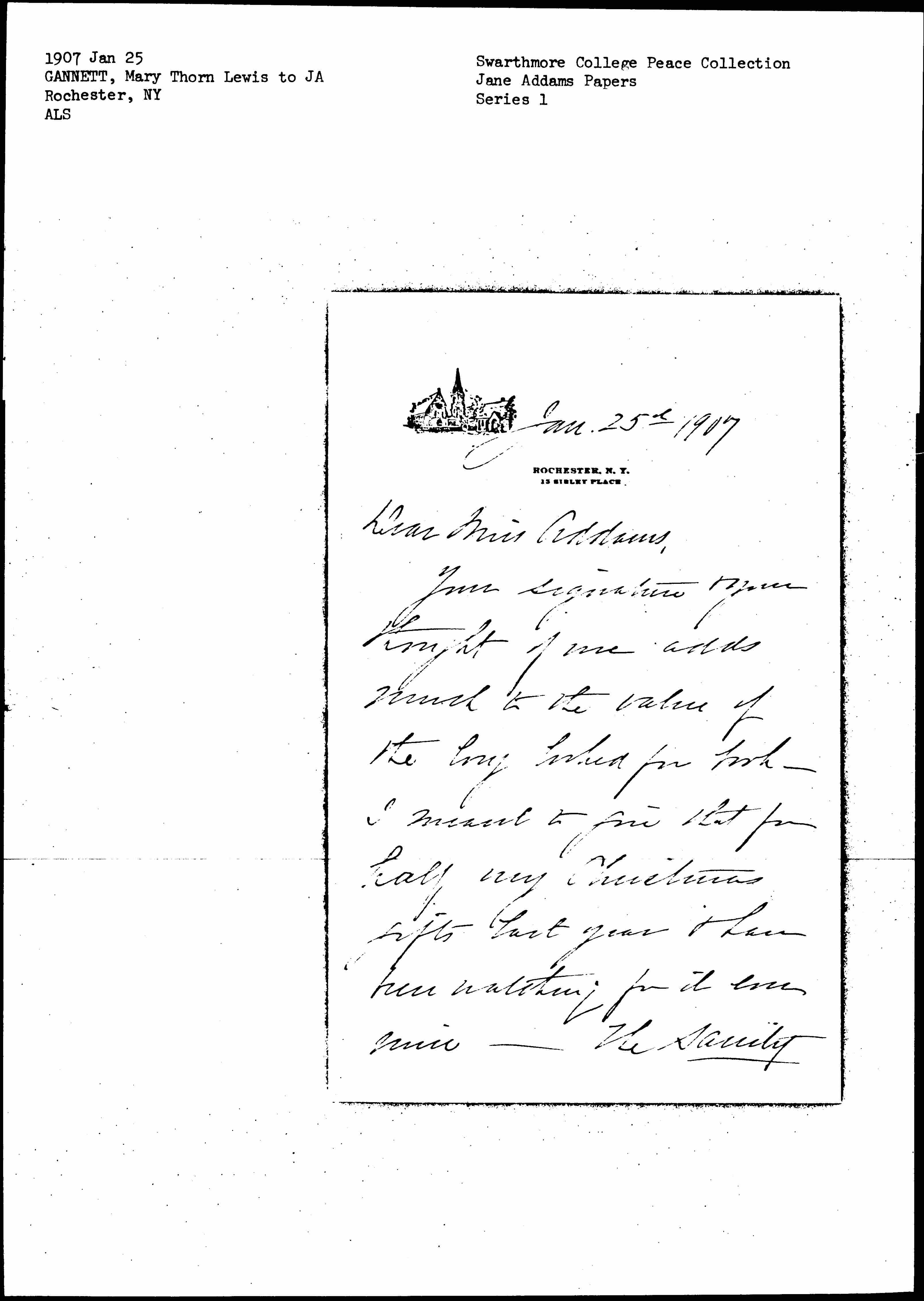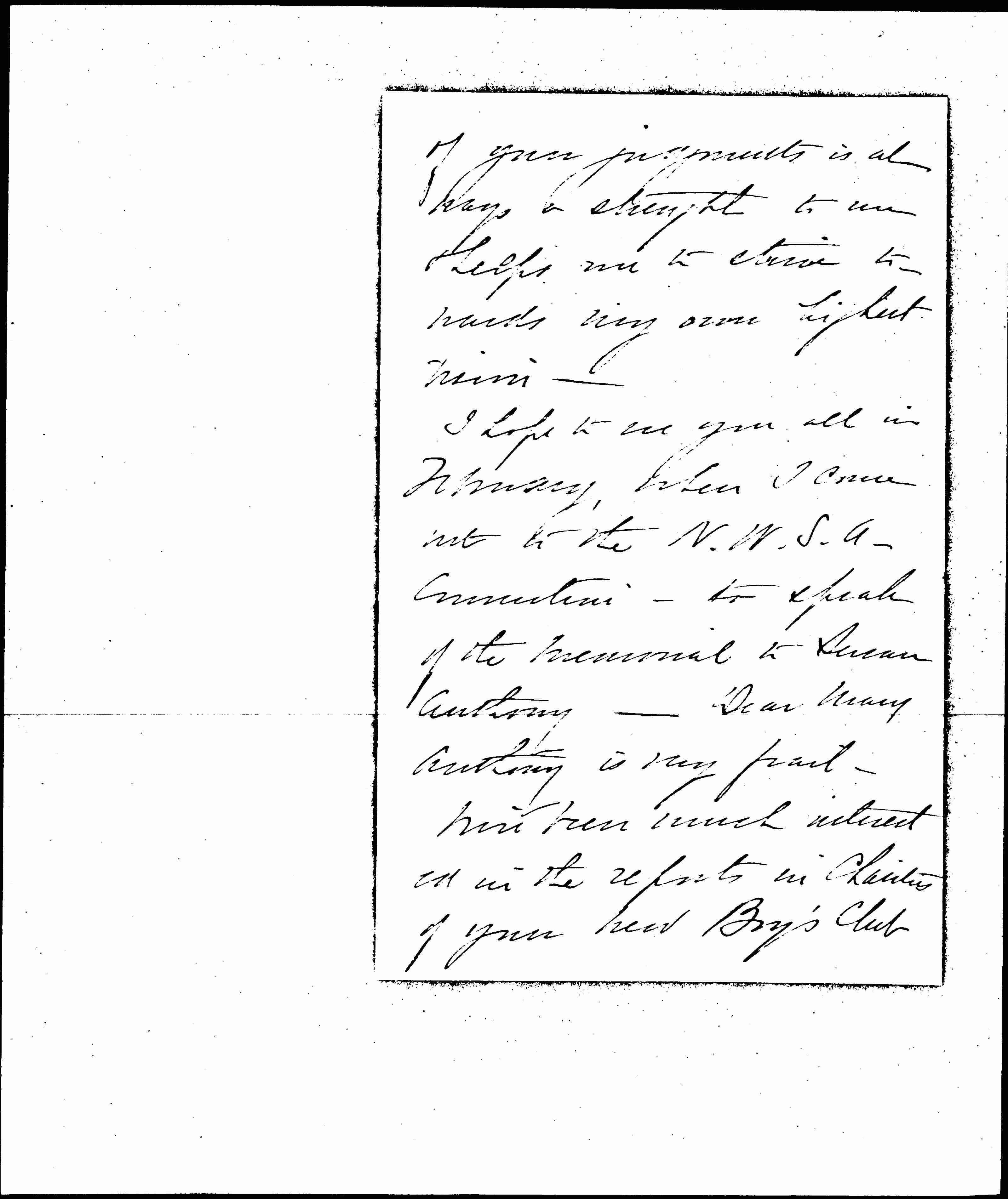 I hope to see you all in February, when I come out to the N. W. S. A. convention -- to speak of the memorial to Susan Anthony-- Dear Mary Anthony is very frail-- We've been much interested in the reports in Charities of your new Boy's Club [page 3] Building-- We are very happy in the [power] & opportunity for service that [have] come with the life of our boy Joe Riddle-- It's a joy to think of him & that bright, capable little woman serving together [rejoicingly]--