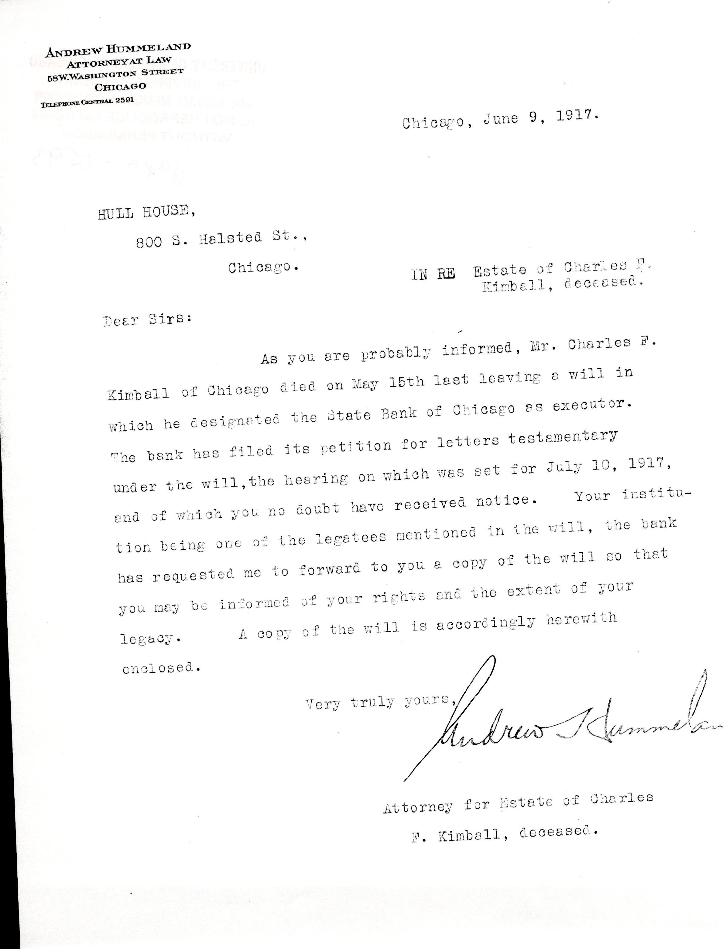 As you are probably informed, Mr. Charles F. Kimball of Chicago died on May 15th last leaving a will in which he designated the State Bank of Chicago as executor. The bank has filed its petition for letters testamentary under the will, the hearing on which was set for July 10, 1917, and of which you no doubt have received notice. Your institution being one of the legatees mentioned in the will, the bank has requested me to forward to you a copy of the will so that you may be informed of your rights and the extent of your legacy. A copy of the will is accordingly herewith enclosed.