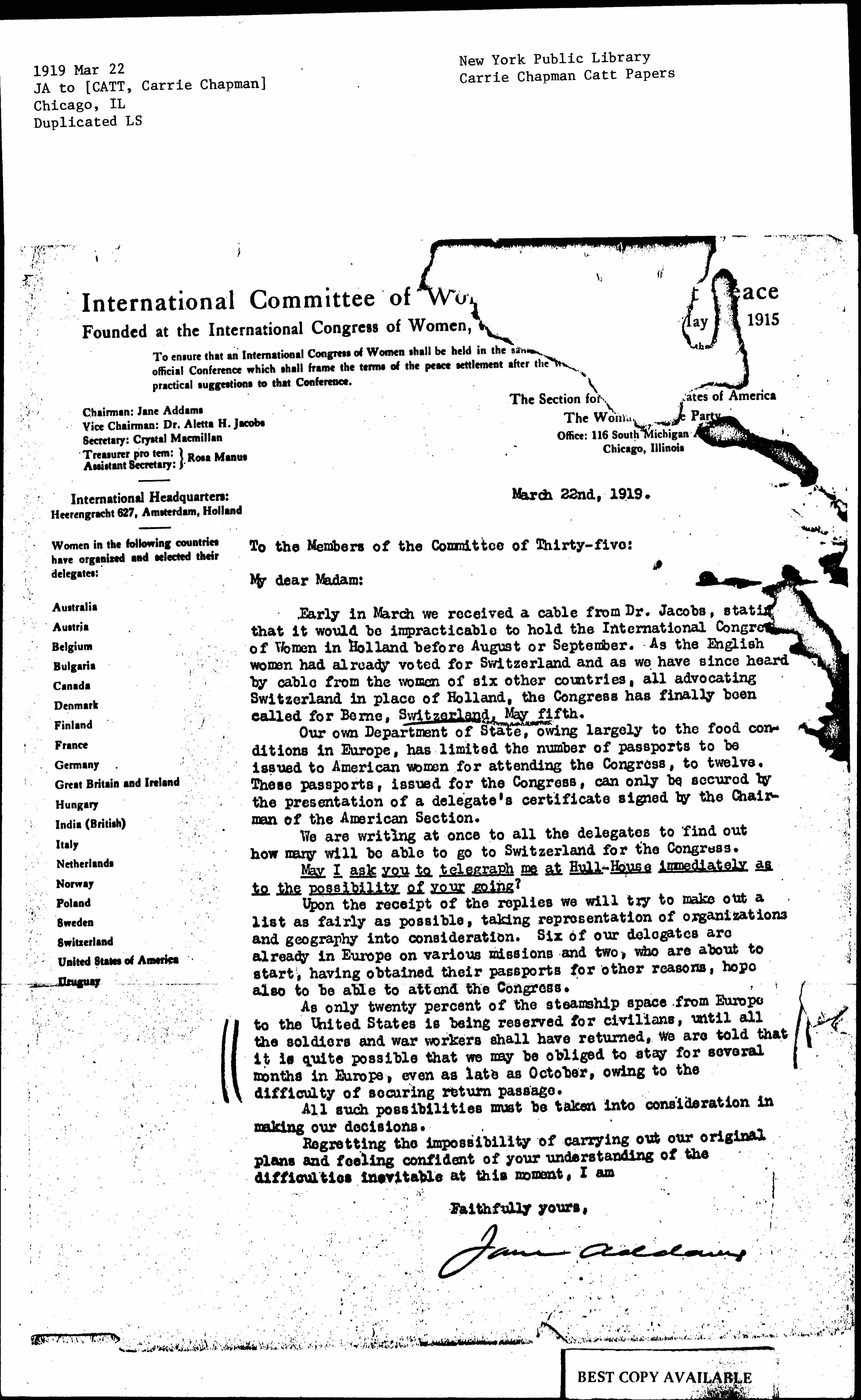 Our own Department of State, owing largely to the food conditions in Europe, has limited the number of passports to be issued to American women for attending the Congress, to twelve. These passports, issued for the Congress, can only be secured by the presentation of a delegate's certificate signed by the Chairman of the American Section.