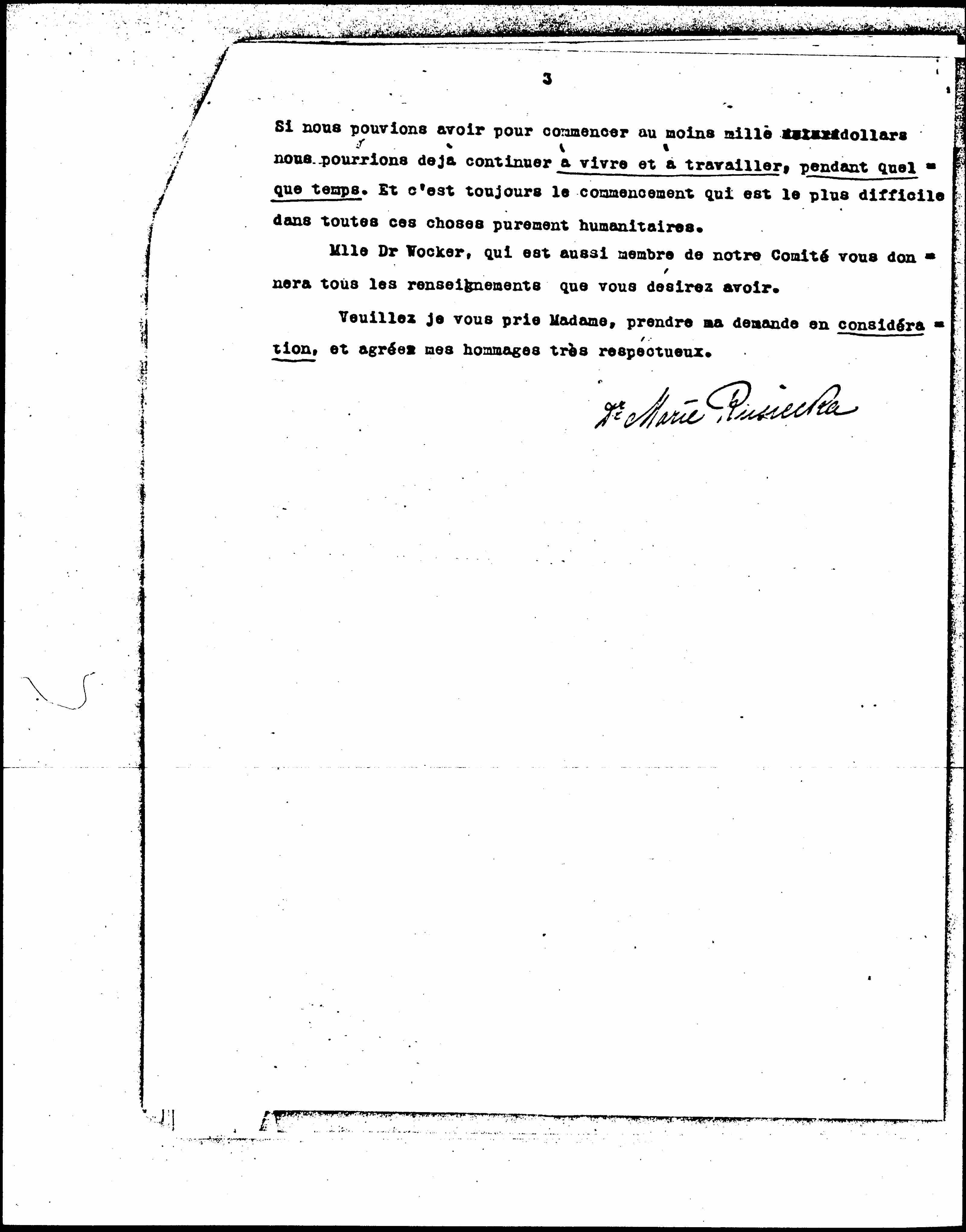 In any case, I trust my request, and our cause in your hands, and I warmly recommend it to your heart. [page 3] If we could have at least a thousand [illegible] dollars to start with, we could already continue to live and work for some time. And it is always the beginning that is the most difficult in all these purely humanitarian things.