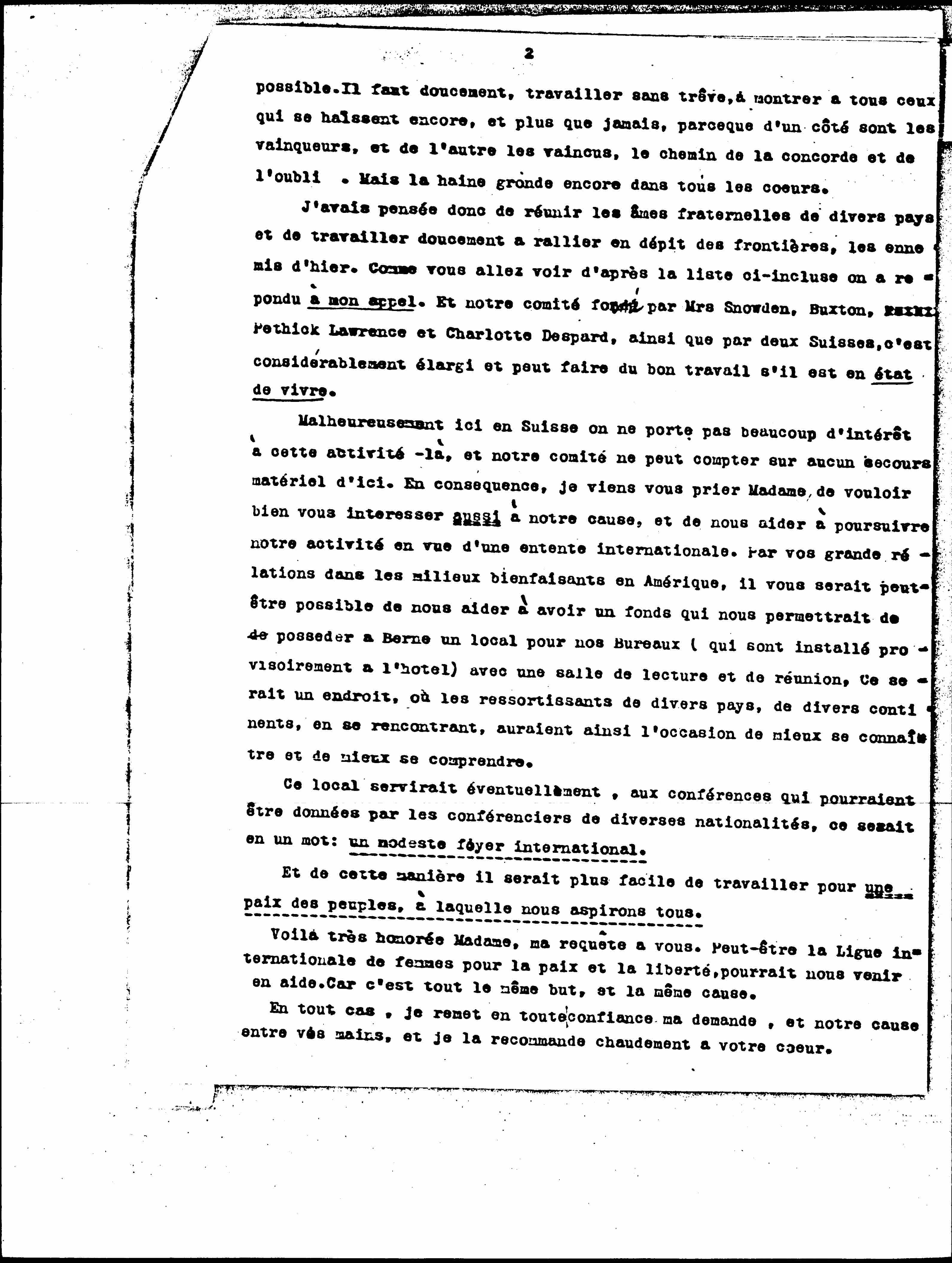 Unfortunately here in Switzerland there is not much interest in this activity, and our committee cannot count on any material help from here. Consequently, I come to ask you Madam to be kind enough to also interest you in our cause, and to help us to continue our activity with a view to an international understanding. By your great relationships in the beneficent circles in America, it might be possible for you to help us to have a fund which would allow us to have in Bern a room for our Offices (which are temporarily installed in the hotel) with a room of reading and meeting, it would be a place where nationals of various countries, from various continents, by meeting, would have the opportunity to get to know and understand each other better.This room would eventually be used for conferences that could be given by speakers of various nationalities, in one word: a modest international fairy. And in this way it would be easier to work for a peace of peoples, to which we all aspire.