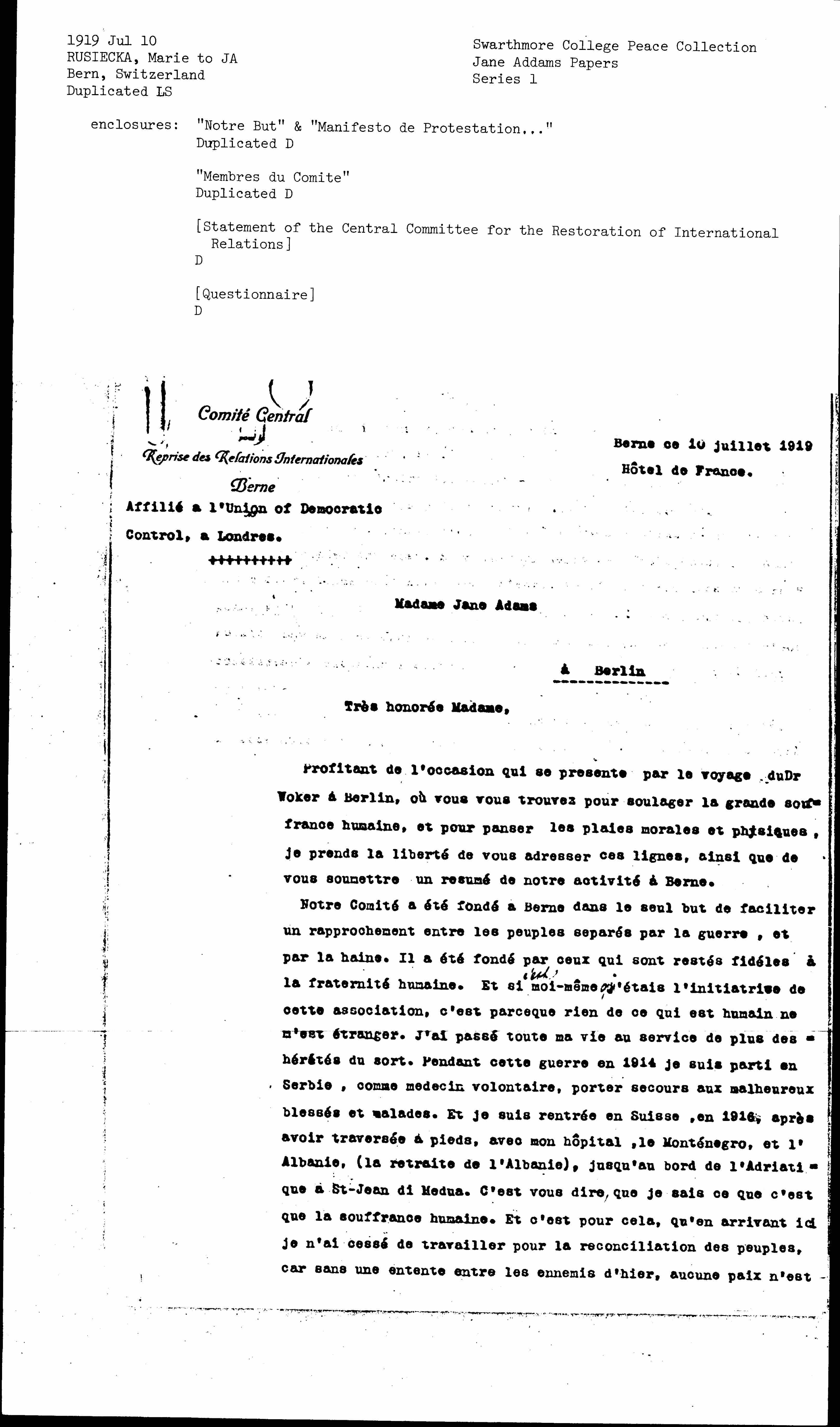 Our Committee was founded in Bern with the sole aim of facilitating rapprochement between peoples separated by war and by hatred. It was founded by those who have remained loyal to human brotherhood. And if I myself was the initiator of this association, it is because nothing that is human is foreign. I have spent my entire life serving more than the odd heroes. During this war in 1914 I went to Serbia, as a volunteer doctor, to help the unfortunate wounded and sick. And I returned to Switzerland, in 1916, after crossing on foot, with my hospital, Monténegro, and Albania, (the retreat of Albania), to the edge of the Adriati that in St-Jean di Medua. You are saying that I know what human suffering is. And that is why, when I got here I never stopped working for the reconciliation of peoples, because without an agreement between the enemies of yesterday, no peace is [page 2] possible. It is necessary slowly, to work without truce, to show to all those who still hate each other, and more than ever, because on one side are the victors, and on the other the vanquished, the path of harmony and oblivion . But hatred still roars in all hearts.