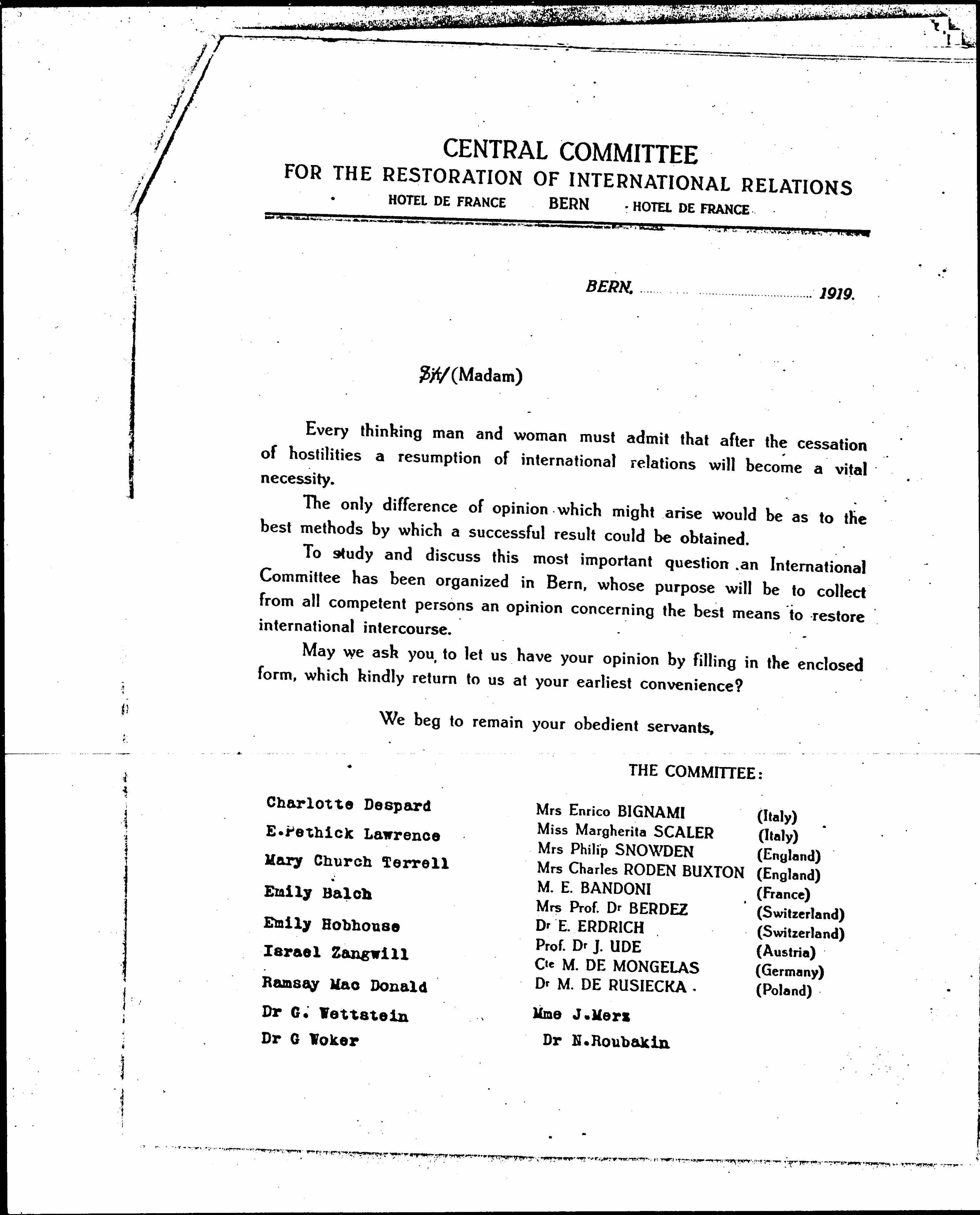 To study and discuss this most important question an International Committee has been organized in Bern, whose purpose will be to collect from all competent persons an opinion concerning the best means to restore international intercourse.
