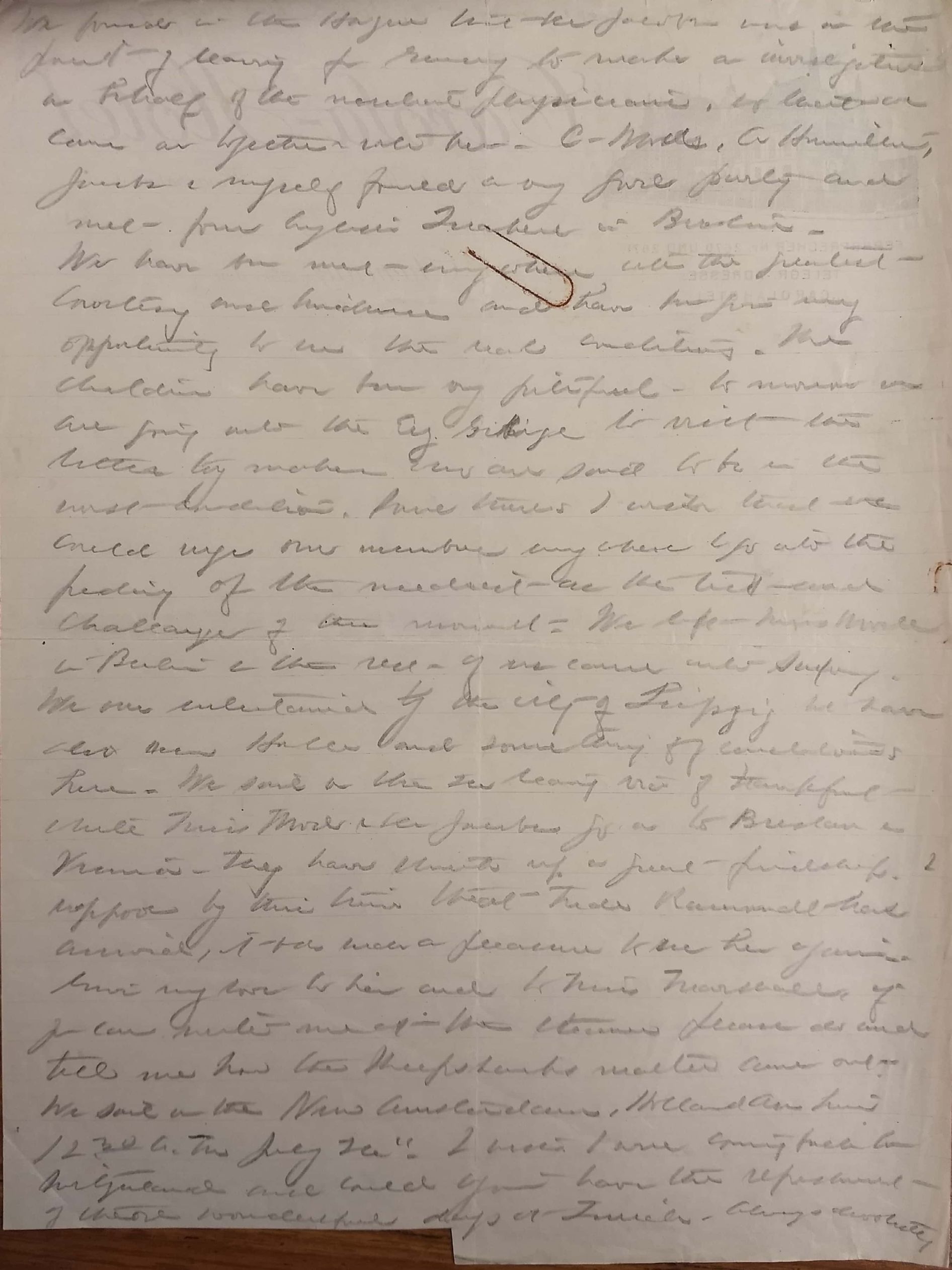 We have been met everywhere with the greatest courtesy and kindness and have been given every opportunity to see the real conditions. The children have been very pitiful -- [tomorrow] we are going into the [Erzgebirge] to visit the little toy makers who are said to be in the worst condition. Some times I wish that we could urge our members every where to go into the feeding of the neediest as the [test case?] challenges of the [moment?]. We left Miss Wood in Berlin & the rest of us came into Saxony. We are entertained by the city of Leipzig we have also seen Halle and something of conditions here. We sail on the [sea] [illegible] [view?] of Frankfurt while Miss Wood & Dr Jacobs go on to Breslau & Vienna -- they have struck up a great friendship. I suppose by this time that Mde Ramondt has arrived, it was such a pleasure to see her again. Give my love to her and to Miss Marshall if you can write me at the steamer please do and tell me how the Sheepshanks matter came out. We sail on the New Amsterdam, Holland Am Line 12:30 a.m. July 26". I wish I were coming back to Switzerland and could again have the refreshment of those wonderful days at Zurich. Always devotedly [signature cut out of letter].