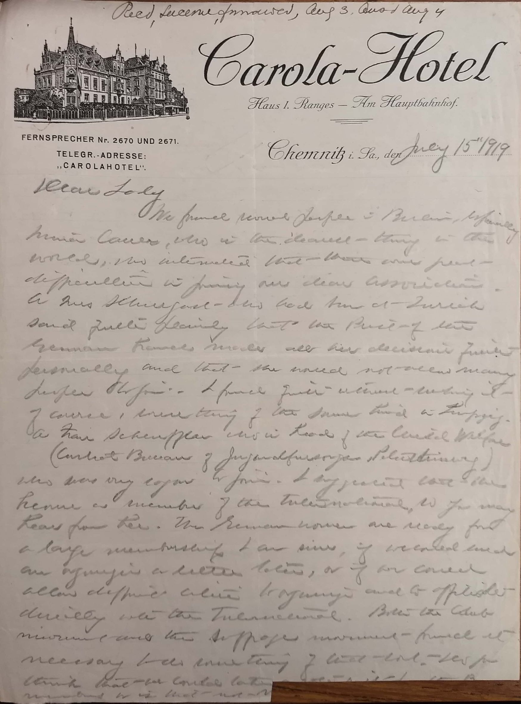 We found several people in Berlin, especially Minna Cauer, who is the dearest thing in the world, who intimated that there are great difficulties in joining our dear association. A Mrs Schurgast who had been at Zurich said quite plainly that the Pres't of the German branch made all her decisions quite personally and that she would not allow many people to join. I found quite without seeking it of course, something of the same kind in Leipzig. A Frau Scheuffler who is head of the Child Welfare (Control Bureau of Jugandfursorge, [illegible]) who was very eager to join. I suggested that she become a member of the International, so you may hear from her. The German women are ready for a large membership I am sure, if we could send an organizer a letter later, or if we could allow different cities to organize and to affiliate directly with the International. Both the club movement and the suffrage movement found it necessary to do something of that sort. Do you think that we could take [a vote] [page torn] members or is that not [page torn]