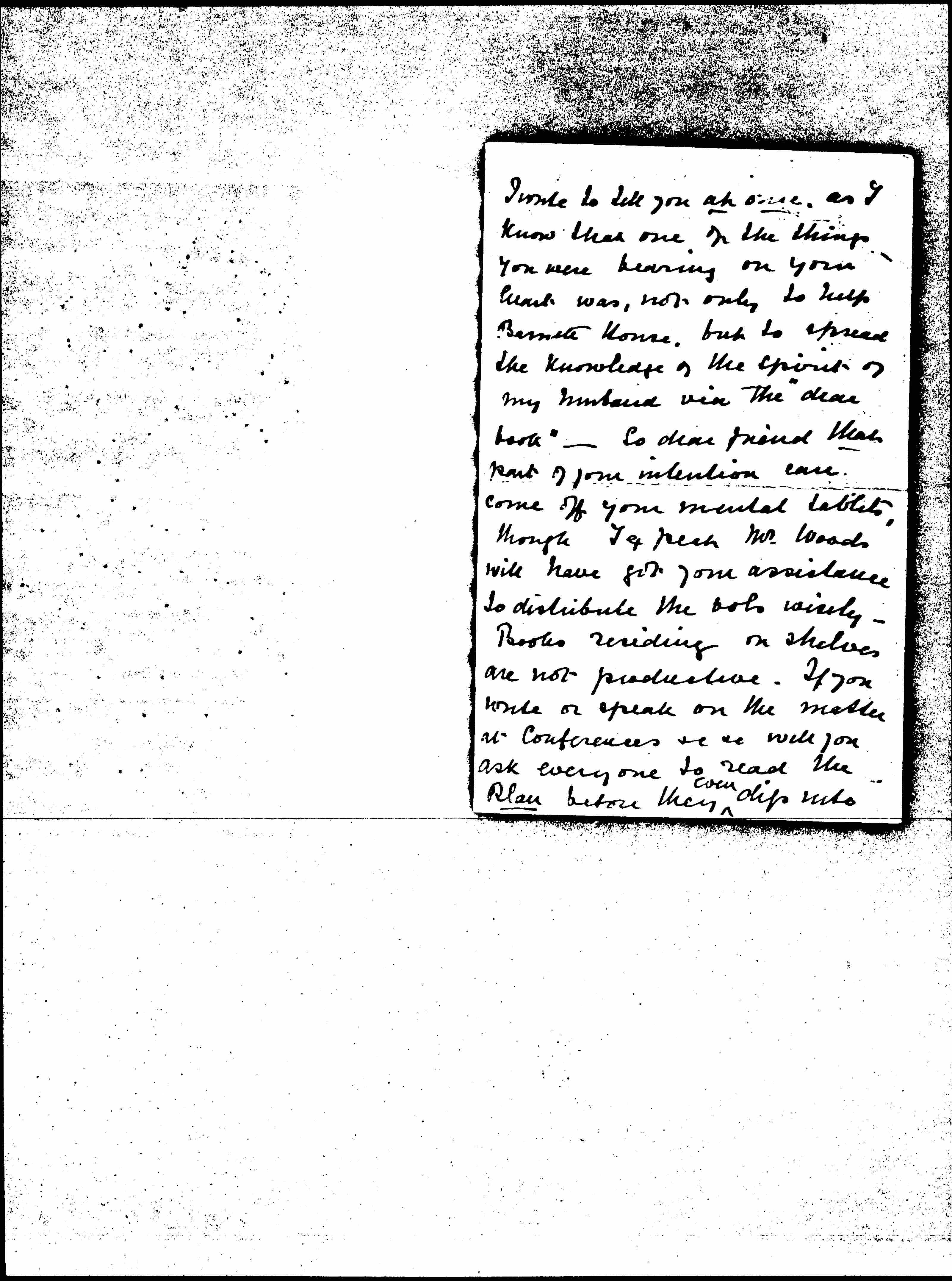 I have just heard from Mr Robt Woods that he has received a gift from Mr Galen Stone which enables him to send to each Settlement in America a copy of our Canons Life. I am so very very pleased & so [page 2] I write to tell you at once, as I know that one of the things you were bearing on your heart was, not only to help Barnett House, but to spread the knowledge of the spirit of my husband via the "dear book" -- So dear friend, that part of your intention can come off your mental tablets, though I & [illegible] Mr Woods will have got your assistance to distribute the vols wisely -- Books residing on shelves are not productive. If you write or speak on the matter at Conferences [etc etc] will you ask everyone to read the Plan before they ↑even↓ dip into [written at the top of page 1] the book.