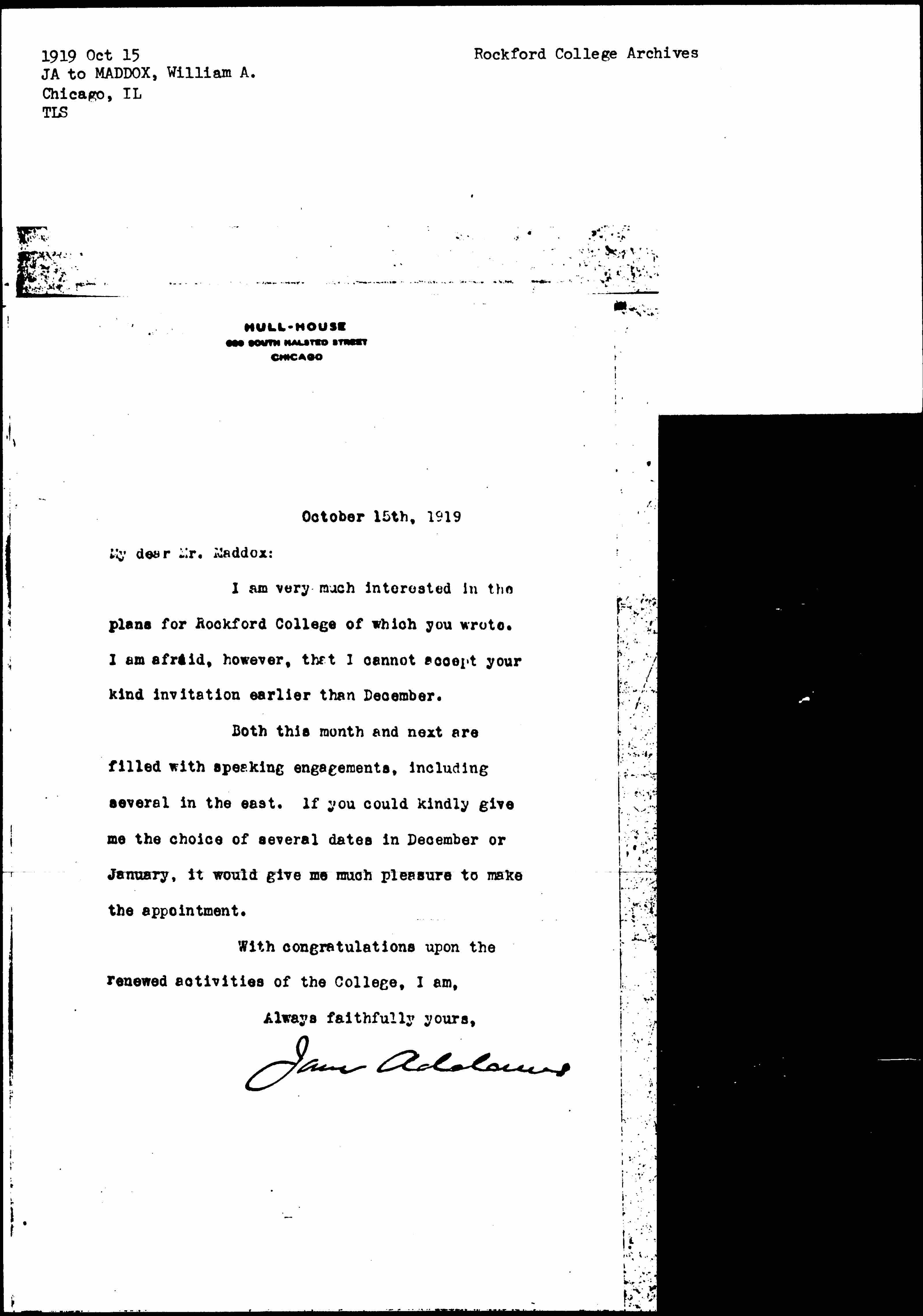 I am very much interested in the plans for Rockford College of which you wrote. I am afraid, however, that I cannot accept your kind invitation earlier than December.