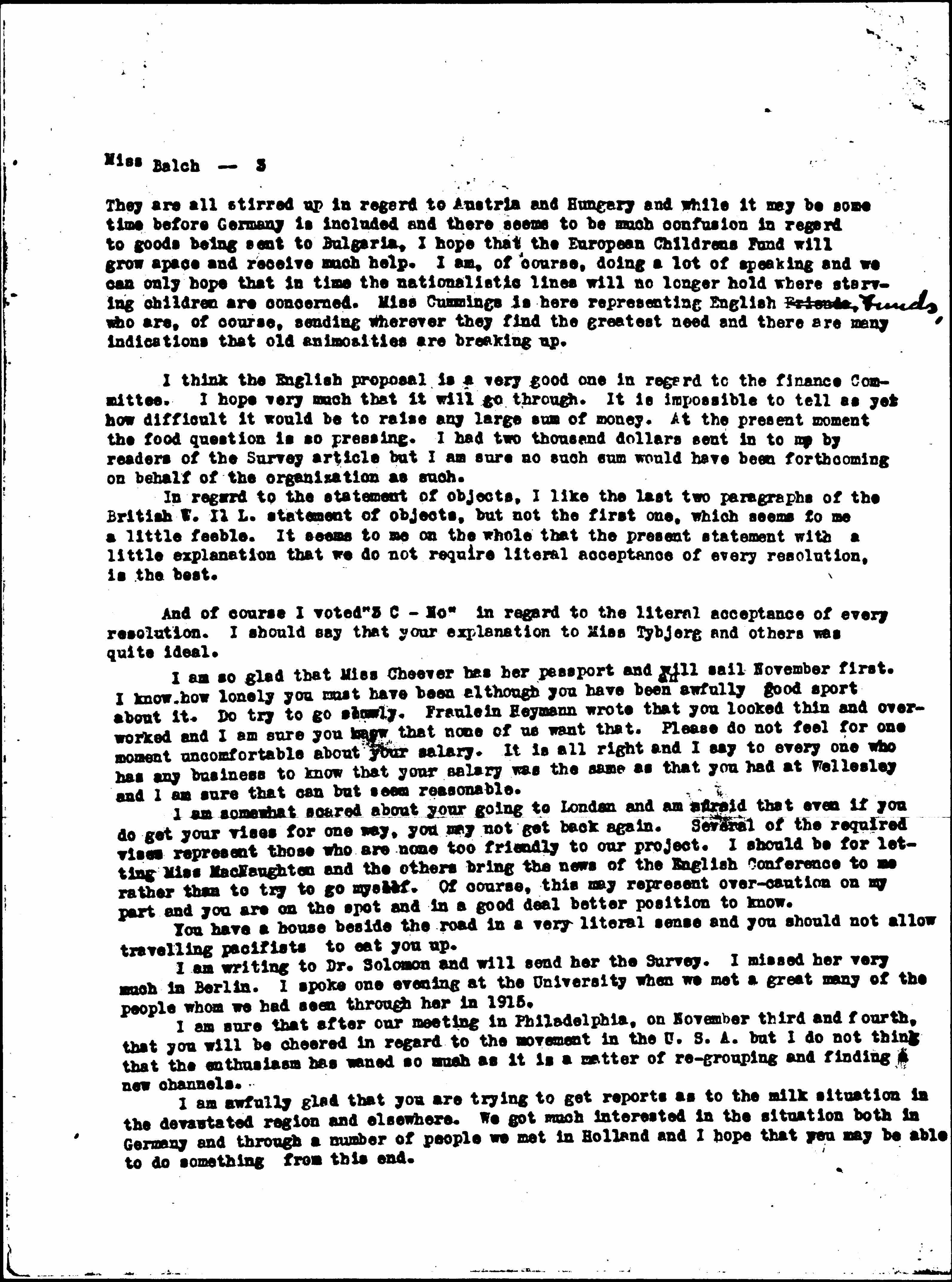They are all stirred up in regard to Austria and Hungary and while it may be some time before Germany is included and there seems to be much confusion in regard to goods being sent to Bulgaria, I hope that the European Childrens Fund will grow space and receive much help. I am, of course, doing a lot of speaking and we can only hope that in time the nationalistic lines will no longer hold where starving children are concerned. Miss [Cumming] is here representing English Friends ↑Funds,↓ who are, of course, sending wherever they find the greatest need and there are many indications that old animosities are breaking up.