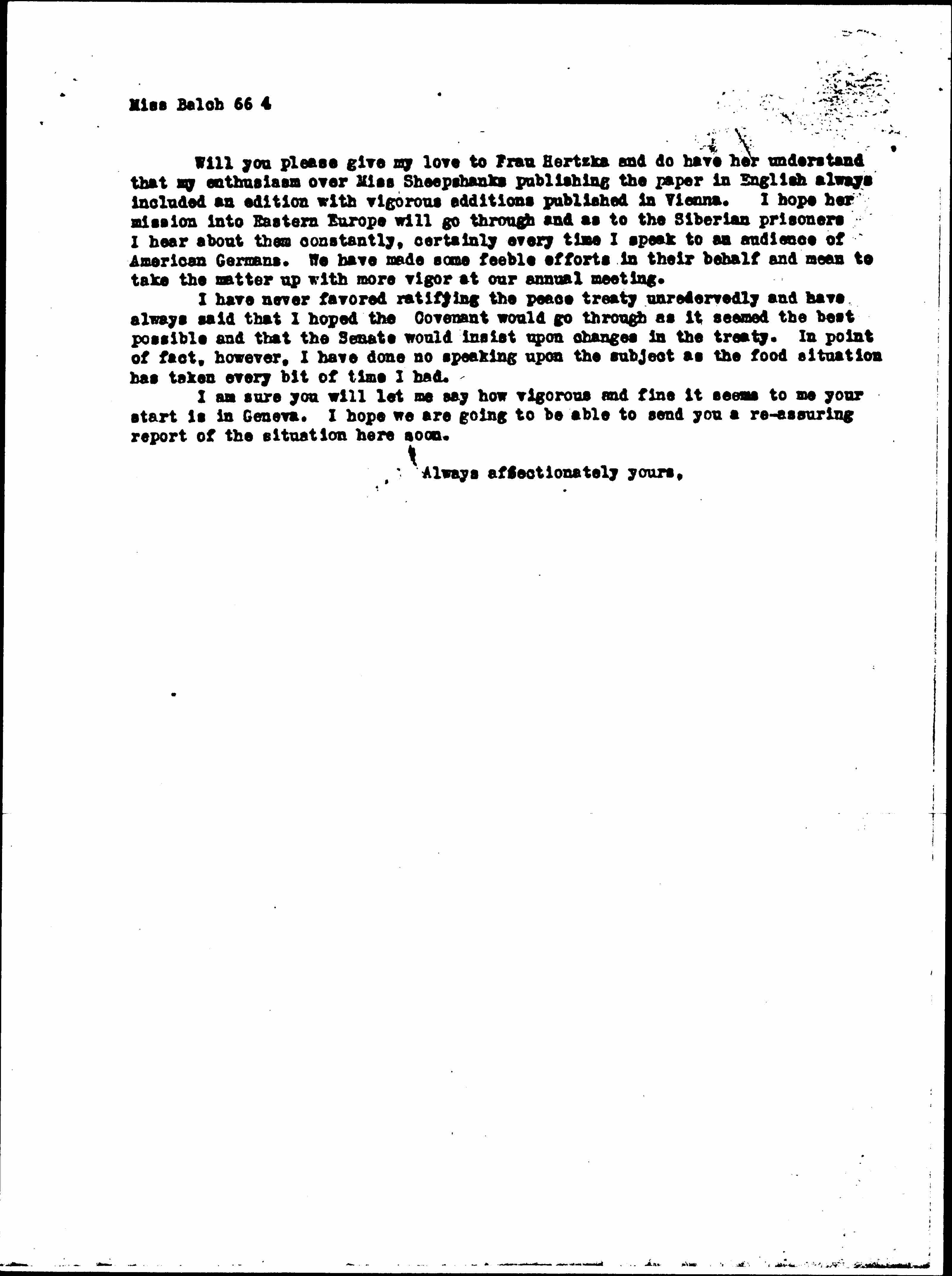 Will you please give my love to Frau Hertzka and do have her understand that my enthusiasm over Miss Sheepshanks publishing the paper in English always included an edition with vigorous additions published in Vienna. I hope her mission into Eastern Europe will go through and as to the Siberian prisoners I hear about them constantly, certainly every time I speak to an audience of American Germans. We have made some feeble efforts in their behalf and mean to take the matter up with more vigor at our annual meeting.
